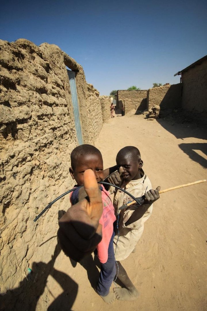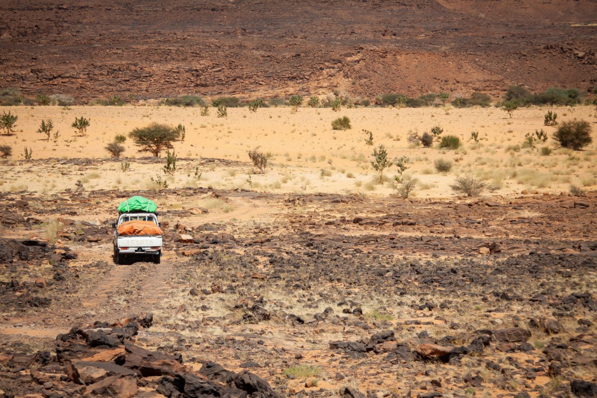 Cesta je k nim nepříjemná, zdlouhavá a náročná, ale stojí za to. Jedeme do končin kousek od hranice se Súdánem, oblasti kde desetiletí operují islamisté Janjaweed, kteří se s lidmi v Dárfúru moc nemažou. V poslední obci Diona nabíráme naftu a jedeme dál. Najednou se za námi řítí Toyota pick up s bazukami, nasazeným samopalem a vojáky na korbě... zastavují nás a vysokým tónem něco řeší s lídrem. Mluví řečí Toubou, tak nerozumíme nikdo nic, ani jeden z řidičů. Vracíme se pro povolení... stálo 150tis středoafrických franků! Ups, to je ranec! Pokračujeme... mezi kamením se válejí zbytky patron občas i nějaká raketa z bazooky. Je ticho, nikde ani živáčka. Mám ztísněný a nepohodlný pocit. Kempujeme v údolí, kde kolem nás procházejí jen kozy a velbloudi, ale je tu závětří, což po tolika větrných dnech je super...