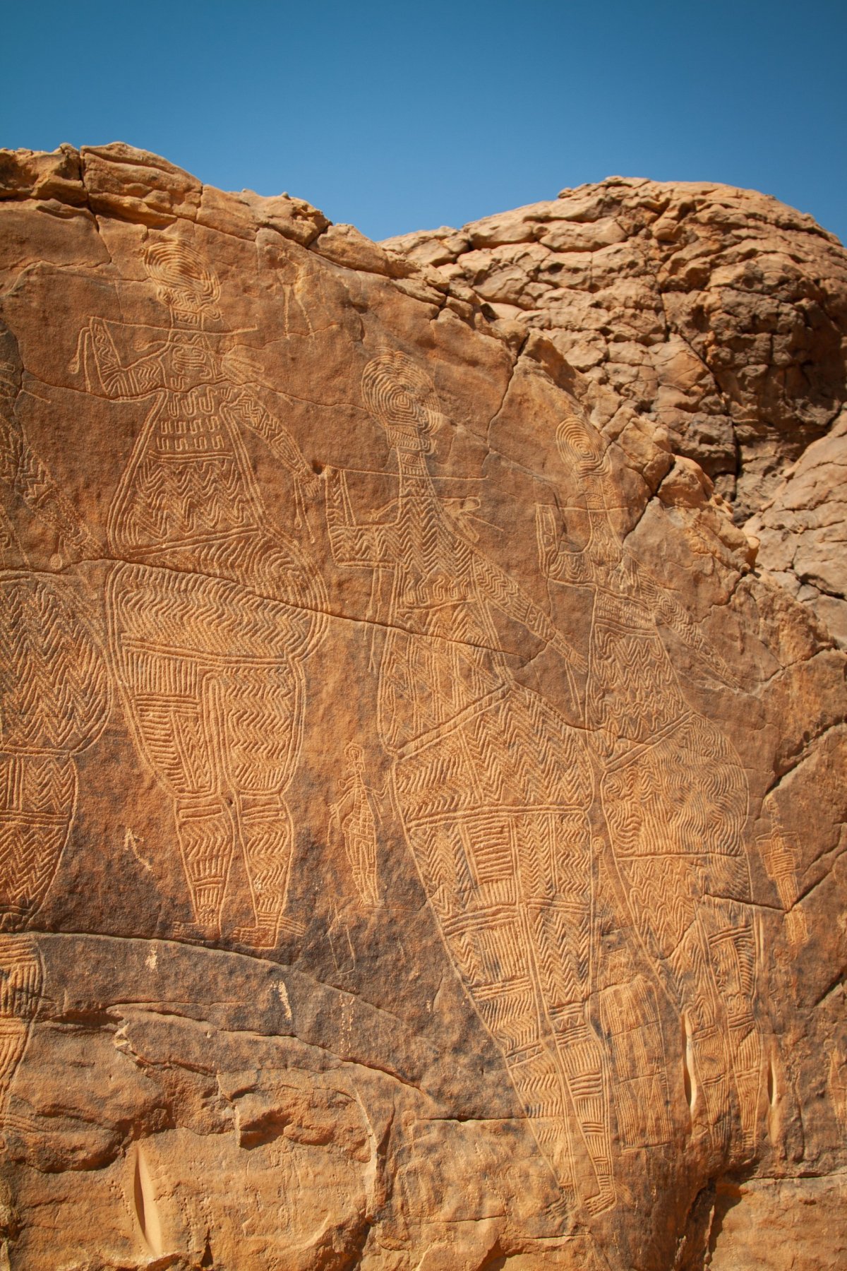 V poušti a nejen tam, prakticky po celé Africe je nespočet skalních převisů, jeskyň a útočišť, kde můžeme nahlédnout do života dávných civilizací. Obrazy vypráví příběhy zdejší krajiny a původních obyvatel a my se z nich dozvídáme, jak Sahara vůbec vypadala několik tisíc let nazpět. Jednotlivé scény promítají život, který lidé v těchto oblastech vedli. Zebry, žirafy, sloni, gepardi, pštrosi a mnoho dalšího, dobytek, ale i velbloudi. Je tu krásně vidět, že to co je dnes nedozírný oceán horkého písku, kamení a skal, bylo kdysi úrodné a zelené. V Čadu jsou dvě velká naleziště v pohoří Tibesti a v Ennedi plateau. Některá z nich se datují 8000let nazpět. Ennedi je spravován jihoafrickými parky a ti se snaží o ochranu a zachování cenných památek.
