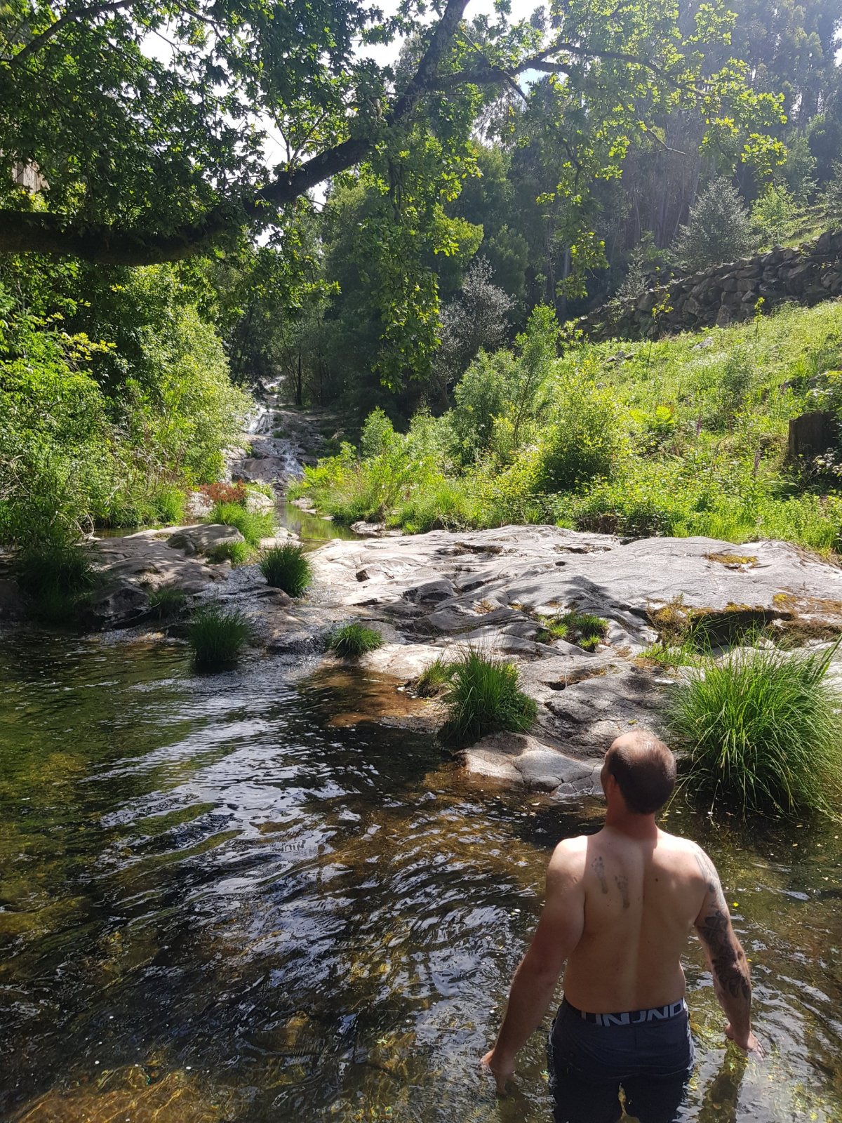Teď už zase po značkách přecházím obří most až do centra města. Tady je to trochu divoký a tak jsem rád, že si dám něco na zub v pekárně a můžu centrum opustit. Do kopce a z kopce, po šutrech a dlažbě, vesničkami, lesem, stezkami, nestezkami. Takhle je to snad 20 kilometrů, trochu mi to připomíná Spartan Ultra. I s pár zastávkami (na fotku, na cígo, na pokec) cesta hezky odsejpá. Až když se mrknu na mobil vidím, že jsou skoro 2, neobědval jsem. Měl bych. Procházím kolem informační mapy a vidím, že jsem blízko Vila de Praia Ancore. Blízko pobřeží i blízko Caminha (to jsem si tak včera říkal, že bych byl rád sem dojít). V hlavě uzrál plán. U nějakého kiosku usedám u cocacoly a wifi a lovím info v mapách. Zakončuji to rezervací hostelu u pláže. Tradá. Skupinky poutníků tu zhoustly a různě se předcházíme. Cca 5 km před dnešním cílem se opět schází do údolí lesem. U krásné bystřiny sedí holka a máčí si hnáty. Přijde mi to jako fajn nápad a přidávám se. Mezi tím co ona si tu chladí obrovský puchejře tak já se koupu a cákám jako malé děcko. Super osvěžení (zpětný edit: spíš super nachlazení). Ze zvyku se ptám jestli můžu nějak pomoct a jestli je vše Ok. Prej dobrý a že jde už jen do Vila Praia...to já taky. Tak se měj. Odchází a já se koupu i s žábama dál. Party i jednotlivce, co jsem od Castelana předbíhal, teď zas v potoku míjejí mě. No nic. Osuším se a zas je určitě chytnu. Taky že jo. Do půl hodiny jsem zas v čele našeho dnešního minipeletonu. To už jsem na dohled oceánu na předměstí Vila Praia. Tentokrát dobrovolně (s úmyslem zkratky) opouštím značení a jdu k silnici a k pumpě. Pozdravím kolegy, kupuji redbull a sunu se k plážové čtvrti. Po patnáctej hodině (7 hodin a cca 30km) už jsem přímo u pláže a na dohled mé rezervaci. Hostel D'avenida. Jaké překvapení, že je plnej poutníků a to včetně holky s vobrovskejma puchejřema. Horní patro palandy v jednom ze tří šestilůžkových pokojů. Jak jinak. Svůj batoh odhazuji v dáli. Beru jen plavky, brejle, sandály a kabelku a přes silnici mažu na pláž. Je to studený jak svině. Hodně lidí se tu na pláži a zahrádkách jen tak sluní. Ve vodě je jen pár místních dětí nebo surfařů. Ale co, osvěžení taky dobrý. Chvíli schnu a užívám prostředí. Pak si jdu přeprat prádelko a dát sprchu. Je skoro sedm, když jdu do bistra vedle hostelu na fish v housce, torfinu a pivo. Západ slunce ozařuje oceán i nás sedíci v okolí pláže, bister a hostelů. Pokojný to čas.