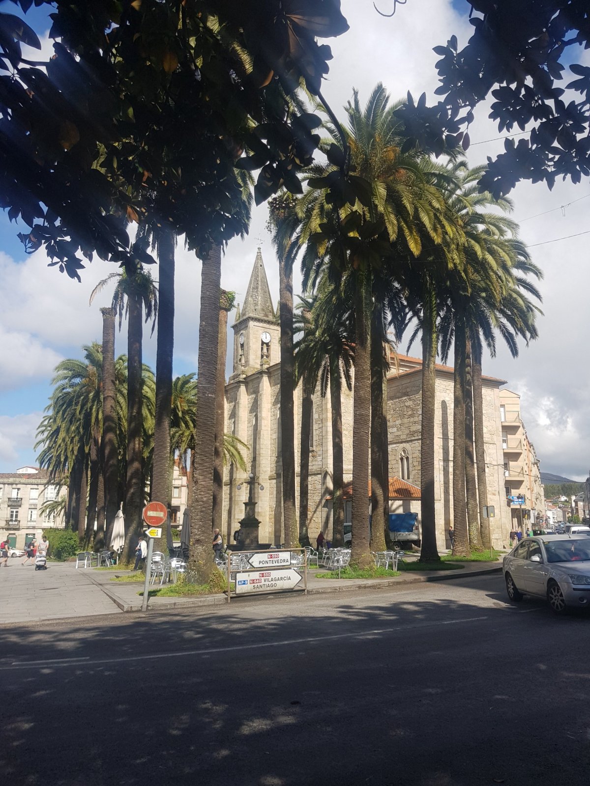 Kromě změny pozdravu z Bom Dia na Buenos Dias (poutníci se dál zdraví stejně - Buen Camino - já už říkám Kinder Bueno) se změnil i čas. Na pražskej - hodina víc. Je tedy po 9 co probíhám historické Tui. Kolem různých katedrál - je neděle - jdu mrknout i na kousek mše. Značení na začátku města (118km) a na konci (116km) je opět dost demotivující. Určitě to bylo tak 5, ale zákrutami. U první kašny v přírodě snídám podruhé. Docházím telefonující osobu. Je to Čech, chvíli kecáme a nechávám ho za sebou až po nepříjemné scéně, kterou obcházíme - sražená poutnice s krví na tváři, zabalená v dece, s hloučkem chaotických lidí kolem. Snad je ok.