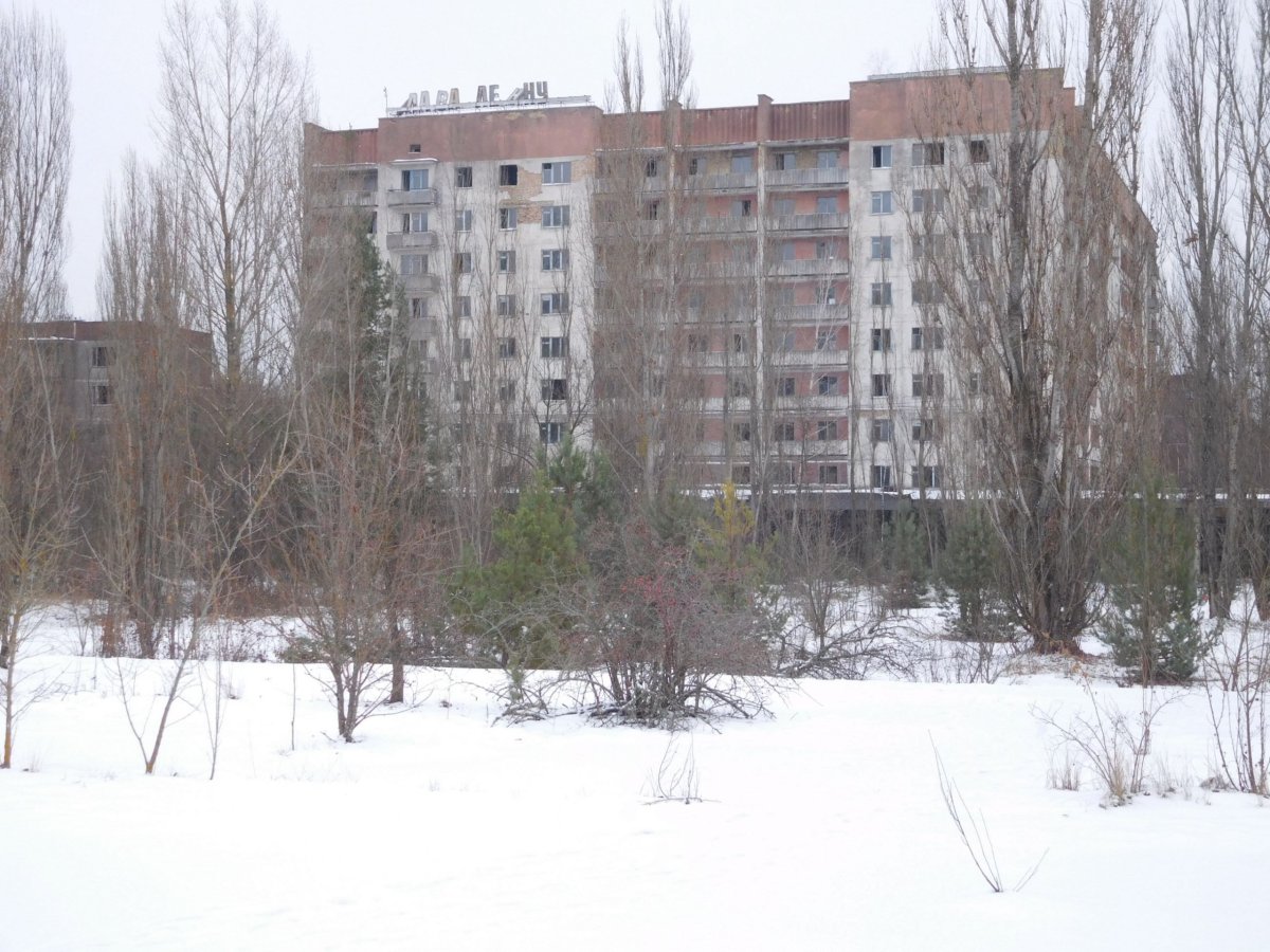 Pak už následuje zlatý hřeb - Pripjať. Vjezd je přes hlídanou závoru po Leninově prospektu 30ti letou alejí. Řidič nás vysazuje před restaurací, ale asi mají sanitární den.