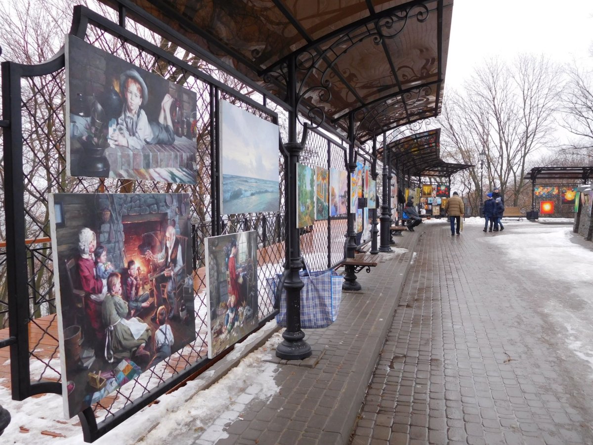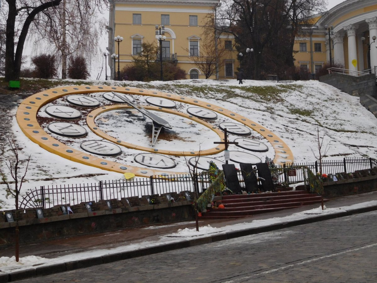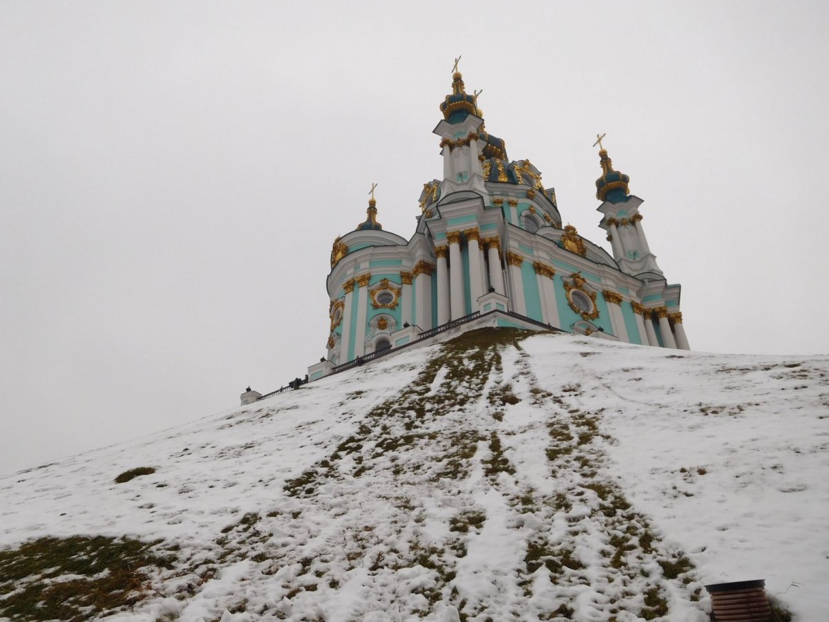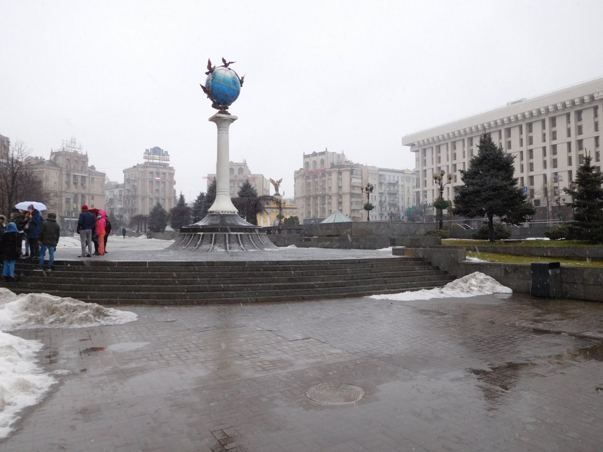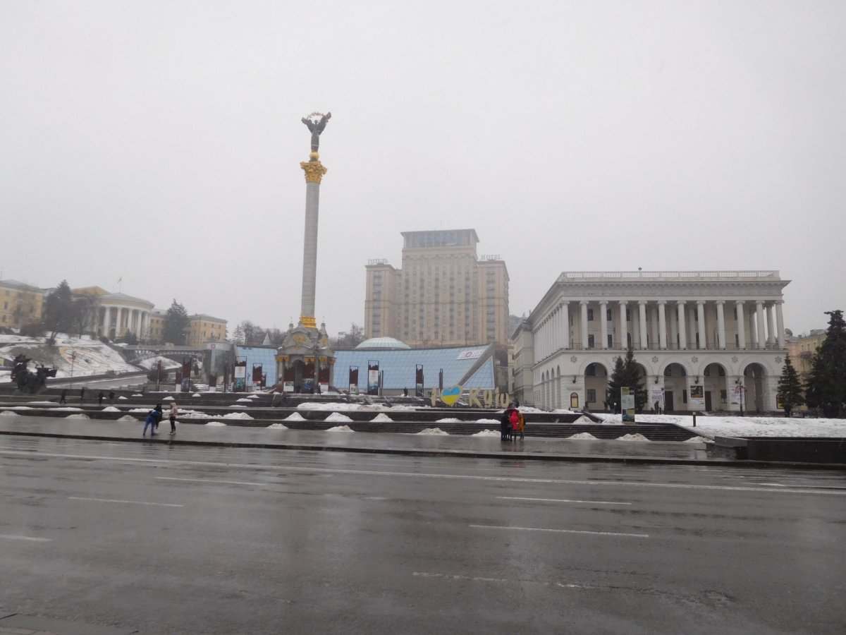 Dost bylo Majdanu, pokračujeme na Poštovní náměstí, odkud jezdí lanovka. Vyjíždíme nahoru a brouzdáme rozměklým sněhem po parku. Mohl by odtud být pěkný výhled na Dněpr, my máme smůlu, přes mlhu toho moc nevidíme.