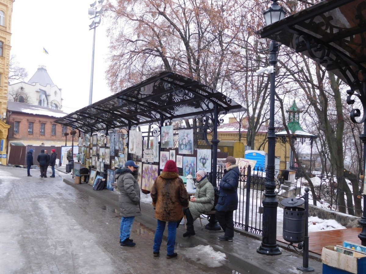 Pokračujeme dolů, i v zimě je tady dost stánků se suvenýry, my se jdeme ohřát do "picérky", dáváme kafe a něco malého na svačinu. O kousek dál je pod chrámem ulice, kde místní umělci vystavují především obrazy.