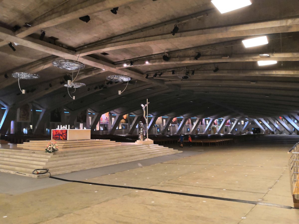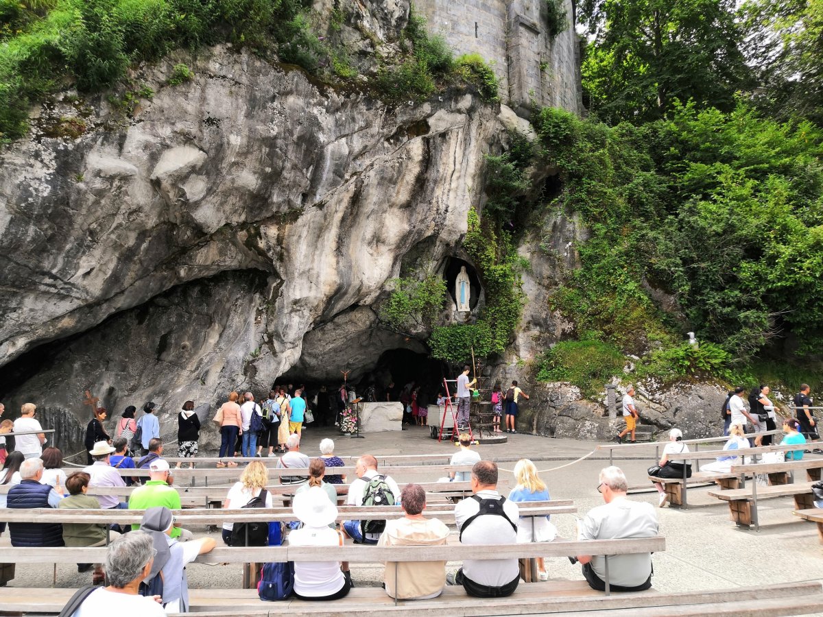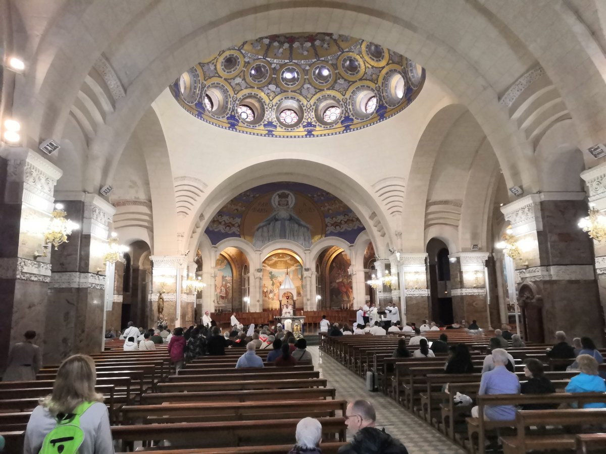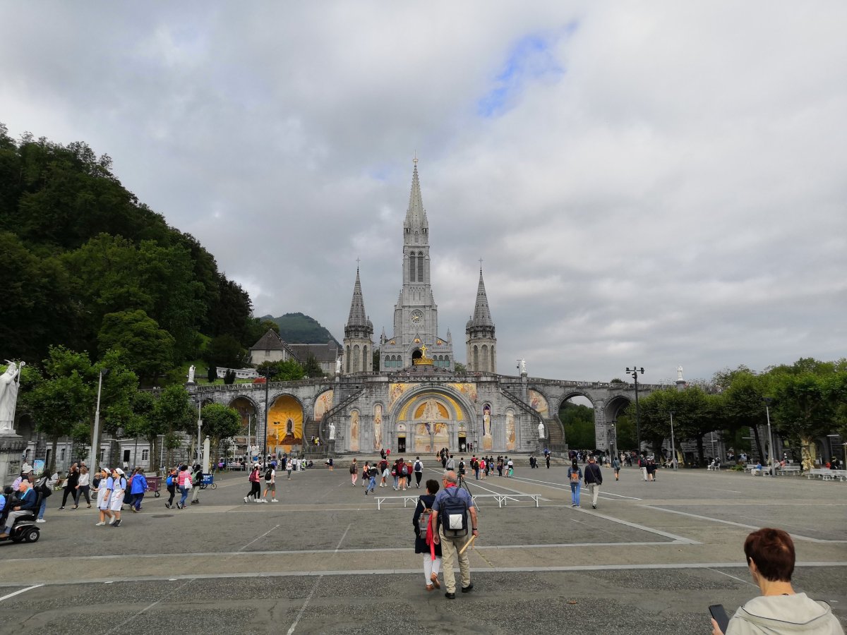Po probuzení do svěžího dne s teplotou lehce přes 20 °C a snídani ve francouzském stylu (bageta a camembert) jsme se vydali k tomu hlavnímu, co Lurdy nabízí - do komplexu u řeky, jemuž vévodí Růžencová bazilika spolu s Bazilikou neposkvrněného početí. Při příchodu do komplexu jsou obě baziliky krásně vidět přes promenádu s trávníkem uprostřed. Lidí bylo v celém areálu, řekl bych, přiměřeně, čekal jsem větší počty a tak jsme se nikde příliš nemačkali nebo neprodírali davy. Pouze při dopolední mši přímo před jeskyní Massabielle, kde mělo ke zjevení dojít, bylo lidí víc, ale ti se po skončení mše rozptýlili a úzký prostor byl opět průchozí. Naše cesta nejprve vedla do moderní oválné podzemní Baziliky sv. Pia X., která může být na první pohled návštěvníkům skryta, jelikož střechu kryje tráva a i vstup je velice nenápadně vyveden. Uvnitř se ovšem nachází impozantní prostor (téměř 200 m dlouhý a přes 60 m široký) lemovaný mnoha betonovými sloupy, s hlavním vyvýšeným oltářem uprostřed a mnoha dřevěnými lavicemi okolo. Po stranách kolem dokola také visí velká vyobrazení různých svatořečených osob od starověku po současnost. Podle popisu se dovnitř vejde až 25 000 lidí.