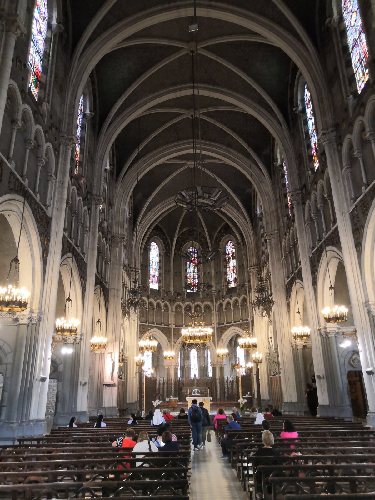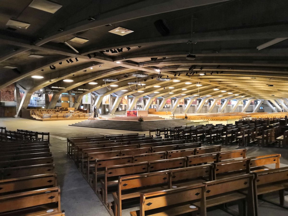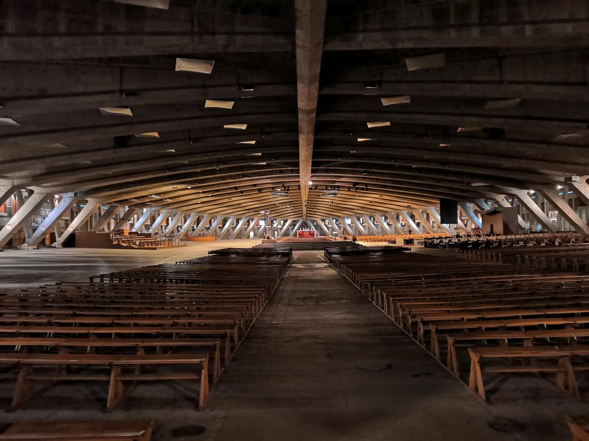 Po probuzení do svěžího dne s teplotou lehce přes 20 °C a snídani ve francouzském stylu (bageta a camembert) jsme se vydali k tomu hlavnímu, co Lurdy nabízí - do komplexu u řeky, jemuž vévodí Růžencová bazilika spolu s Bazilikou neposkvrněného početí. Při příchodu do komplexu jsou obě baziliky krásně vidět přes promenádu s trávníkem uprostřed. Lidí bylo v celém areálu, řekl bych, přiměřeně, čekal jsem větší počty a tak jsme se nikde příliš nemačkali nebo neprodírali davy. Pouze při dopolední mši přímo před jeskyní Massabielle, kde mělo ke zjevení dojít, bylo lidí víc, ale ti se po skončení mše rozptýlili a úzký prostor byl opět průchozí. Naše cesta nejprve vedla do moderní oválné podzemní Baziliky sv. Pia X., která může být na první pohled návštěvníkům skryta, jelikož střechu kryje tráva a i vstup je velice nenápadně vyveden. Uvnitř se ovšem nachází impozantní prostor (téměř 200 m dlouhý a přes 60 m široký) lemovaný mnoha betonovými sloupy, s hlavním vyvýšeným oltářem uprostřed a mnoha dřevěnými lavicemi okolo. Po stranách kolem dokola také visí velká vyobrazení různých svatořečených osob od starověku po současnost. Podle popisu se dovnitř vejde až 25 000 lidí.