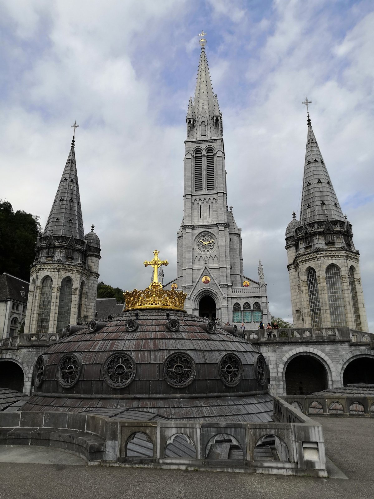 Dalším místem k zastavení už byla samotná Růžencová bazilika s krásným zdobeným vstupem, velkým zlatým křížem na vrcholku kopule a schodišti z obou stran, vedoucími k horní bazilice. Před ní je velký kruhový prostor s velkou sochou Panny Marie a který lemují dvě podkovovité cesty, opět vedoucí nahoru. Venku nalevo u vstupu zrovna probíhaly přímluvy s anglicky mluvícím farářem, ovšem my jsme pokračovali přímo dovnitř. I uvnitř byla mše, tentokrát již francouzská, ale jelikož ani já, ani babička francouzsky nemluvíme, obdivovali jsme spíše výzdobu interiéru. Tomu vévodí zejména vyobrazení Panny Marie na kopuli nad oltářem. Novogotická Bazilika neposkvrněného početí, stojící nad Růžencovou bazilikou, již svým vzhledem a uspořádáním více připomíná klasický kostel. Vnitřní výzdoba je sice prostší, ovšem bazilika to dohání svou velikostí. Zde se babička zúčastnila pro změnu mše italské, ovšem po jejím skončení a konstatování, že "farář měl kázání snad půl hodiny a zbytek mše pak už projel jak z rychlíku" jsme se radši vydali podél baziliky k již zmiňované jeskyni Massabielle, kde se podle všeho roku 1858 měla mladé dívce Bernadettě zjevit Panna Maria a odhalit jí mimo jiné i léčebné účinky místních pramenů. Hned za jeskyní jsou pak již kohoutky s vyvěrající vodou, kterou je možné se osvěžit či si ji napustit do láhve. Součástí jsou i kryté vnitřní prostory, kde je možné se ve vodě vykoupat.