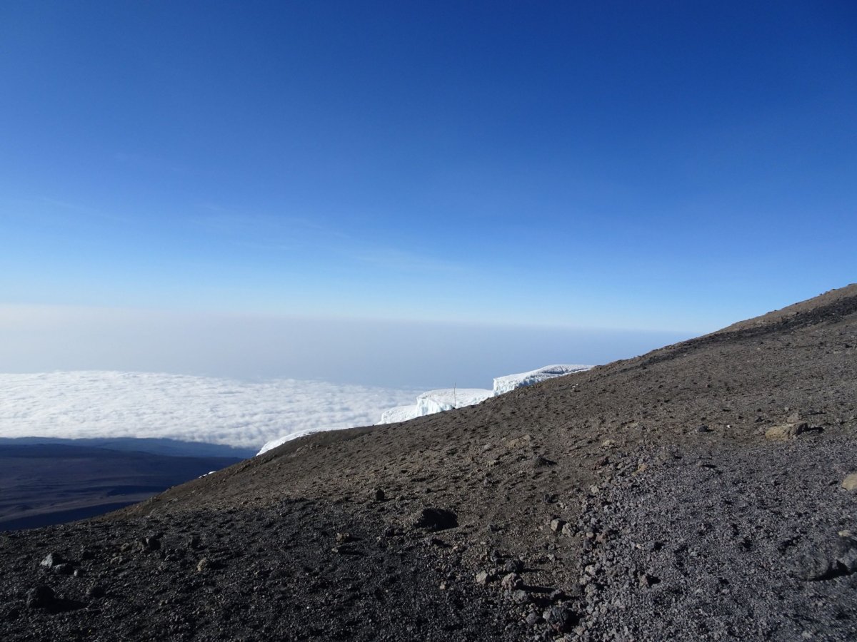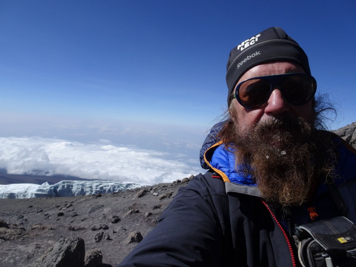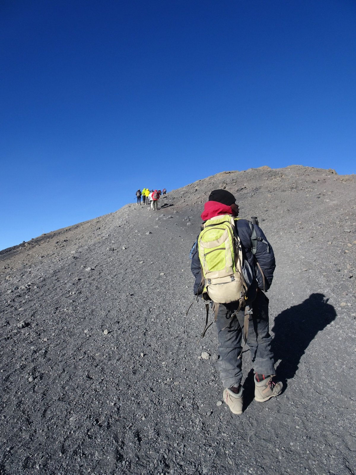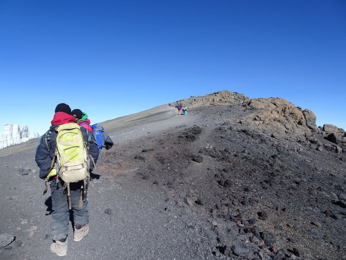 Přesně o půlnoci začala poslední, ta nejnáročnější část cesty k vrcholu Kilimandžára. Foukal poměrně svěží vítr, teplota - 12 stupňů Celsia, čelovka rozsvícena a jde se na věc. Čeká nás strmý svah se sypkým povrchem, kde dva kroky nahoru tvoří v součtu jeden, jelikož v sypkém povrchu dochází ke skluzu. V 5000m již je znát vliv řídkého vzduchu a plíce zahájí dvojnásobnou frekvenci dýchání. S rostoucí nadmořskou výškou klesá i teplota ovzduší na - 15 stupňů. Jdeme, jak nabádá průvodce, polepole. Byl to opravdu ten nejtěžší úsek cesty a to právě mezi Barafu Campem a Stella Pointem. 4,3 km jsme šli 7 hodin a 30 minut. Od vrcholu nás už dělila jen hodina cesty. Za Stella Pointem, který je na hraně kráteru se sklon stoupání zmírnil. V 8,30 jsme byli konečně na samém vrcholu Kilimandžára, kde už se začali hromadit ti, co to zvládli. Měl jsem velkou radost, že k nim taky patřím. 20. září roku 2019 bude od teď patřit k významným dnům mého života. Po půl hodině potřebné k focení a taky trochu odpočinku nastala další značně obtížná část cesty a tím byl osmihodinový sestup.