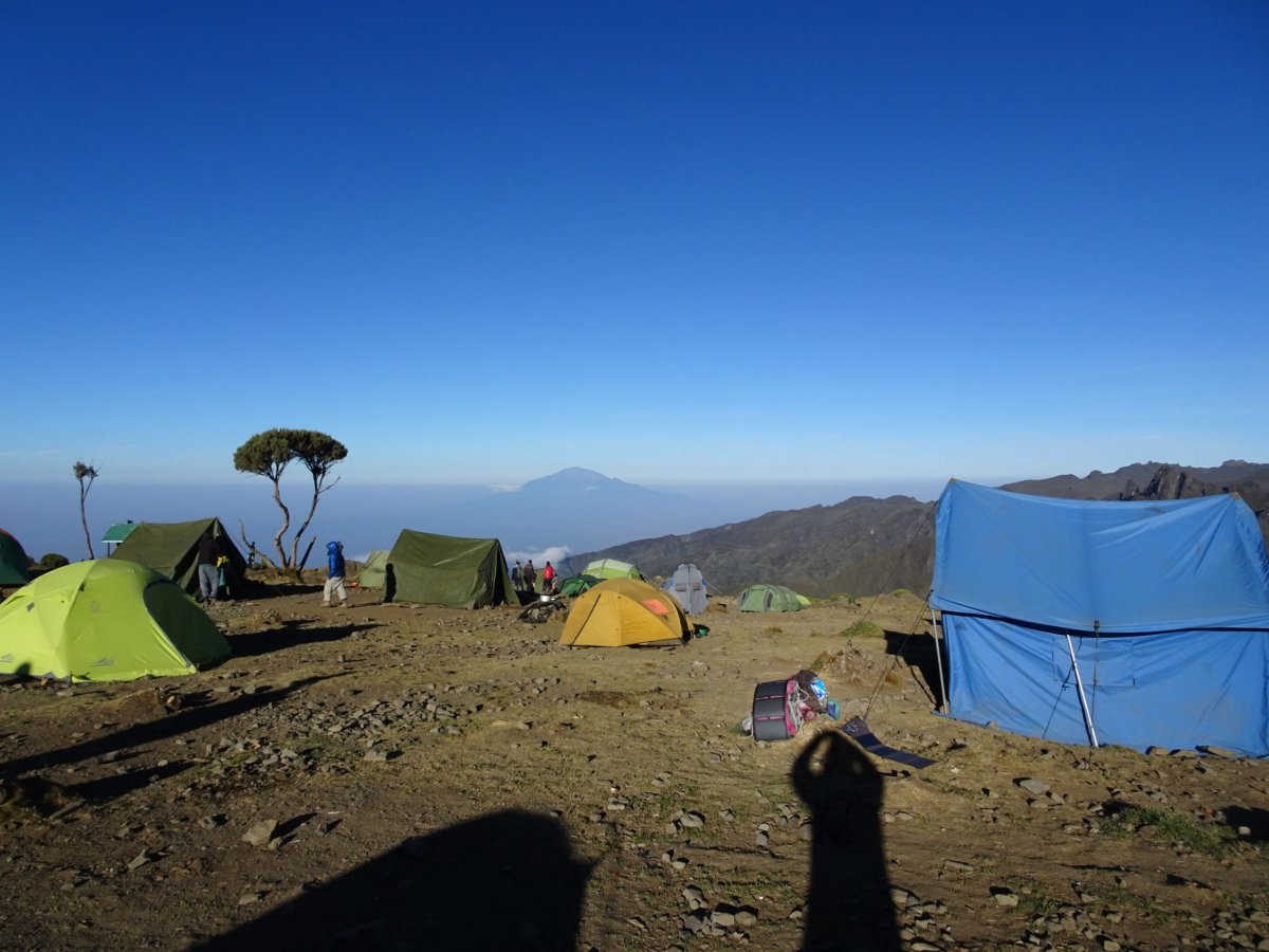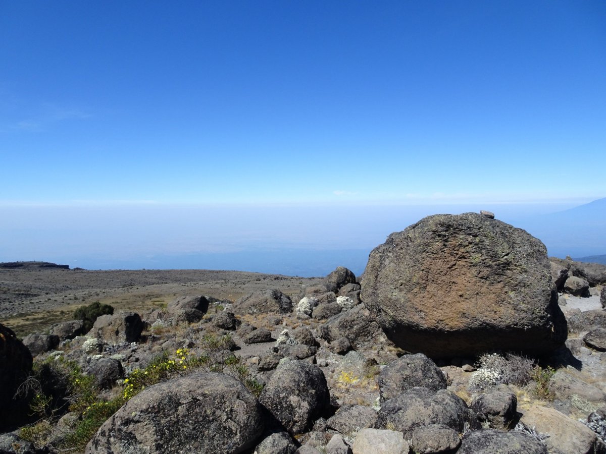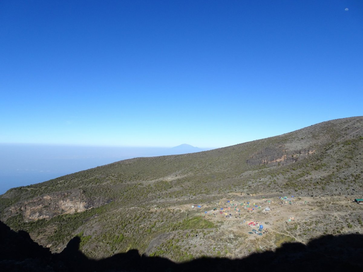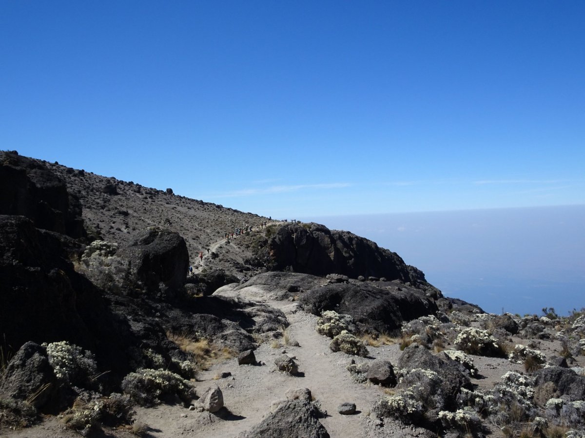 V Shira Cave Campu jsme prošli kolem jeskyně a provedli první aklimatizační výstup do 3900 m . Po návratu do kempu večeře a první usínání nad mraky. Ráno jsme se probudili do nádhernýho počasí s azurovou oblohou. Je třeba jít však dál, začíná třetí den ještě stále pohodového treku. Rostlin už pomalu ubývá a za chvíli půjdeme kamenitou krajinou bez vegetace.