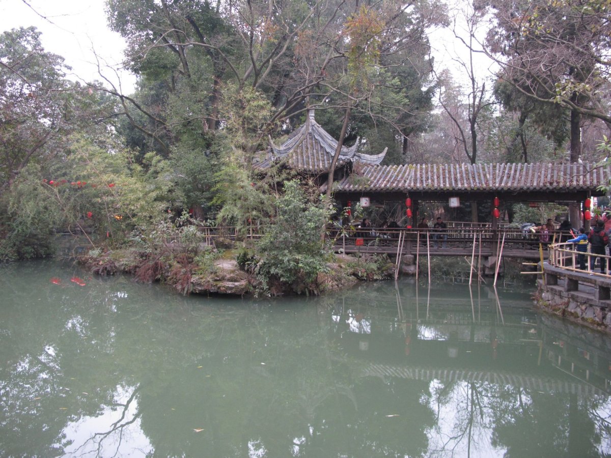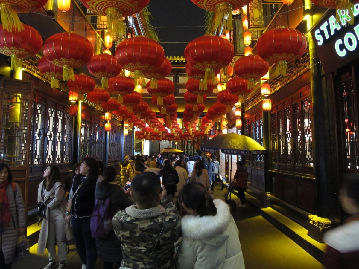 Den 1: Ráno vystupuji po letu z Prahy v Chengdu (Čcheng-tu), správním středisku provincie Sichuan (S'-čchuan), kde na mě čeká dcera :-). Sichuan je proslulý pikantním jídlem. Mohu potvrdit, např. drcené velmi pálivé chilli papričky jsou zcela běžným kořením. Město má podle různých údajů asi 10-15 mil. obyvatel. Náš hostel (byl super a v recepci všichni mluvili dobře anglicky, což je v Číně jev ne zrovna obvyklý) ležel 10 minut chůze od stanice metra na náměstí Tianfu (Tchien-fu). To je hlavní a největší náměstí v Chengdu. Dohlíží na něj kromě mnoha policistů také obří předseda Mao. Jeho socha ostatně dohlíží na spoustu náměstí. Mao je mj. i na bankovkách všech hodnot. Po ubytování jsme vyrazili do blízkého People's Parku a z něj do sítě pěších zón Wide and Narrow Street, vzniklých ze starých ulic. Dnes jsou tam vesměs drahé obchody, čajovny, restaurace. Je to „must see“, i když jiná podobná místa mě pak oslovila mnohem víc. Večer jsme prošli Jinli (Ťin-li) - starou ulici s řadou obchodů, restaurací, stánků a spoustou turistů. Všude svítily nebo byly teprve rozvěšovány červené lampióny - blížil se 5. 2. 2019, tedy začátek lunárního nového roku. Únava po cestě a jet lag mě pak v hostelu rychle uspaly.