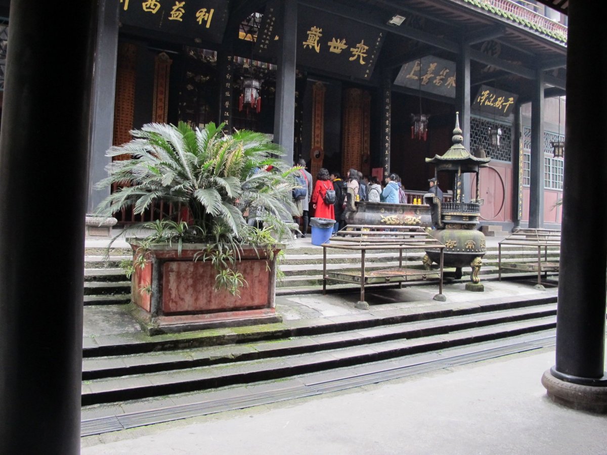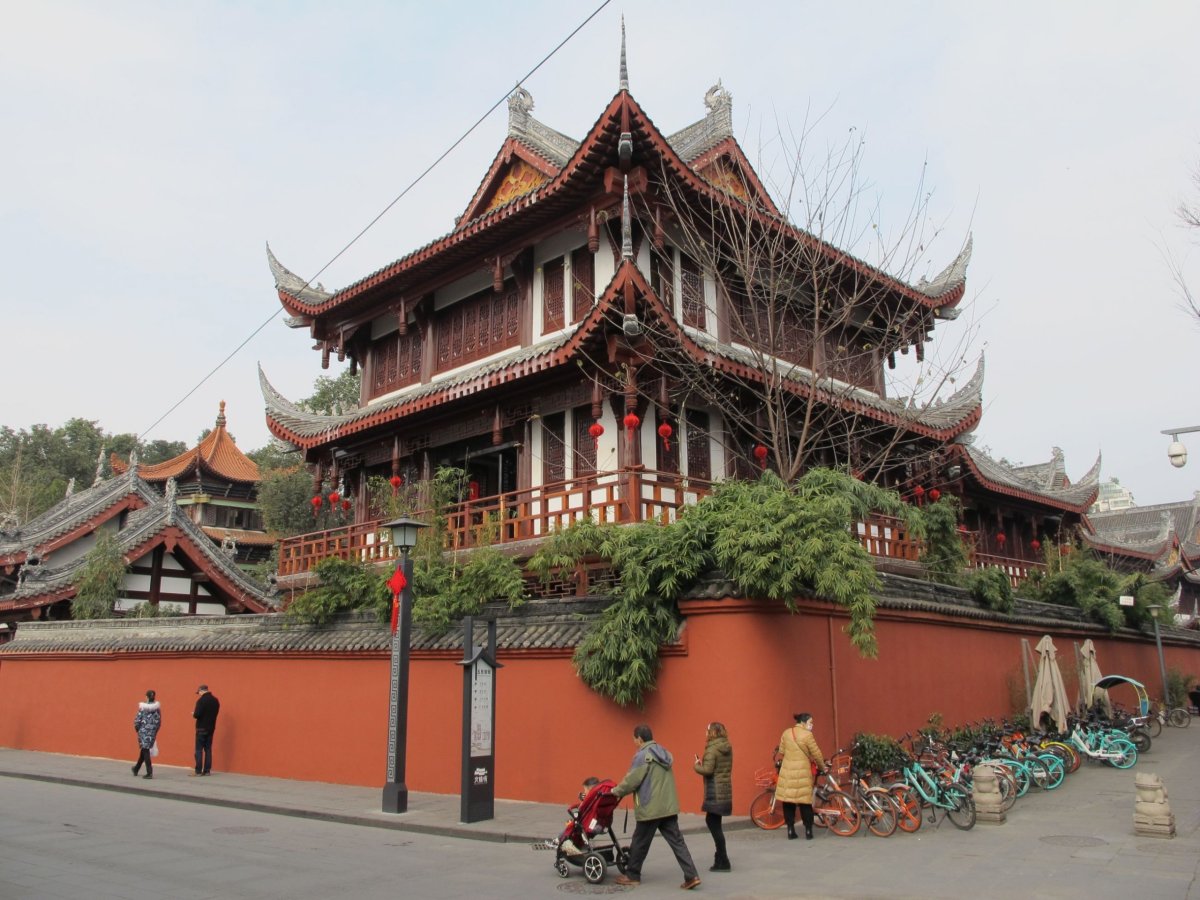 Den 2: Na okraji Chengdu leží světoznámá chovná stanice s desítkami pand velkých a pand červených (vstupné 55 yuanů). Pandy většinu času tráví pojídáním bambusových výhonků a spánkem. Vhodná doba návštěvy je brzy po ránu, kdy jsou nejaktivnější. Pandy jsou super, odcházíme až kolem poledne. Míříme do Wenshu (Wen-šu) Monastery, což je krásný, v Chengdu největší a nejlépe zachovaný buddhistický chrám s počátky v 7. století. Večer jdeme na Chunxi (Čchun-si) Road, supermoderní pěší zónu s nepřeberným množstvím vesměs luxusních obchodů.