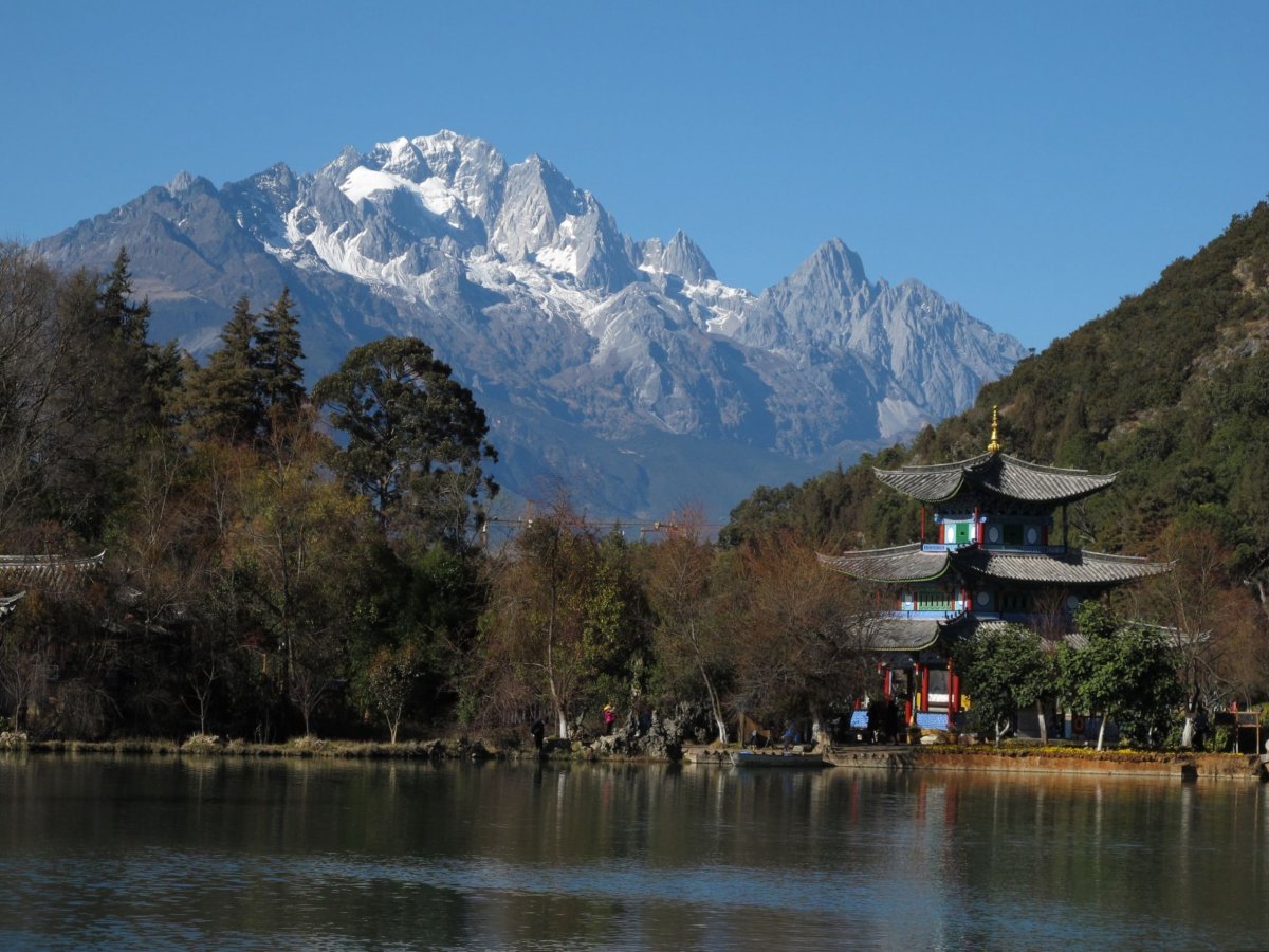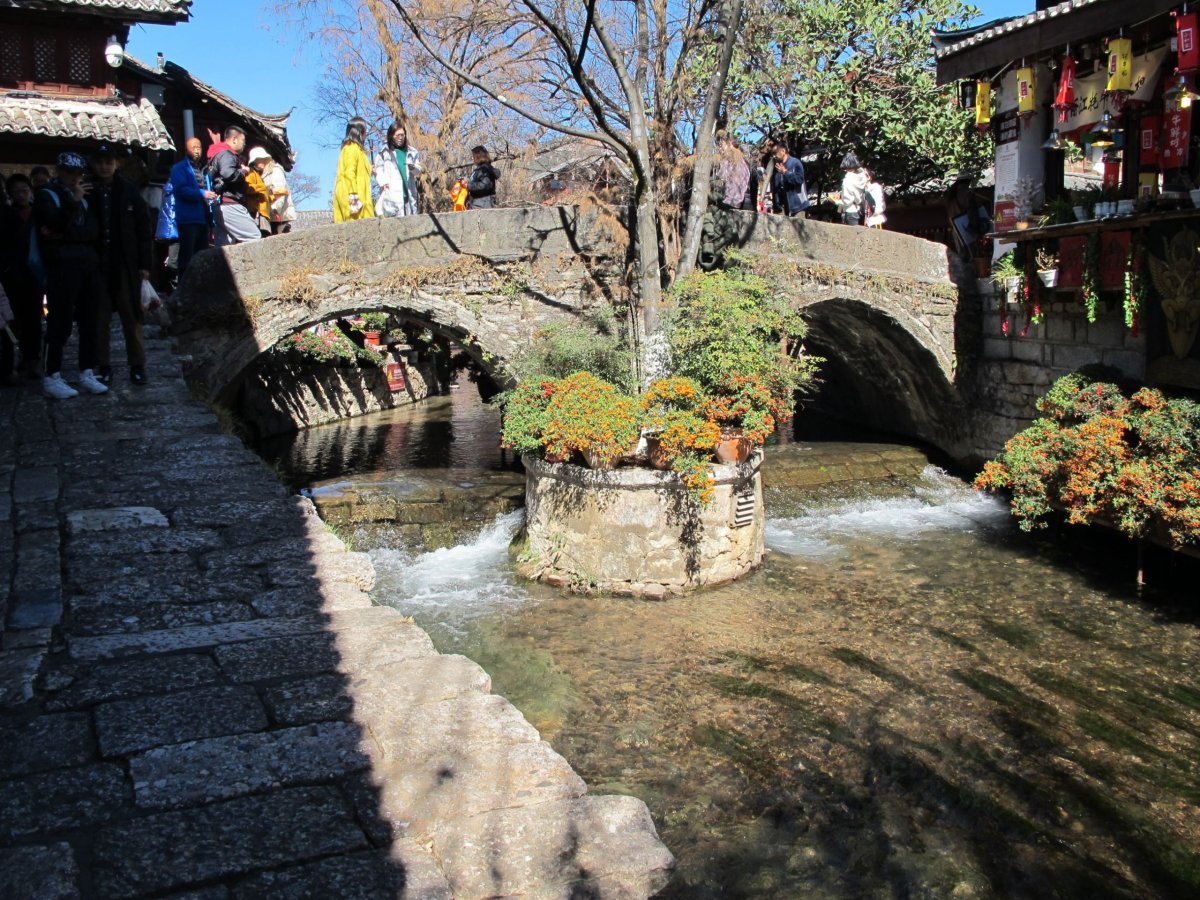 Den 5: Ve 3 ráno jsme v hotelu. Pokoj se dost výrazně liší od popisu na Bookingu. Výhled do zdi místo do zahrady, plesnivý závěs v koupelně. Snažíme se to průběžně trochu řešit, ale když nám ve finále nabízí přestěhování, necháváme to už být. Na zbývající 2 noci se nám stěhovat už nechce. Jako omluvu nám dali 2 dl láhev 5% sladkého borůvkového "vína" :-D. Celý den procházíme křížem krážem staré město a park v Lijiangu. Staré město je rozsáhlá spleť uliček s historickými dřevěnými domy. Jeho počátky sahají více než 800 let zpátky. Dnes jsou domy proměněny vesměs na čajovny, hospody, jídelny, hotely. Je tu spousta vodních kanálů a tím pádem i množství kamenných a dřevěných můstků. A spousta květin. A taky turistů. Staré město je kouzelné; je právem zapsáno v seznamu UNESCO. Park je krásný, s několika jezírky, mosty, pagodami, velkým bonusem parku byla minimální přítomnost turistů. V Lijiangu a okolí žije mj. minorita Naxi (Na-si). Město leží v nadmořské výšce 2400 m. Přírodní dominantou je nedaleký horský masiv Yulong Xueshan (Jü-lung Süe-šan), anglicky Jade Dragon Snow Mountain. Vrchol se tyčí bez pár metrů do výšky 5600 m.