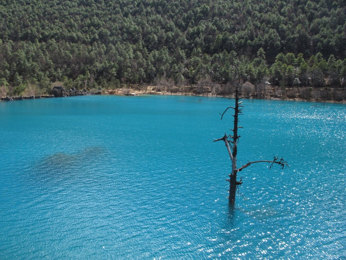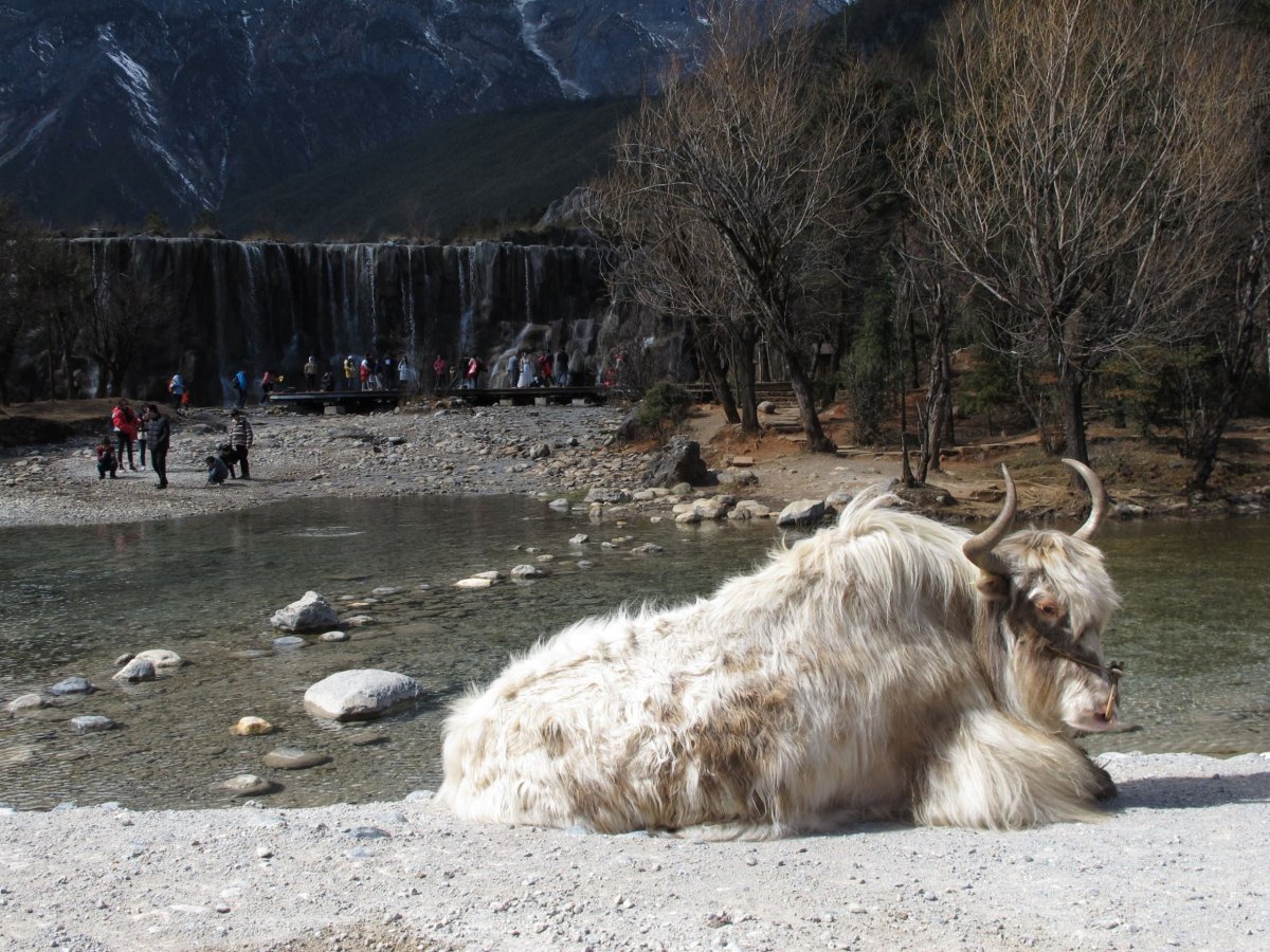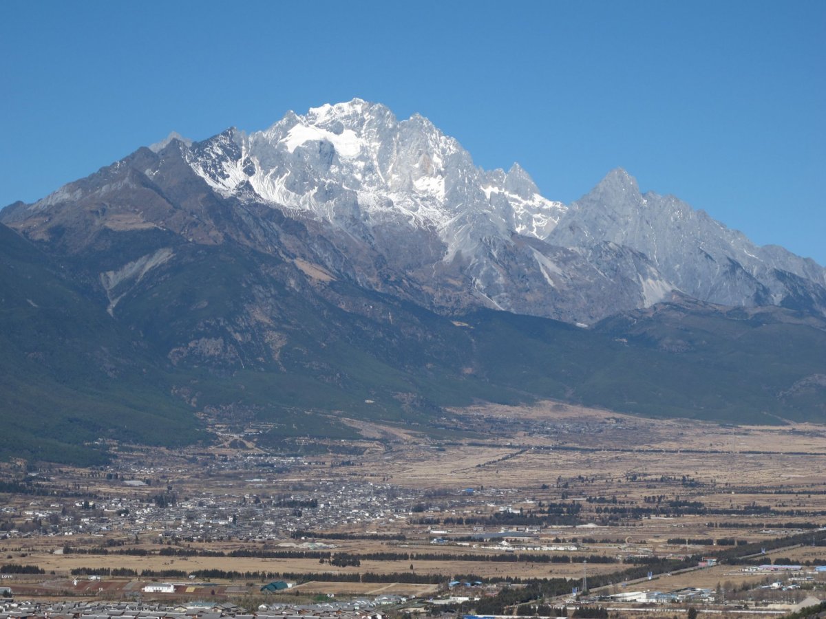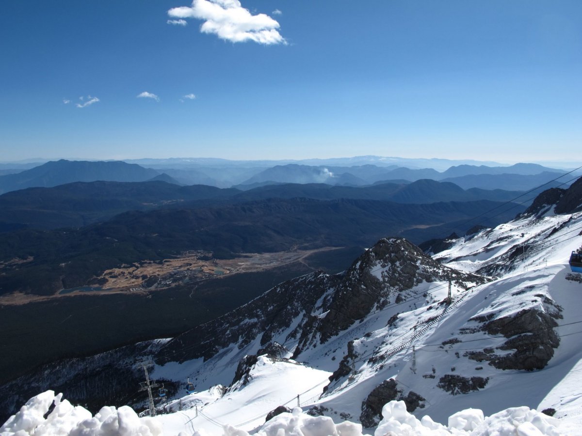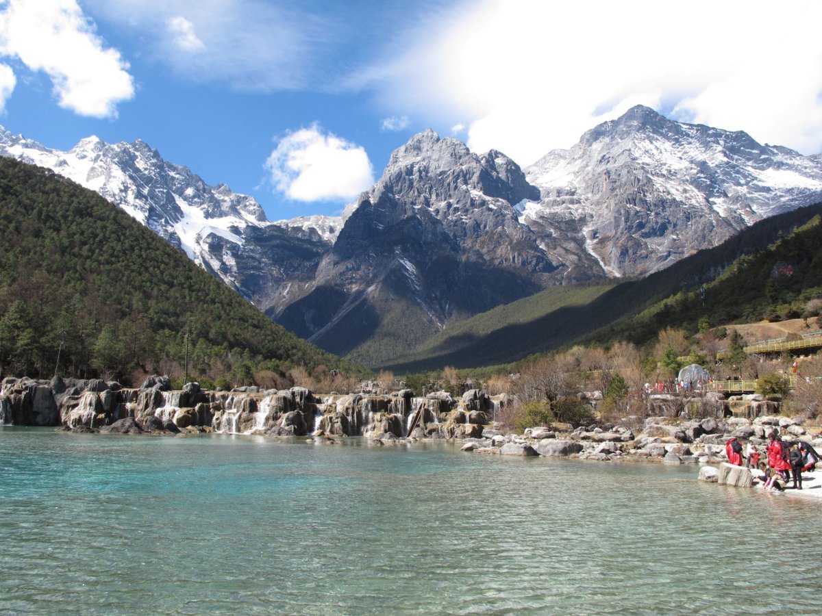 Den 7: Brzy ráno vyrážíme s cestovkou (bez ní by bylo extrémně složité, ne-li nemožné, to za den vše stihnout a zorganizovat) na celodenní výlet na Jade Dragon Snow Mountain. V ceně asi 700 yuanů na osobu je mimo dopravy mikrobusem, lanovky, oběda a vstupů i teplá bunda a láhev kyslíku. Vyjeli jsme lanovkou do 4506 m a pak šli na vyhlídku s kótou 4680 m. Bez kyslíku bych tu cestu asi neudýchal a neušel. Zdaleka ne sám - každý druhý šel co noha nohu mine a často odpočíval v sedě na schodech nebo na lavičkách a co chvíli si pomáhal kyslíkem. Bez aklimatizace je to zkrátka těžké. Výhledy jsou úžasné. Pak ještě návštěva Blue Moon Valley, což je krásně modrá řeka s několika jezírky a menšími vodopády a se zasněženými vrcholky hor v pozadí.