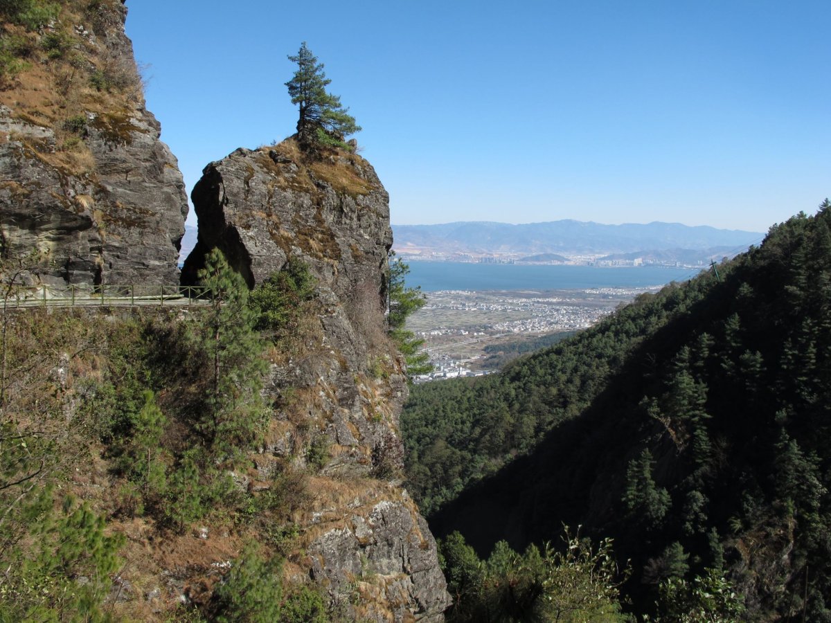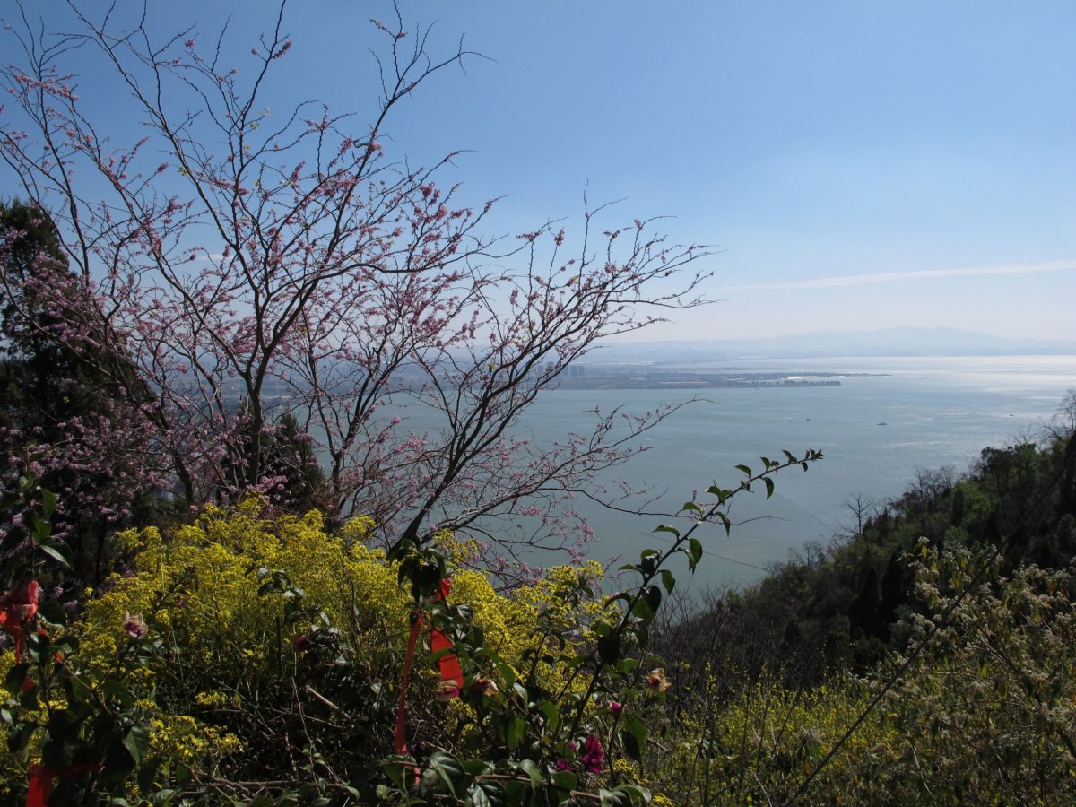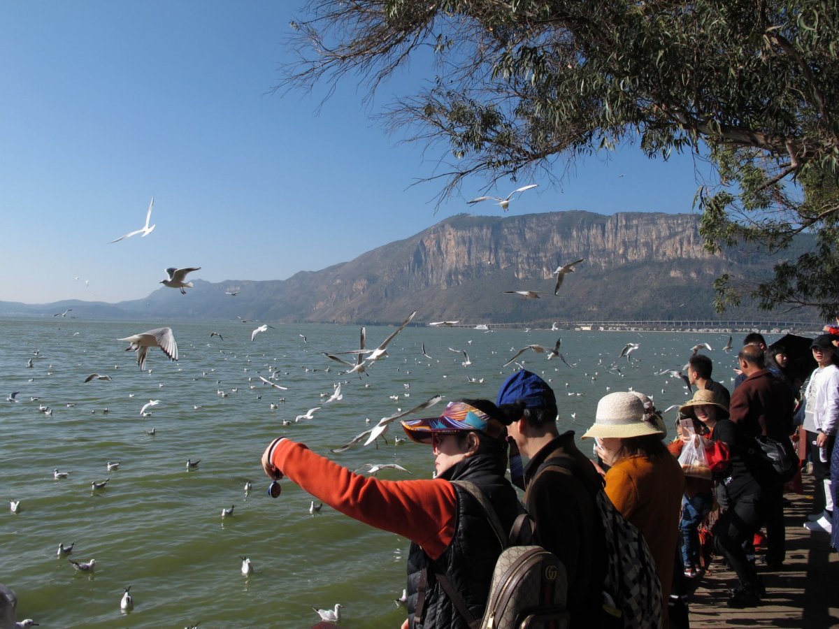 Den 21: Jedeme na okraj Kunmingu k jezeru Dianchi (Tien-čch'). Atrakcí je tam krmení tisíců racků, připadal jsem si trochu jako v Hitchcockových Ptácích. Jezero o ploše asi 300 km2 je oblíbené výletní místo. Kvůli zničení okolních mokřadů v období velkých skoků a kvůli dřívějšímu vypouštění odpadů je voda v něm nejen nepitná, ale i nepoužitelná pro průmysl a zemědělství. V posledních letech se jej snaží vyčistit a zachránit, ale zatím ne moc úspěšně. Od jezera jedeme lanovkou, která asi kilometr vede vodorovně přímo nad jezerem, než se zvedne k nedalekým kopečkům Western Hills. Z nich podnikáme pěší výlet do buddhistických chrámů Taihua (Tchaj-chua) a Huating (Chua-tching).
