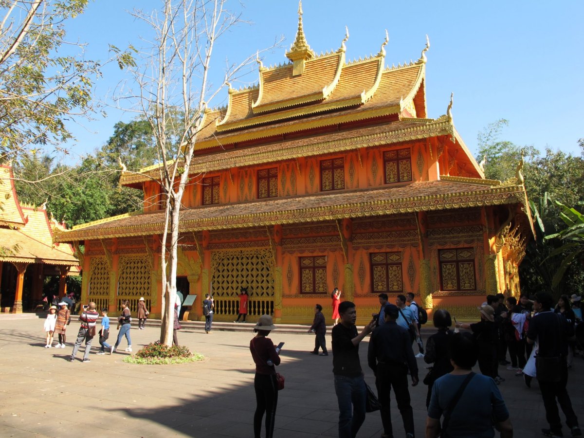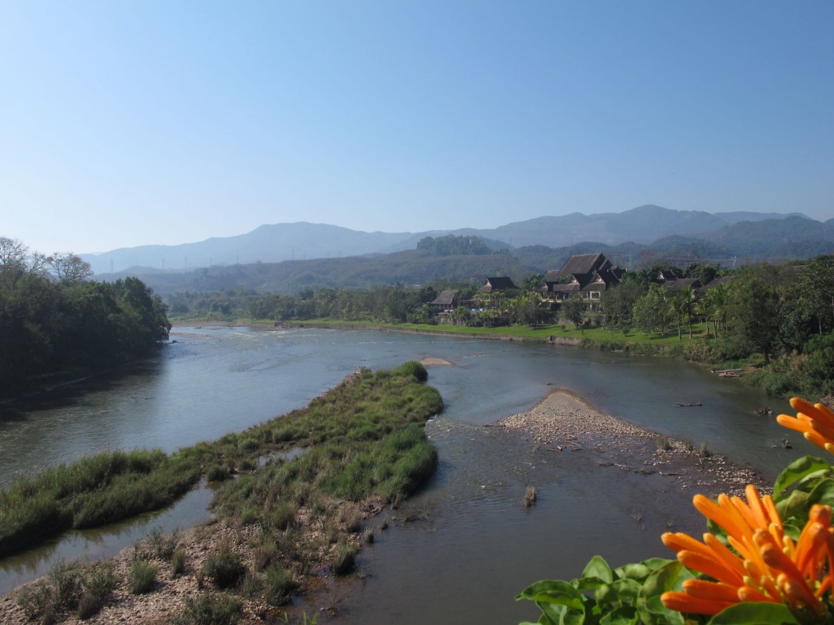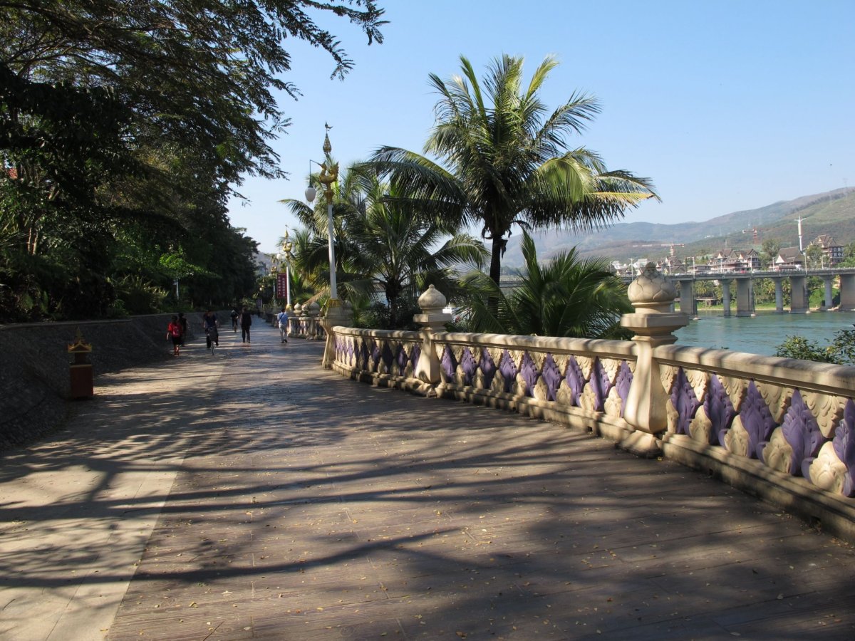 Den 13: Procházka městem, parky, pak míříme k nábřeží Mekongu. Chceme k němu jet ze vzdáleného konce Jinghongu městským busem - je vedro a jsme uchození. Čekáme dlouho a marně na zastávce, čekají i místní, až nakonec dvě slečny nevydrží a volají si taxi. Pozvaly do něj i nás; po nějaké chvíli vystupujeme pár set metrů od nábřeží. Peníze od nás za shared taxi odmítají přijmout. Byli jsme jejich hosty. Na nábřeží se s námi dali do řeči tři sourozenci, dali by se zjevně i jejich rodiče, jenže neovládají angličtinu. Byli všichni moc milí, dali nám na osvěžení ananasy, zajímali se, odkud jsme, kam jedeme atd. Byl pro ně svátek mluvit s cizinci anglicky a vyfotit se s nimi (ostatně jako ve většině míst, kde jsme byli). Pak jsme smočili nohy v Mekongu. Docela teplý, někteří se v něm čvachtali, plavec tam byl jen jeden - proud je silný a řeka docela široká. Večer jsme v hotelu byli pozvaní na tradiční čajový obřad - zajímavý a čaje výborné.