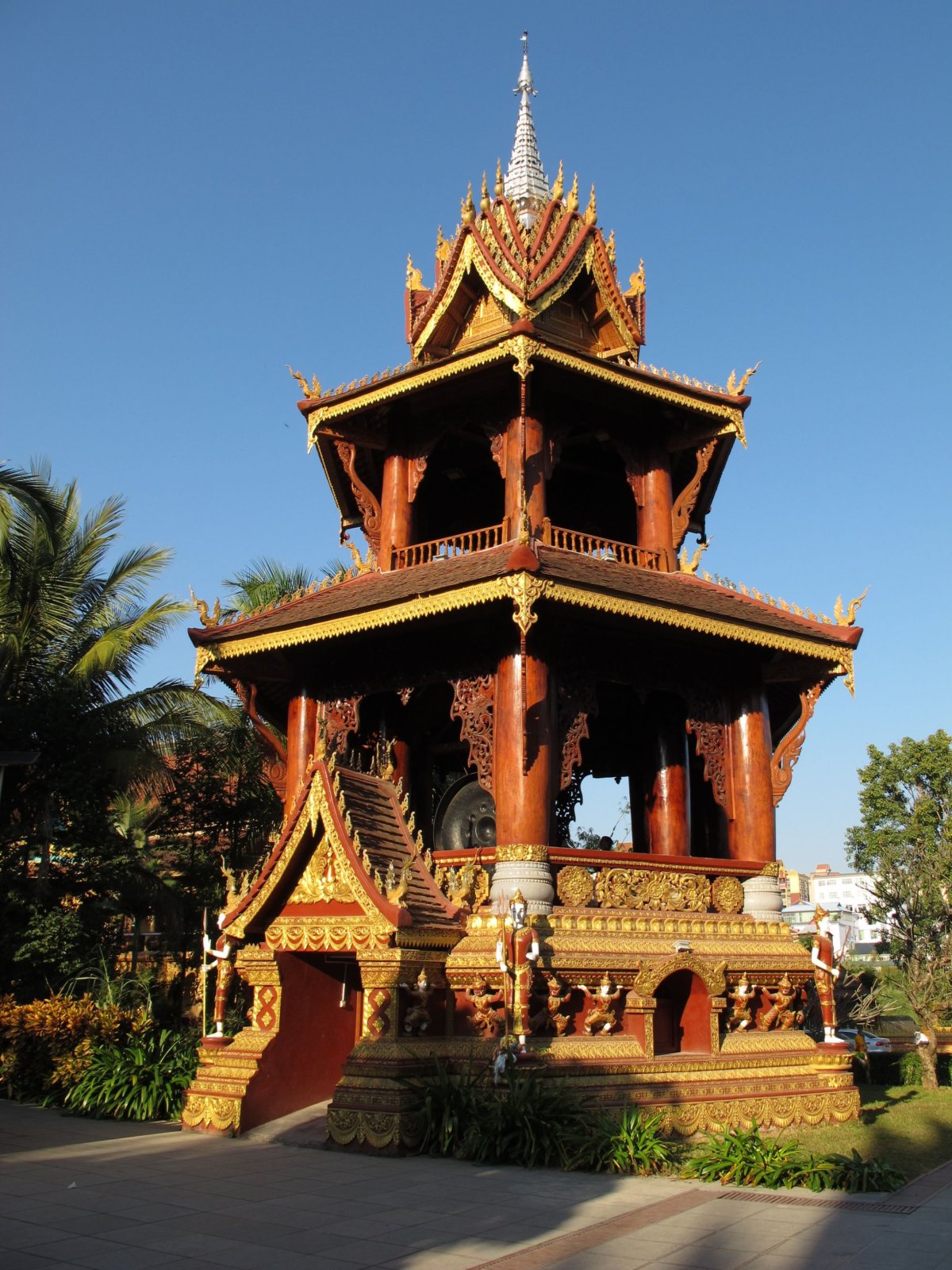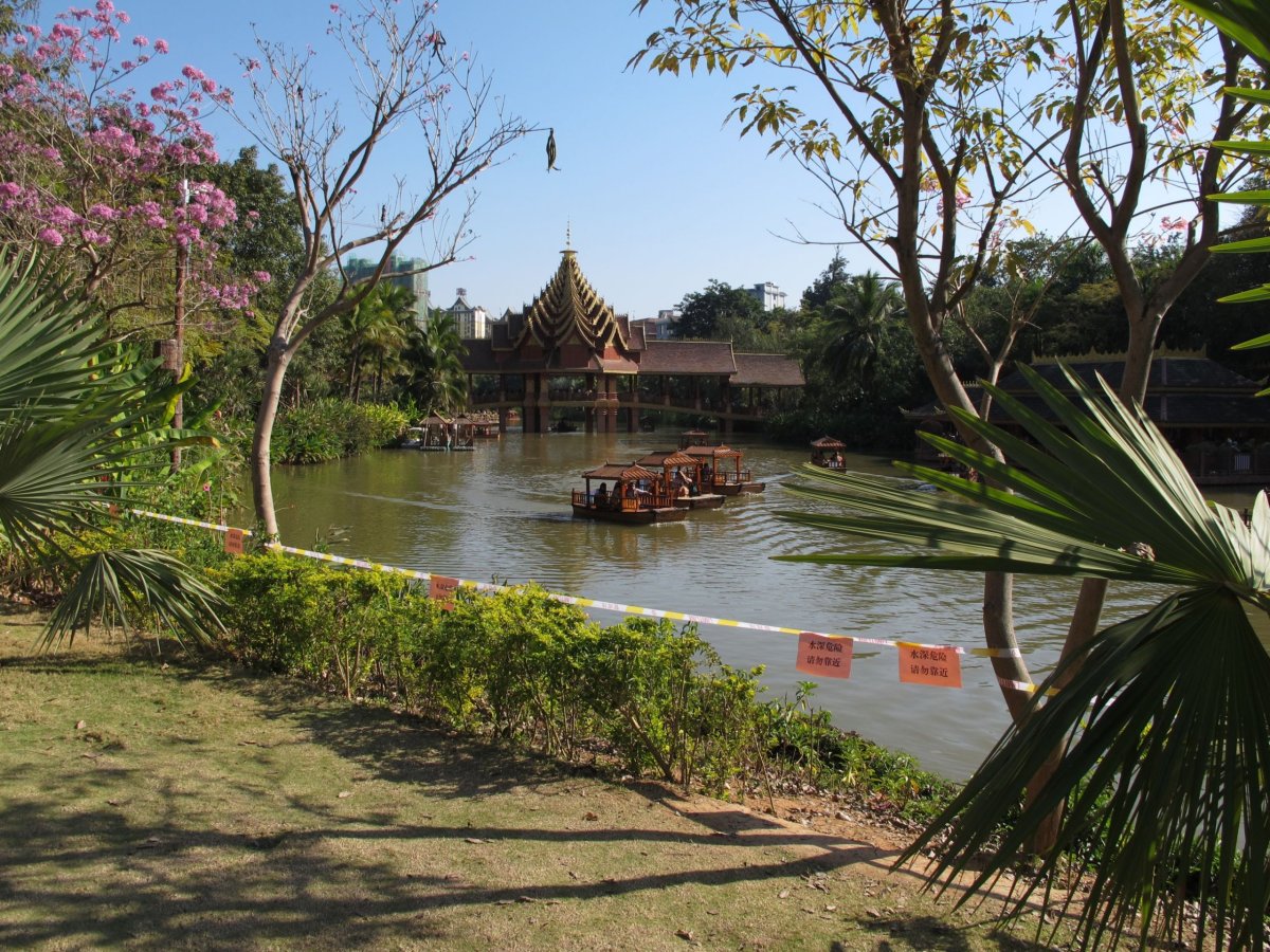Den 12: Po asi hodině letu na jih (druhou možností bylo 15 hodin cesty lůžkovým autobusem) přistáváme ve městě Jinghong (Ťing-chung), správním středisku autonomní oblasti Xishuangbanna (Si-šuang-pan-na). Je to tropická monzunová oblast, která leží jižně od Obratníku raka. K hranicím Barmy, Laosu a Vietnamu je to pár desítek km. V zimě je zde teplo a sucho, v létě větší teplo a deštivo. Žije zde mj. národnost Dai (Taj). Až k hotelu nás dovezli svým půjčeným autem po marném čekání na městský autobus ochotní čínští turisté. Ubytování a procházka do tropického parku Manting (Man-tching). Vstupné 40 yuanů, spousty lidí, palmy, jiná architektura chrámů, zkrátka jiná Čína. Historie parku je stará přes 1300 let. Přes den je 30 °C, v noci 16 °C. Večer procházka k jedné z nejdelších a nejvýznamnějších světových řek, k Mekongu, čínsky Lancang (Lan-cchang). Kolem Mekongu je promenáda s palmami, květinami, poblíž je spousta barů, uliček s jídlem, ovocem. Všechno žije dlouho do noci.