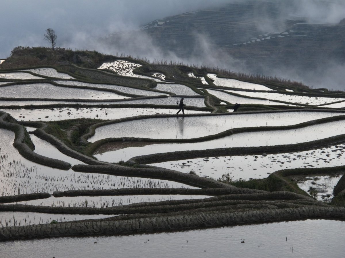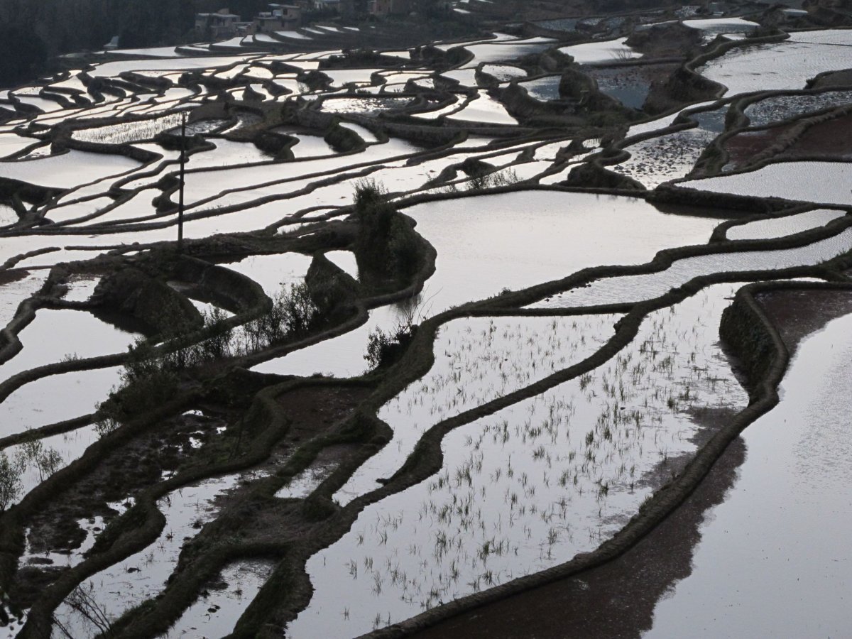 Den 16: V poledne opouštíme busem Jinghong, míříme do oblasti Yuanyang (Jüan-jang). Po 8,5 hod. v buse a 1,5 hod. v taxíku přijíždíme pozdě večer do hostelu ve vesničce Pugao Laozhai (Pchu-kao Lao-čaj) v nadmořské výšce asi 1800 m, na svazích hor. Celá oblast je úžasná díky rýžovým terasám, které místní obyvatelé národnosti Hani (Cha-ni) budovali více než 1300 let. Oblast je zapsána v seznamu UNESCO. Na některých místech je nad sebou přes 3000 úrovní teras! Místní na terasách stále pracují, jejich nářadí je motyka a koše, které nosí hlavně ženy často pomocí pásky vedoucí přes čelo. Nosí v nich kamení, písek, hlínu. Tvrdý život. Domy jsou často stavěné původní technologií - z vepřovic, se slaměnou střechou. Ještě tam naštěstí nedorazil ten zcela masový turismus. Je to poměrně odlehlé místo, nikde poblíž není letiště ani železnice, některé silnice se teprve staví, jiné jsou v dezolátním stavu. V uličkách vesnice běžně potkáte buvoly, prasata, drůbež. Malé děti chodí čůrat do stružky tekoucí vesnicí. Terasy jsou přes zimu napuštěné vodou a východ/západ slunce, obloha a mraky se v nich odrážejí jako ve stovkách zrcadel. Celá oblast teras má přes 100 km2. Je to neuvěřitelné místo!