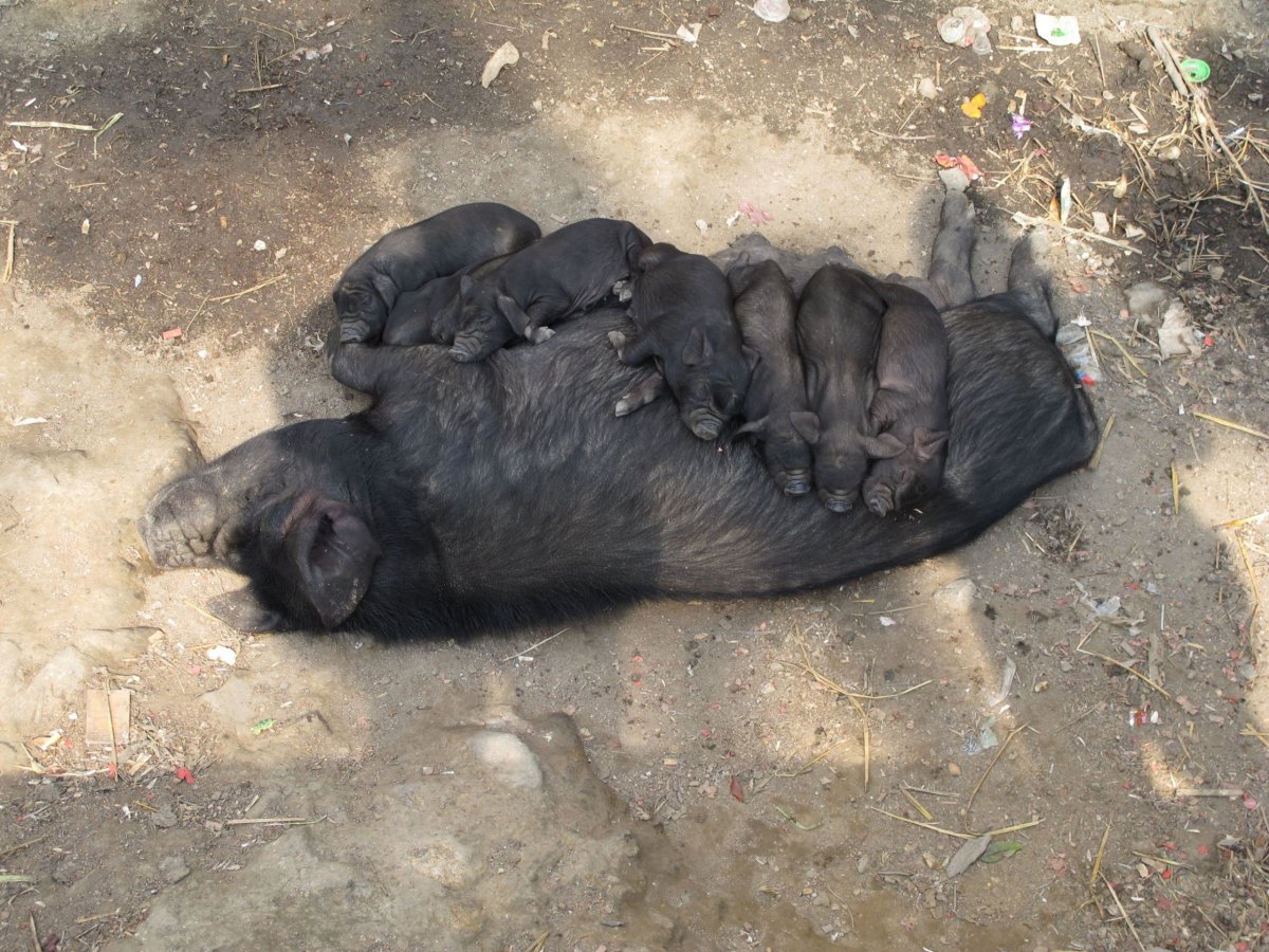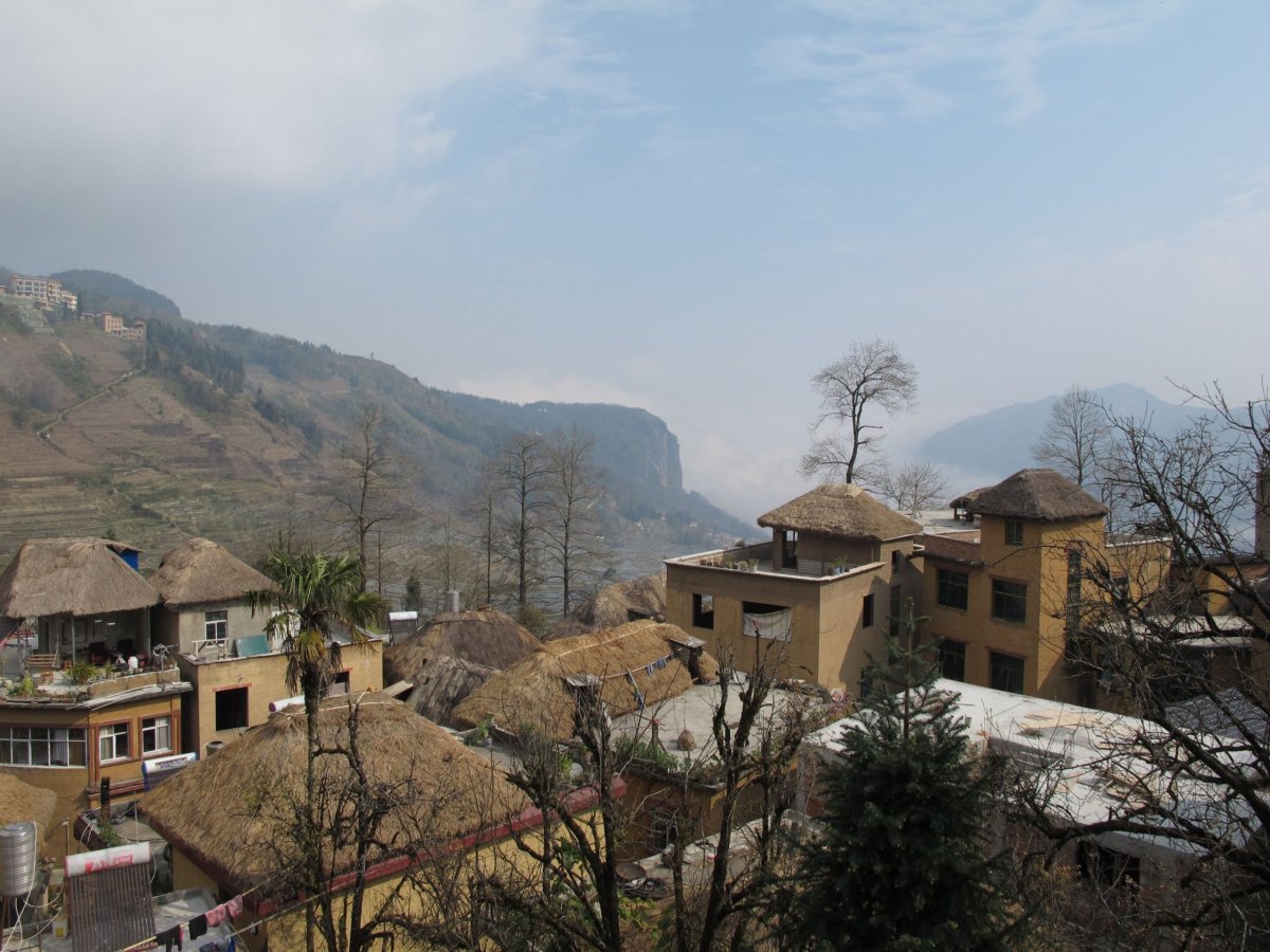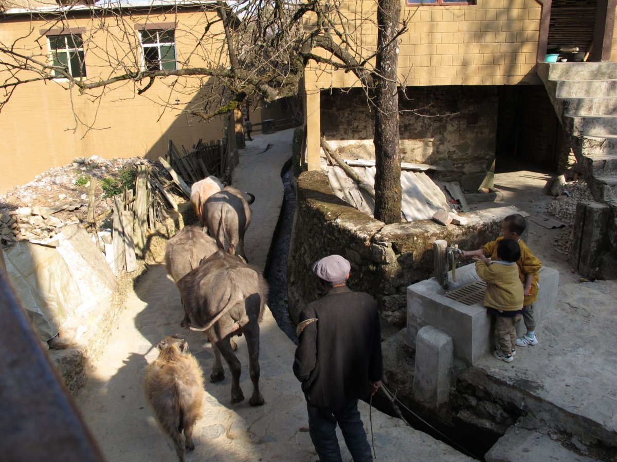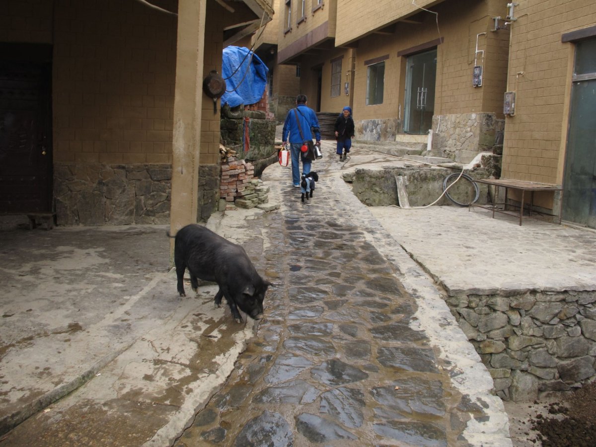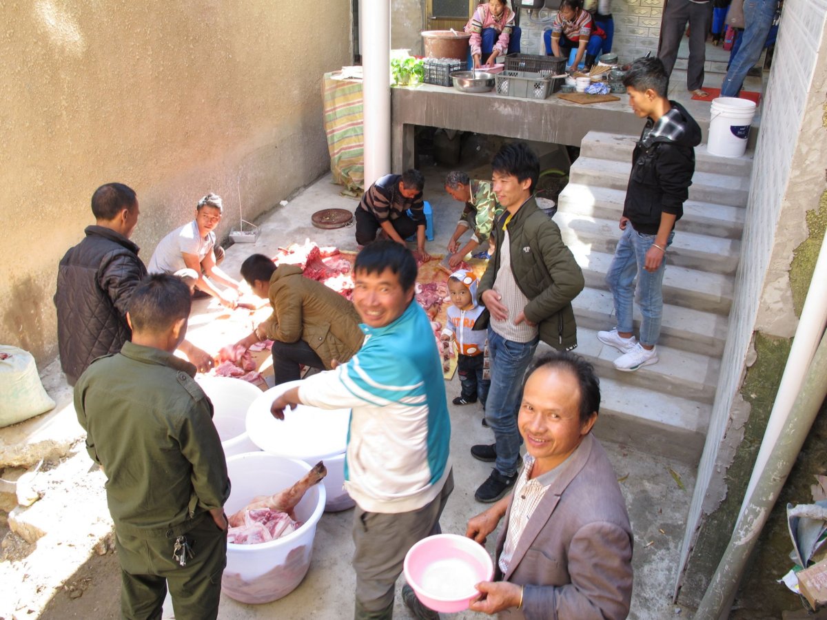 Den 18: Přímo po hrázích rýžových teras dojdeme do vesničky asi 2 km vzdálené, ležící trochu skrytě mezi terasami. Není tam žádný hostel, obchod, nic. Byly tam na ulici dvě zabíjačky, na kterých se podílely desítky lidí. Zvali nás na jídlo, fotili se s námi, byli moc milí a přátelští. Pozvání jsme s díky odmítli. V hostelu jsme se večer dozvěděli, že zabíjačka se dělá jen při mimořádných příležitostech a jde o velmi významnou událost pro celou vesnici. Večer v hostelu proběhl mezinárodní večer: sešli se tam turisté z Francie, Švýcarska, z Česka; k tomu nám nalil čínský hosteliér místní pálenku z obilí nebo kukuřice.