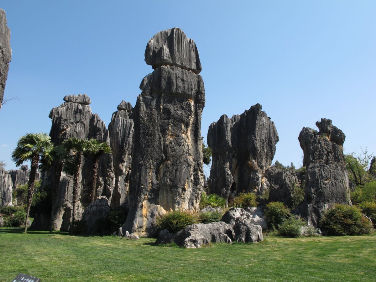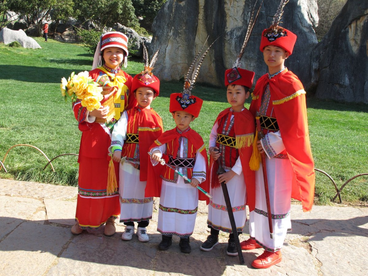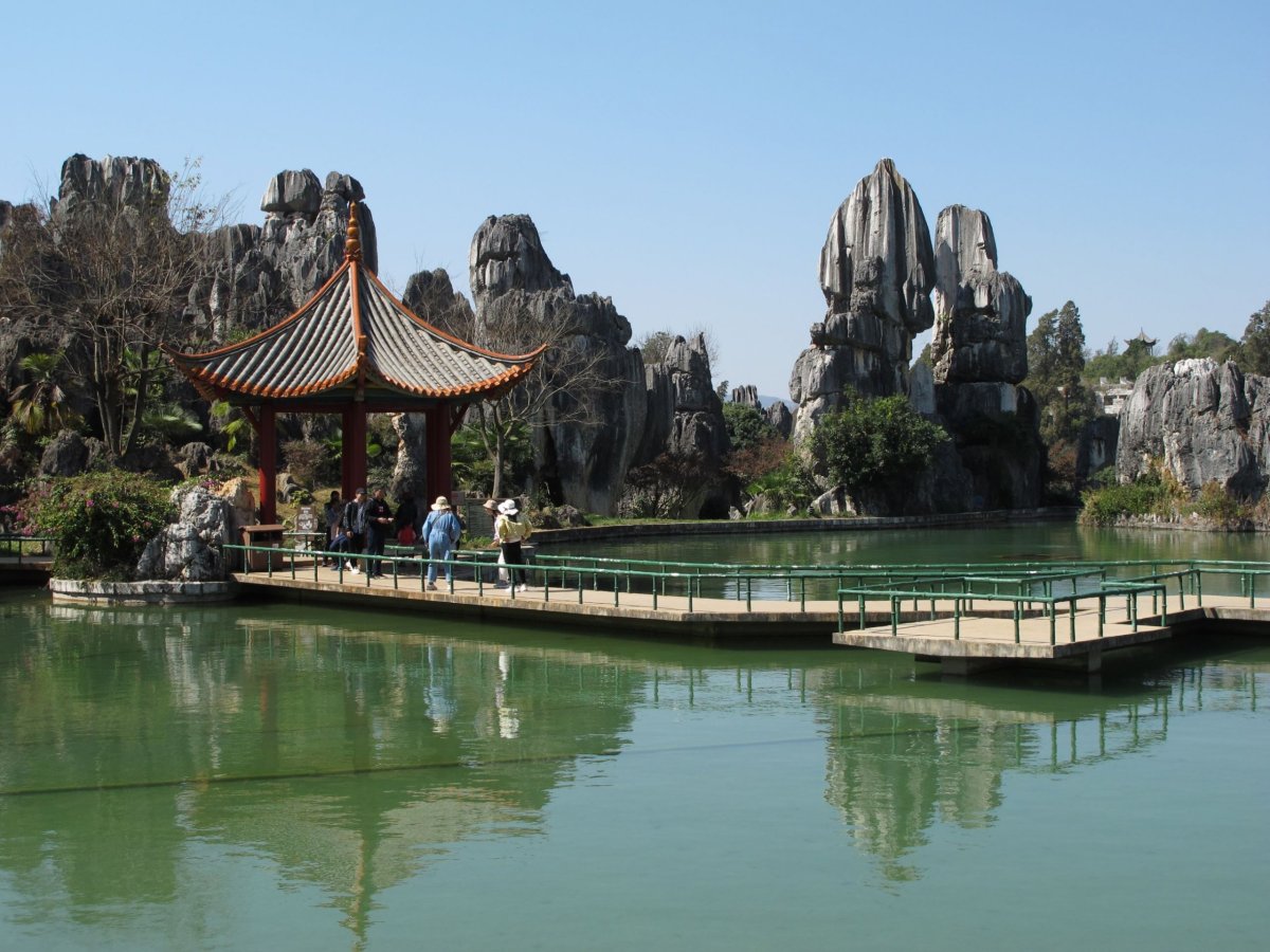 Den 20: Po cca 2,5 hodinách strávených v metru a buse vystupujeme u Kamenného lesa Shilin (Š'-lin) (vstupné 130 yuanů). Je zapsán u UNESCO. Ze začátku všude šílené davy lidí, což nás docela zdeptalo. Pak už to bylo lepší a davy se trochu rozptýlily. Krasový kamenný les je pěkný a zajímavý, ale protože máme třeba Adršpach nebo Moravský Kras, tak úplně s otevřenou pusou jsme na to nekoukali. V parku prováděli často příslušníci menšiny Yi (I) v typických krojích.