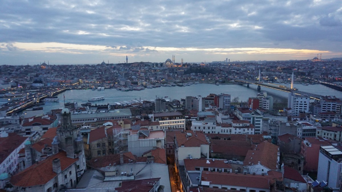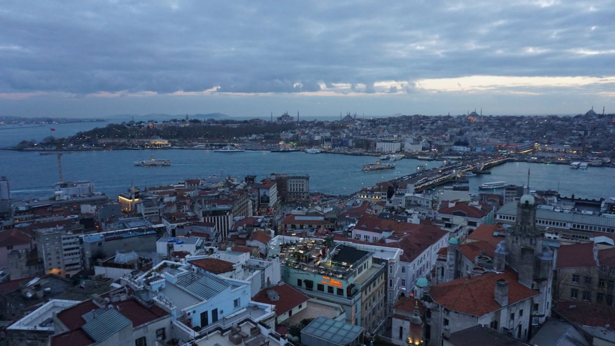 Jako poslední bod programu nám dnes zbyla Galata Tower vzdálená asi 500 metrů od Umbrella street. Věž byla postavena v roce 1348, má 70 metrů a nahoře se nachází venkovní ochoz, díky kterému se vám naskytne krásný 360 stupňový pohled na celý Istanbul (ochoz je docela úzký, takže je na zábradlí umístěna obrovská s cedule s nápisem - chodí se z pravé strany - kterou ovšem většina lidí úspěšně ignoruje, takže se nakonec na úzkém ochozu musíte nepříjemně vyhýbat). Galata Tower je taky vyhlášená obrovskými frontami na vstupu a i takto mimo sezónu jsme v ní opravdu stáli 45 minut. Byla ale sobota večer (západ slunce je na ní nejvyhlášenější) a přišlo mi, že dost lidí ve frontě je místních. Každopádně její návštěva je absolutní nutnost, protože odjinud se vám nenaskytne takhle krásný pohled na Istanbul. Jedno důležité upozornění, vstup je 45 TL a nedá se platit kartou. Tak abyste nestáli frontu zbytečně. Obecně na dost místech v Istanbulu potřebujete hotovost, naštěstí směnárny a bankomaty jsou alespoň v těch turisticky zajímavých oblastech opravdu na každém rohu.