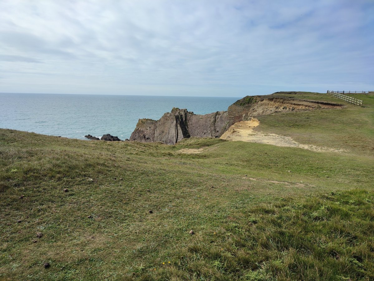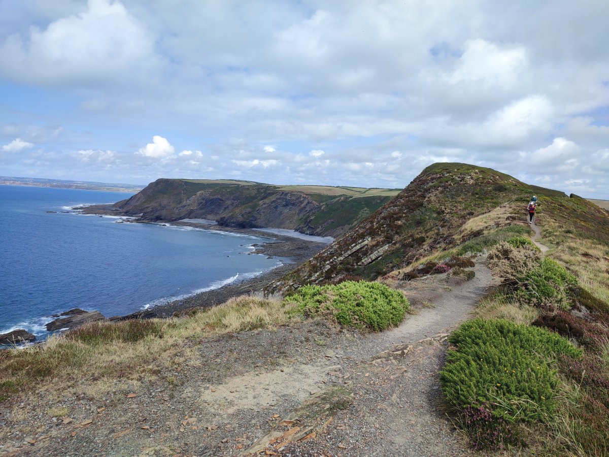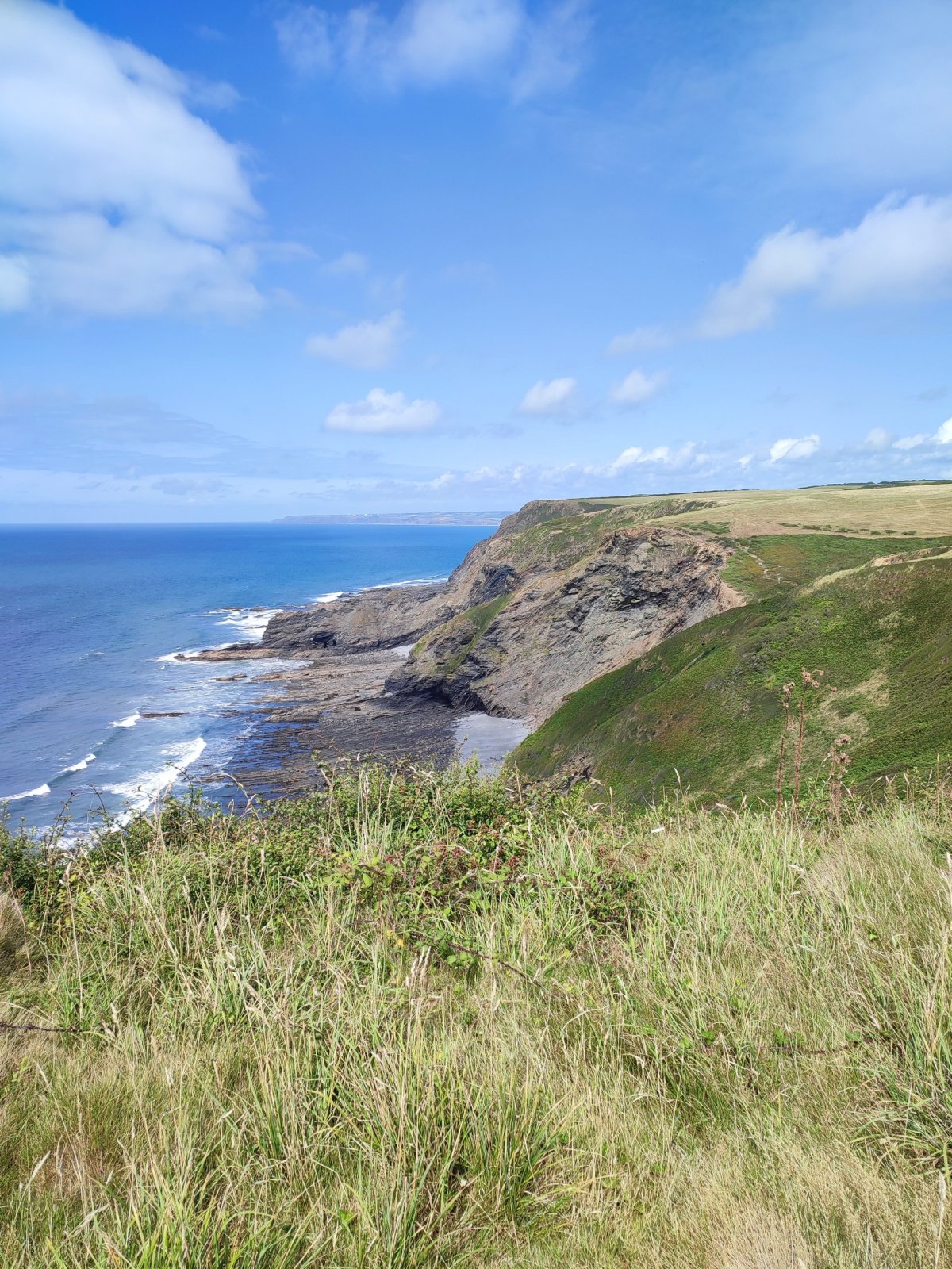 Ale teď už opravdu vyrážíme. První úsek se jen mírně vlní. Nejsou tady žádné dramatické propady nahoru dolů. Takže se bez potíží můžeme kochat zelenými pastvinami, útesy nad mořem a pomalinku se blížícím přílivem. Rozdíly ve výšce hladiny při přílivu a odlivu jsou v Cornwallu obrovské, někde až 13 metrů, což dělá největší rozdíl v celé Evropě! V dalších dnech jsme se o tom mohly několikrát přesvědčit. Bohužel odliv koncem července vrcholil většinou během dopoledne až k poledni, takže většinu přístavů jsme viděly spíš na suchu. Holt příliv a vlaky na nikoho nečekají.