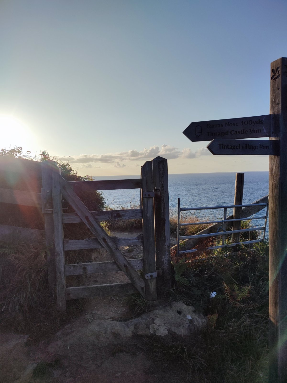 Ale my rozhodně nehodlaly strávit zbytek dne v kempu! Jakmile jsme se zabydlely a sluníčko se vyhouplo zpoza mraků, vydáváme se na pochod k pár kilometrů vzdálené vesničce Tintagel a hradu stejného jména. Po třech kilometrech se vám otevře pohled na protější teď-už-ostrov. Pokud chcete na prohlídku, je dobré si vstupenku koupit online předem. Hrad totiž bývá dost vytížený a nemuselo by na vás vyjít místo. Pokud byste čekali, že za £18.50 uvidíte hrad jak lusk, možná budete trochu zklamaní. My přišly až po zavíračce, takže jsme měly prohlídku zdarma, ovšem jenom tam, kde se dostaneme po pevnině. Přes most už se musí platit. Stejně je po 18h už dávno zavřený. Tušily jsme, že toho asi moc neuvidíme. A proto nás příjemně překvapilo, co všechno je po zavíračce dostupné - v podstatě celá pevninská část za první bránou, tam bývala ubytovaná posádka a návštěvy, pak se dostanete až k brance mostu a po dosti krkolomných schodech (jen pro otrlé) dolů k bývalému přístavišti. Odtud si vyjděte na vyhlídku naproti ostrůvku a v záři zapadajícího slunce se kochejte pohledem na těch pár kamenů, co z hradu ještě zbyly. Ono už tam toho opravdu moc není a to, co návštěvníky na tohle místo táhne, je spíše ona legenda a most, který si v ničem nezadá s naší Stezkou v oblacích. Kdysi ostrov s pevninou spojoval přírodní skalní oblouk, ale nahlodán zubem času a neodbytným příbojem skončil kdesi na dně moře. Teď je tam postavený most kovový a řeknu vám, tohle NENÍ procházka pro slabé povahy. Další atrakcí je socha krále Artuše, která vypadá spíš jako jeho duch. Postava není jednolitá, tu a tam něco chybí, a když vám pohled zabloudí skrz stojící tělo, máte pocit, jako by tu byl a zároveň nebyl. Tolik aspoň dojem z fotek, osobně jsem neměla tu čest. Socha je na ostrově, takže opět jen pro platící návštěvníky. Další zajímavost je Merlinova jeskyně, dostupná ovšem pouze za odlivu. My to štěstí neměly, a to bychom zrovna pro tentokrát ten odliv braly... voda stoupá a my taky - opět nahoru do kopce. Slunce se totiž pohybuje nezadržitelně opačným směrem a čelovky odpočívají v kempu.