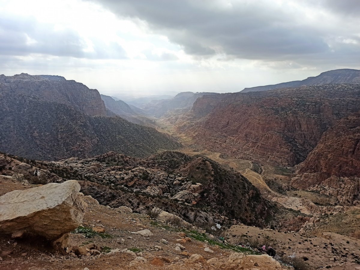 Po loňském neštěstí ve Wadi Al Mujib, kdy přívalová vlna utopila nějaké turisty, je canyon zavřený. Proto jsme se rozhodli prorazit zezadu přes hory k jeho koncové části, no a až v protisměru dojdeme ke vstupu, tak ven už nás strážní pustí, ne? Nicméně po pár kilometrech se z nějaké hory nad námi ozval rázný vojenský hlas. Mrkli jsme na trička, jestli nejsou vidět červené tečky od kolimátoru. Nic. Pokračujeme, ale guma na kopci zní neodbytně. Navíc jsme v pohraničním pásmu a na obzoru je další černý mrak. Chvíle váhání. Balíme to.