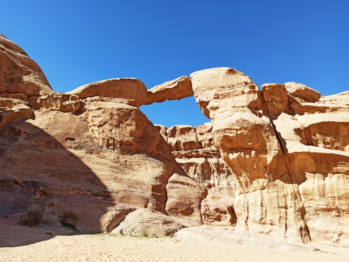 Na jakési Miss Poušť, nebo co to bylo za soutěž krásy pouští, prý zabodovala Wadi Rum a proto jsme ji nemohli vynechat. Spaní ve stanu za 3jorďasy/stan včetně snídaně bylo suverénně nejlevnější za celý výlet. Čuchali jsme čertovinu, proto jsme Bedouina, který měl za úkol eskortovat turisty offroadem do jednotlivých campů, poslali do .. díky, nemáme zájem. Záhy se ukázalo, že poslední míle do campu, skrz jemný písek fešfeš, by pro naše Mitsubishi Lancer, byla zároveň poslední v jeho kariéře. Tohle by se v půjčovně fakt blbě vysvětlovalo. Sklonili jsme hlavy a odebrali se do Wadi Rum Village na centrální seřadiště do transportu. Kupodivu byl bezplatný. Ráno jsme se nechali ukecat na výlet do pouště za 60jorďasů a nebyla to chyba. Zpočátku sice, když po 20min cestě Bedouin zastavil, vystoupil a obřadně prohlásil: „Vi ar on d midl of vadi rum“, nastoupil a jeli jsme dál, napadlo mě, že tady někdy musel pobývat Jára Cimrman. Další zastávka: dis dirékšn is Saudi Arabiá, end dis dirékšn is Irak. Nicméně skalní útvary hlouběji v poušti byly úchvatné. Nebo-li, jak by řekl fotograf Boris: kyč jak cyp. Bedouin nás mimo jiné namotivoval k výstupu na skalní oblouk, a mezi řádky se dalo číst: dokud tam nevylezete, dál se prostě nejede. Tak mazejte, chci si v klidu vypít čaj. Nahoře Brašna zasněně uronil větu: „úplně stejný jako Grand Arche. Akorát na ten když vylezeš, dostaneš flastr, že ho budou splácet ještě tvoje děcka“. Turismus tady tepe, ale je to ještě takové příjemně nepřecivilizované.