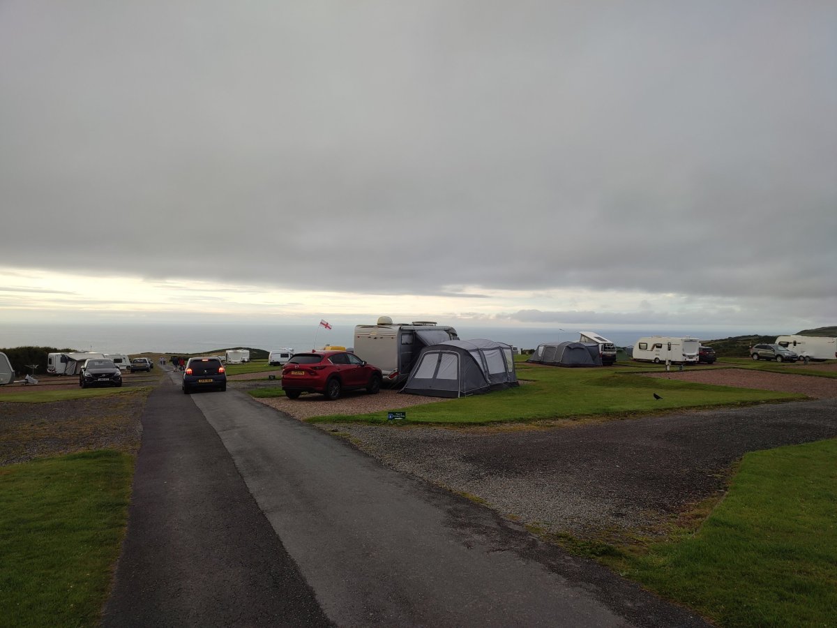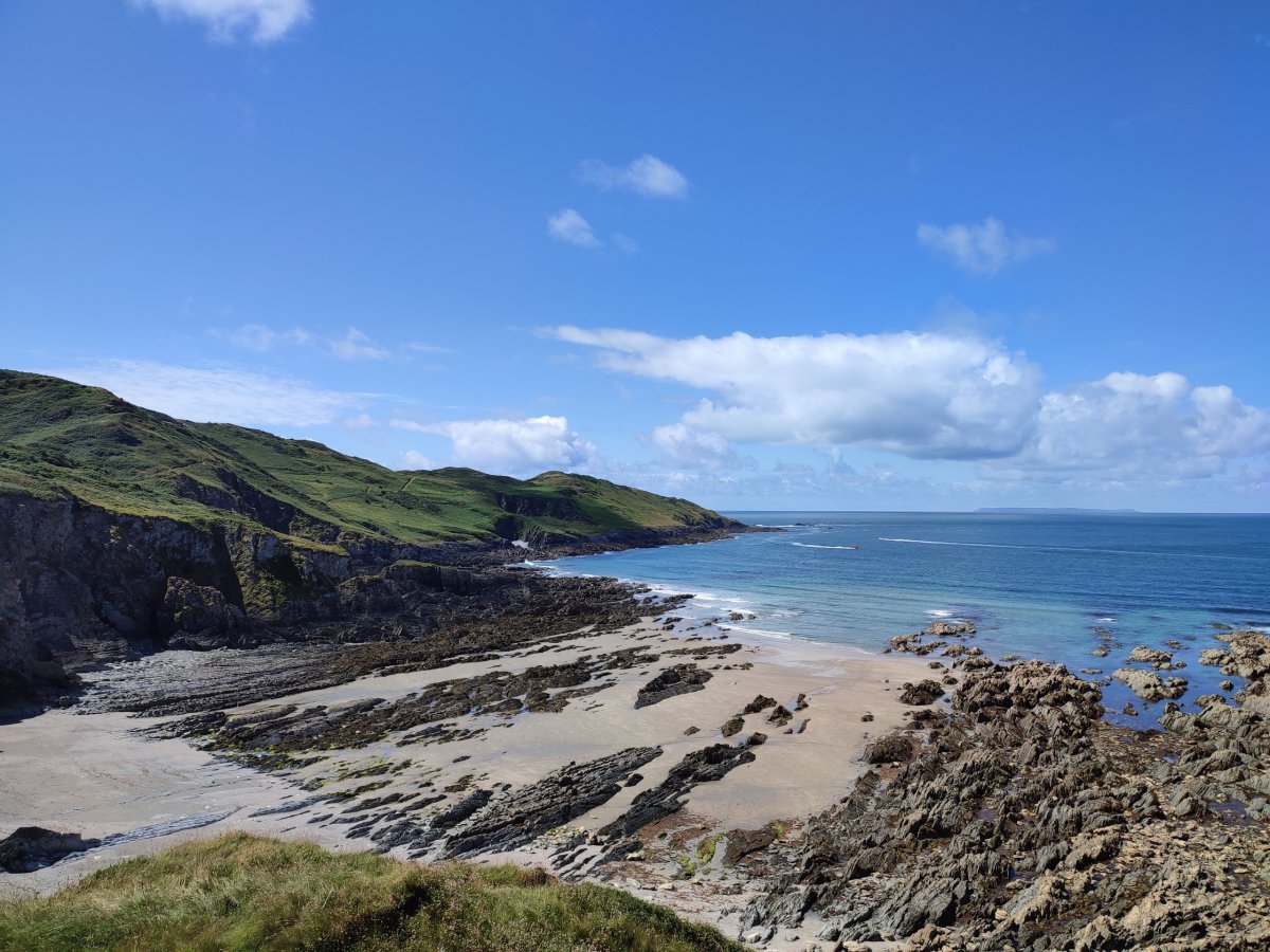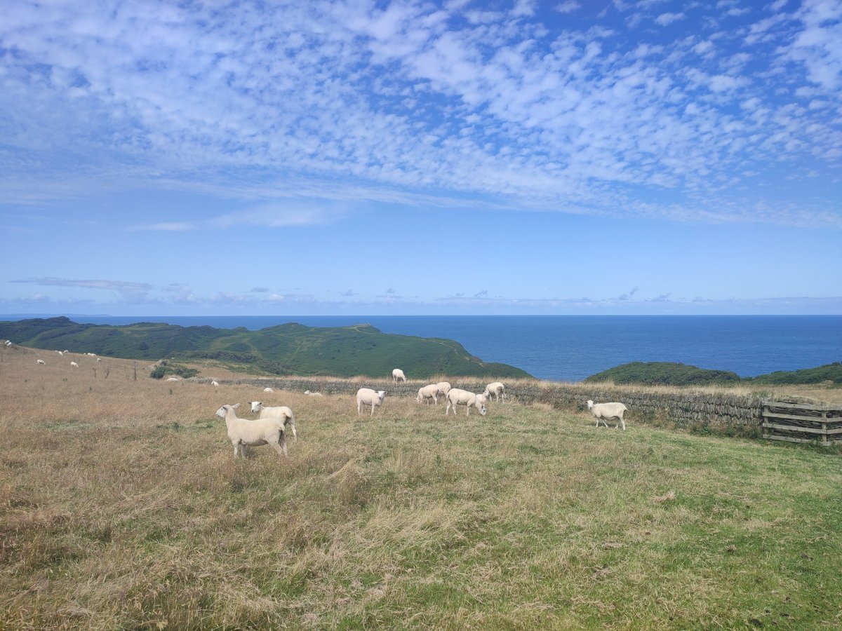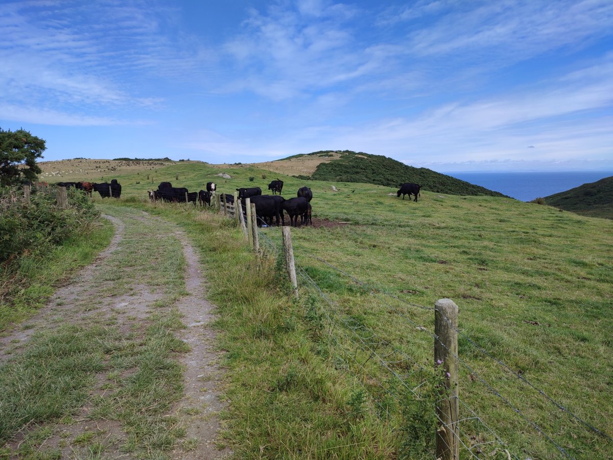 Přes noc se mi podařilo jakž tak uschnout (s výjimkou bot, beznadějné). Ráno jako bych se probudila do jiného světa, stan se mi leskne slunečními paprsky, jen pár mraků nad obzorem připomíná, že kdysi pršelo. Ale to už je zapomenuto a prominuto. Protože dneska se vydávám kolem tří monolitů směrem k majáku Bull Point. Monolity mě trošku zklamaly. Přestože jsou zaznačeny i na mapách.cz na spojnici mezi kempem Damage Barton a pobřežím, ve skutečnosti jsem je nikde nezahlédla, i když jsem procházela (prý) těsně okolo nich. Asi to byly jen nějaké malé šutýrky schované v trávě. Jakmile se ale napojuji na stezku, jsem zase zpátky ve svém světě plném útesů, racků, vlnícího se moře a slaného vzduchu. Včerejší déšť je minulost.