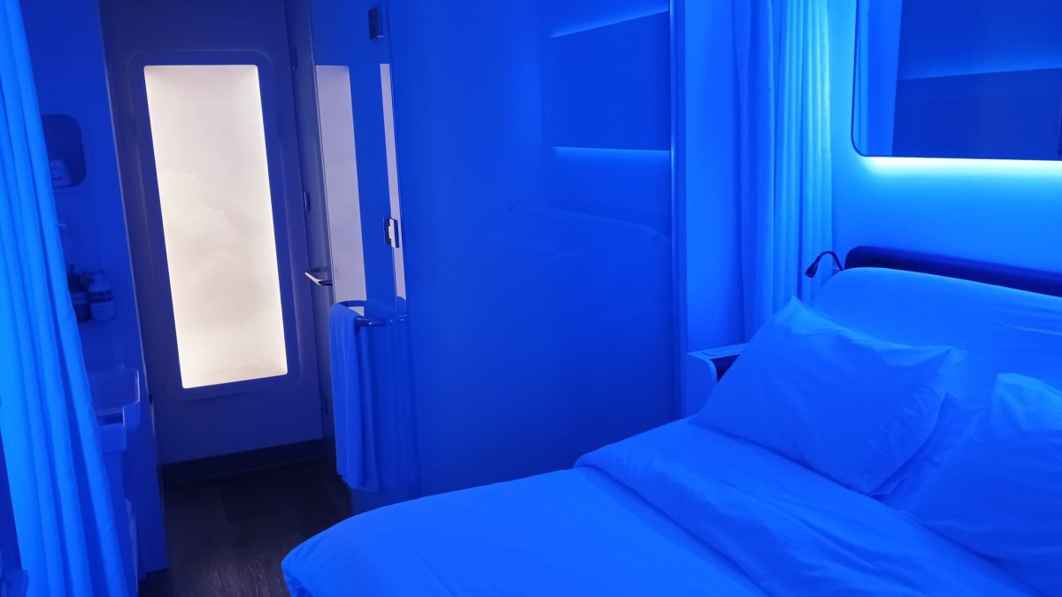 Ok, máme přes čtyři hodiny času. Jdeme si odpočinout do hotelu Yotel landside, který jsem rezervoval. Je přímo nad námi. Takže po jezdících schodech vyjedeme od odletové haly, vlevo je vstup 7 a přepážky P, podél kterých dojdeme až v vstupu do Yotelu. Cena je 111 € za 4 hodiny. Za to máte vlastní vkusně zařízený pokoj. Někomu může přijít malý, ale dispozičně je dobře řešený, takže jsem neměl pocit stísněnosti. Lepší než na Manhattanu. Kromě pohodlné postele je zde velká televize, lednička, toaleta a hlavně sprcha. Jediný problém byl s odtokem, takže jsem vyplavil celou místnost.
