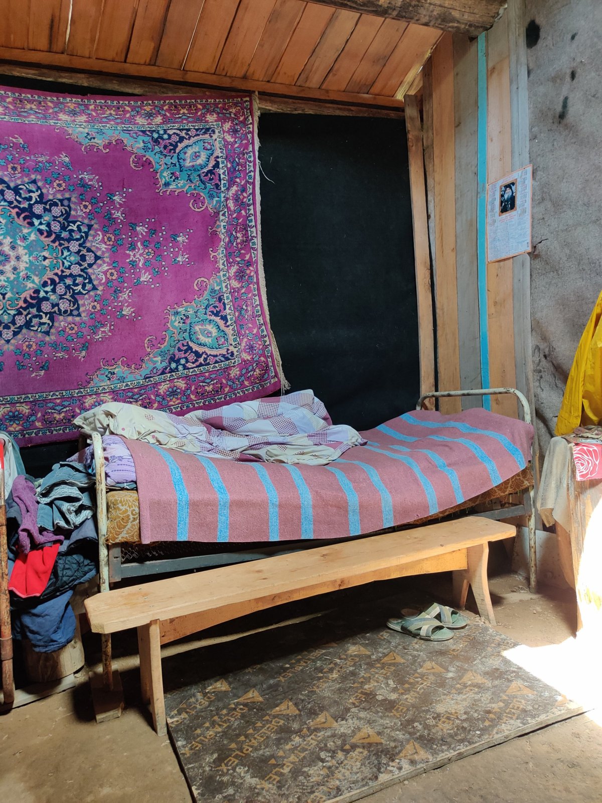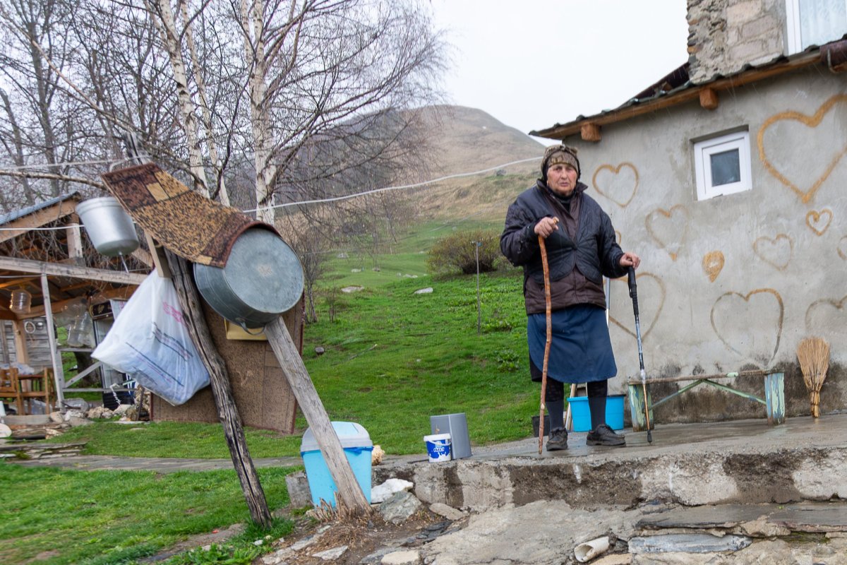 U auta zjišťuji, že jsem někde píchnul, pravé zadní kolo mám úplně prázdné. Naštěstí rezerva funguje a já mám s výměnou pneu dlouholetou praxi, takže vše jde dobře. V půlce výměny přijde znovu Eros, který se zeptá, co se děje a když vidí, že jsem píchnul, tak říká, ať si s ním dám pauzu a pozve mě k sobě do... no říkejme tomu dům. Je to jeho jakási chata, jak vysvětluje, dům se ženou má v Mestii, což je největší město v kraji (celých 1900 obyvatel). Říká, že syn jezdí s tirákem v Německu, že to je skvělé. On má doma vinici, a tady ať ochutnám jeho víno. Naznačuji, že řídím, ale nad tím jen mávne rukou a už leje i sobě a pobízí, ať si dám. Z velkého hrnce loví domácí jogurt, z batohu plackový chleba, nakládanou zeleninu, nakladané byliny z louky... Nakonec je z toho celkem hostina. Poprvé připíjí - snad ze srandy - na Stalina a na vlast, podruhé připíjí na ženy, potřetí na boha, takže takhle tu ty priority jsou. Chce na mě kontakty, že si mě přidá na Facebook, ale není tu signál. Povzbuzený vyměním kolo a zvesela vyrážím zpět na soutok řek, kde jsem měl včera v noci dobrodružnou cestu. Cesta ve dne je rozdíl dne a noci - když člověk vidí ty kameny a zatáčky dřív než když je trefí.