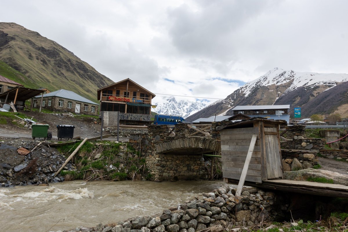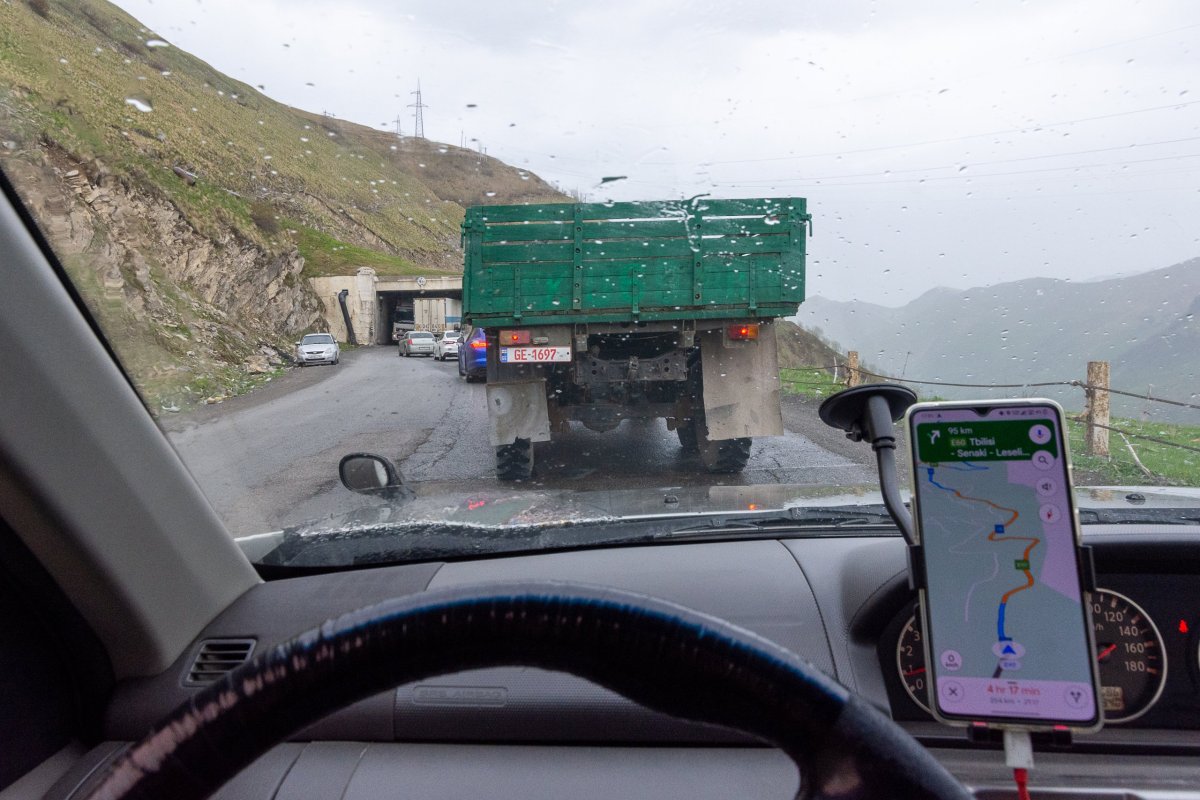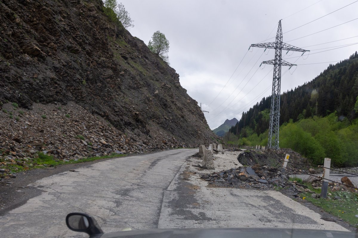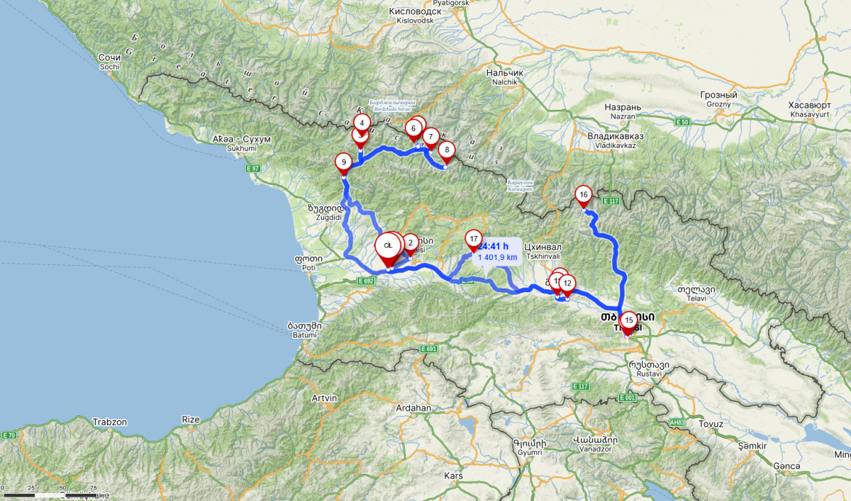 Vyrážím na západ a sever, na další dny jsem si náhodně vybral, že začnu v horách. Nepočítejte s tím, že po gruzínských silnicích budete jezdit moc rychle - a ono by to moje auto ani nedalo, ale i na asfaltkách jsem rád, že mám teréňáka 4x4. To, co vám mapy ukazují, vynásobte 1,2 - 1,5x.Po cestě se setmí, a já zjišťuji, že mě navigace vede na prašnou cestu. Tma jako v pytli, napravo skála, nalevo temná propast, kde někde dole slyším divokou vodu. Svítí mi jen jedno světlo. Co si budeme povídat, byla to velmi dobrodružná cesta. Mosty převážně z plechu, vidět moc daleko není, rychlost kolem 20 km/h. Do hotelu přijedu vyčerpaný v 11 večer, slečna na mě čeká s dítětem v náručí, řekneme si, že vše vyřešíme ráno, a okamžitě usínám.