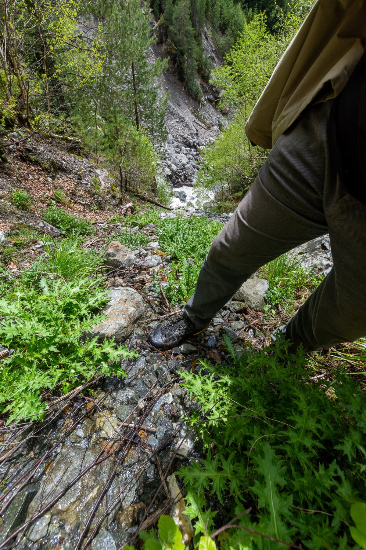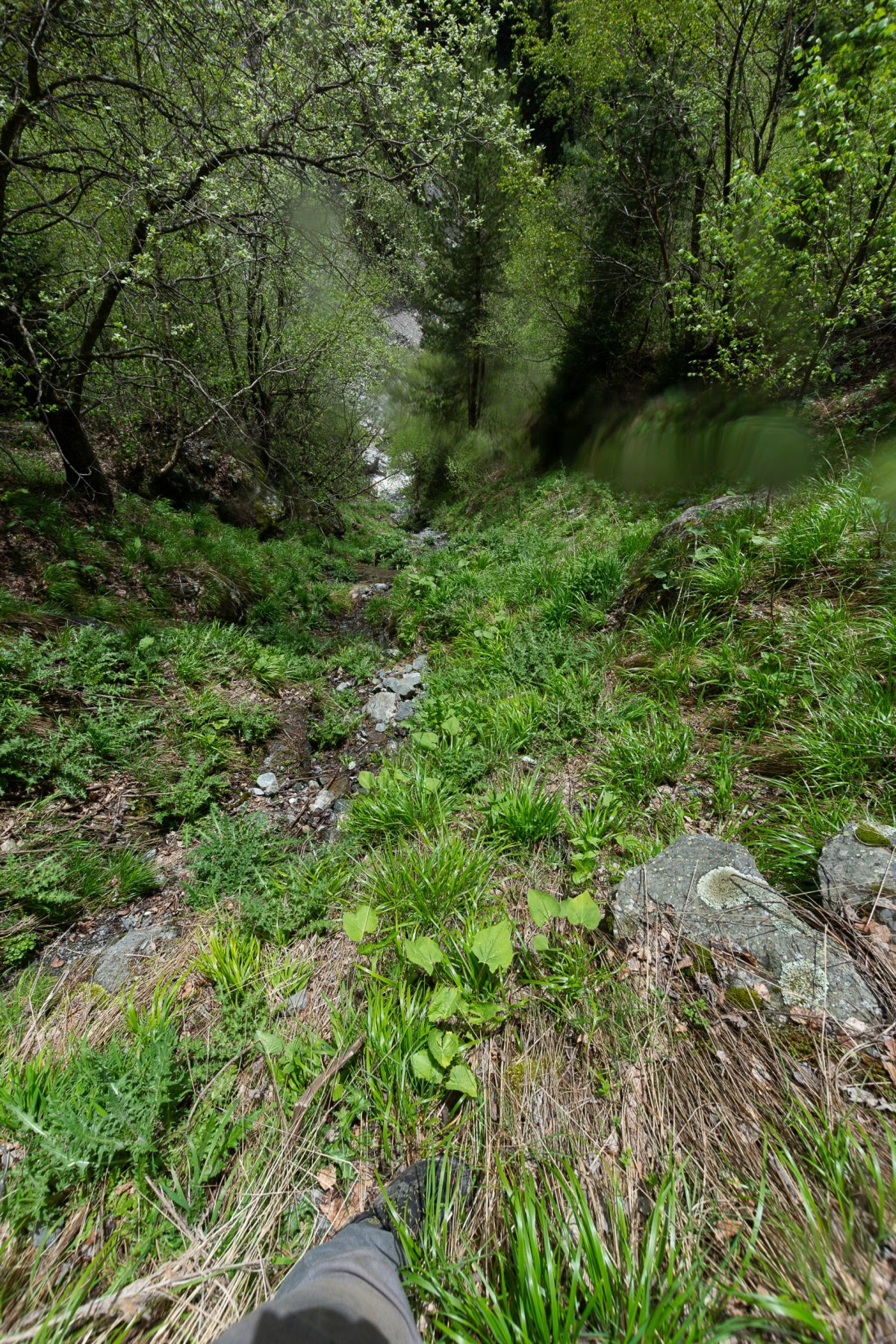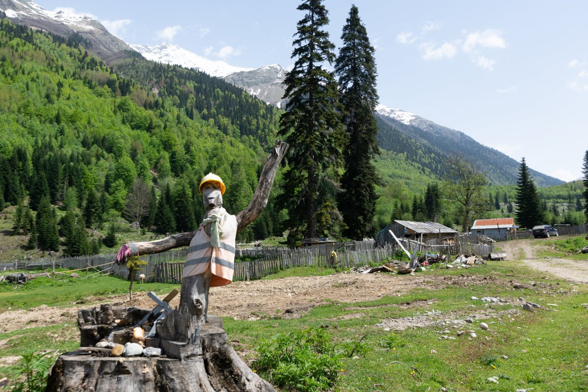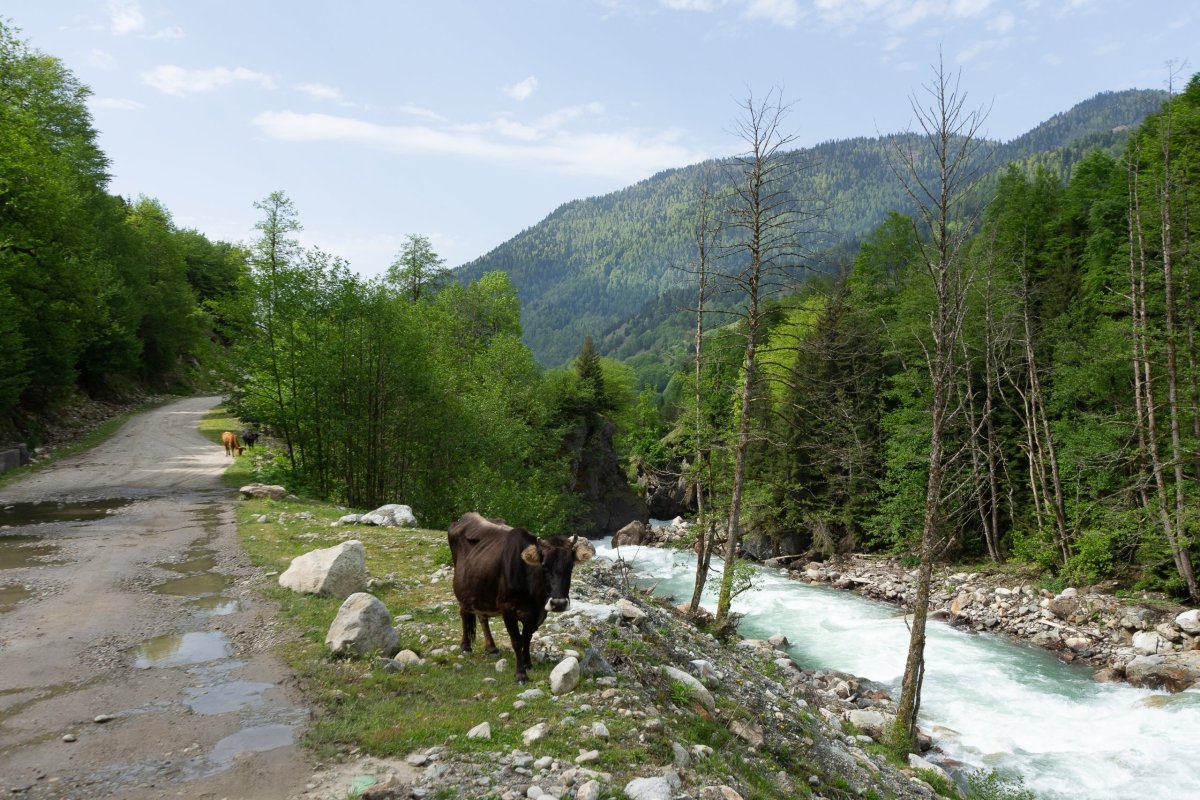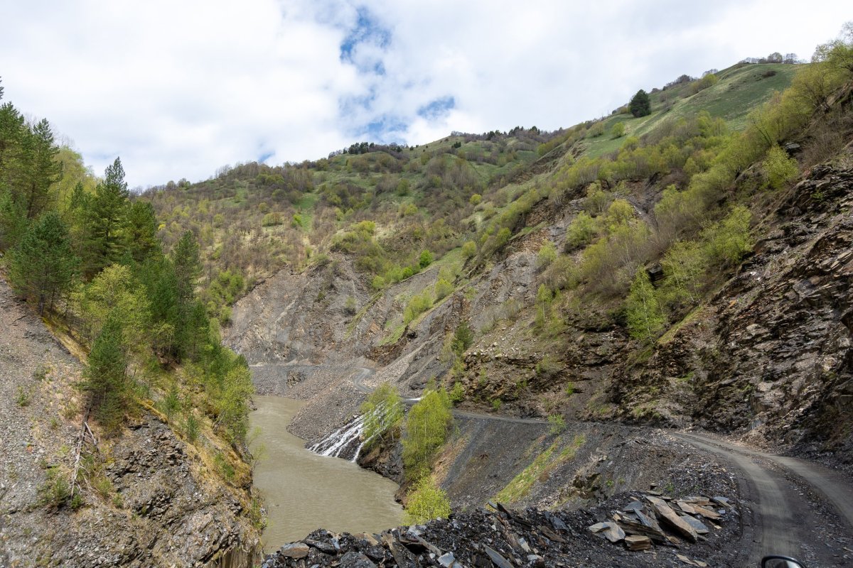 Rozhodl jsem se prostě vyrazit po polní cestě dál, kam to půjde, případně s výletem k horskému jezeru. Je to opravdu divočina, bez 4x4 bez šance, a i já si občas škrtám podvozkem. Míjím něco, co se tváří jako celnice, ale nikdo tu není a podle mapy jsem stále v Gruzii, tak snad nejsem v separatistickém území. Dojedu na samotu na louce, v dálce je vidět vodopád a je tu cedule na jezera. Jakmile zastavím, už na mě volá jeden ze tří místních obyvatel, kam jdu, rusky... Snažím se vysvětlit, že k jezerům, lepší to jde česky než anglicky, protože umí rusky. Vysvětluje, že k jezerům bych musel vyrazit za úsvitu, abych to stihl ve stejný den zpět, ale že se mnou půjde zítra, což s díky odmítám a vyrážím alespoň k vodopádu. Po kládě přejdu řeku, ale cesta po sto metrech zmizí a zůstane jen hustý les a prudký sráz. Hodinu se snažím probojovat dále, ale vzhledem k tomu, že ujdu asi 300 metrů vzdušnou čarou, uznávám porážku a vracím se zpět k autu.