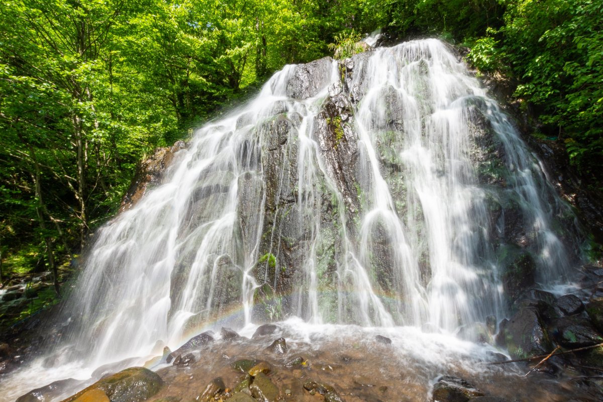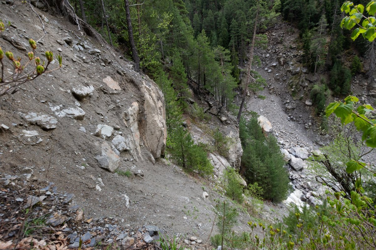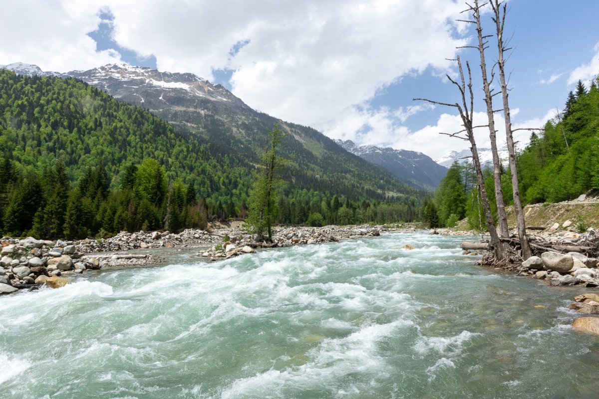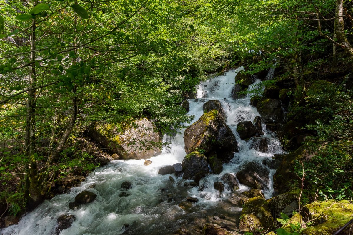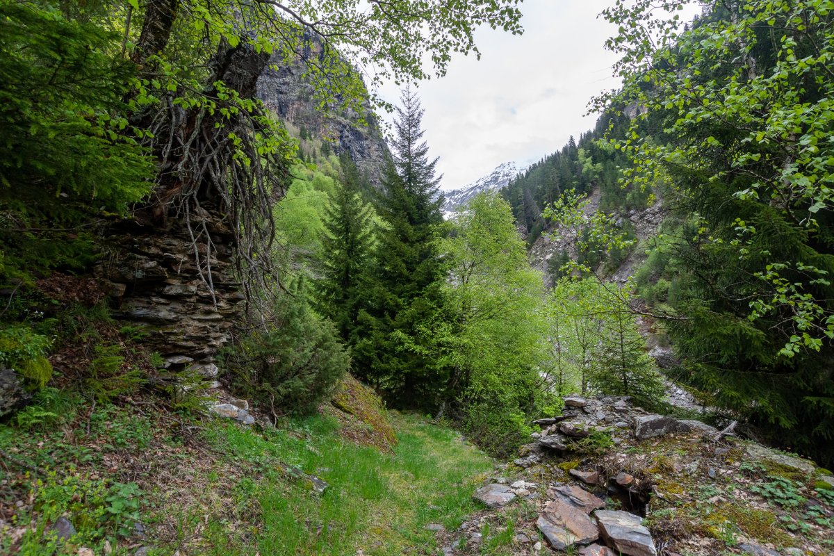 Rozhodl jsem se prostě vyrazit po polní cestě dál, kam to půjde, případně s výletem k horskému jezeru. Je to opravdu divočina, bez 4x4 bez šance, a i já si občas škrtám podvozkem. Míjím něco, co se tváří jako celnice, ale nikdo tu není a podle mapy jsem stále v Gruzii, tak snad nejsem v separatistickém území. Dojedu na samotu na louce, v dálce je vidět vodopád a je tu cedule na jezera. Jakmile zastavím, už na mě volá jeden ze tří místních obyvatel, kam jdu, rusky... Snažím se vysvětlit, že k jezerům, lepší to jde česky než anglicky, protože umí rusky. Vysvětluje, že k jezerům bych musel vyrazit za úsvitu, abych to stihl ve stejný den zpět, ale že se mnou půjde zítra, což s díky odmítám a vyrážím alespoň k vodopádu. Po kládě přejdu řeku, ale cesta po sto metrech zmizí a zůstane jen hustý les a prudký sráz. Hodinu se snažím probojovat dále, ale vzhledem k tomu, že ujdu asi 300 metrů vzdušnou čarou, uznávám porážku a vracím se zpět k autu.
