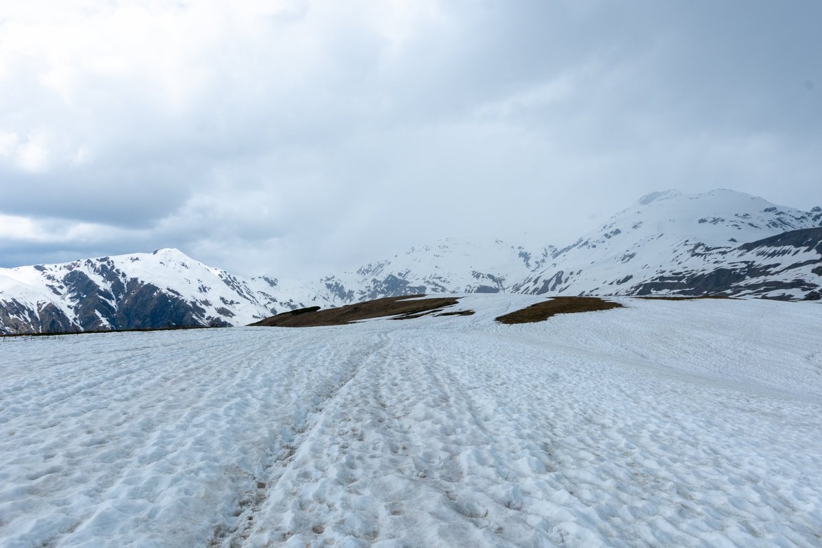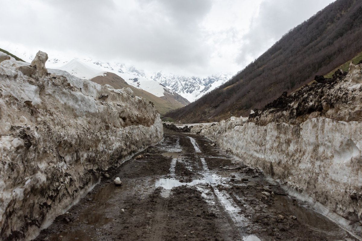 Ráno naberu benzín na jediné pumpě široko daleko, počkám až ruská auta natankují – je tu celkem provoz, a vyrážím kousek za město na ledovec. Na řece v údolí zrovna staví vodní elektrárnu, značení žádné, takže samozřejmě špatně odbočím a vjedu jim přímo na stavbu, tak mě promptně otočí a po kamenité cestě dojedu na druhou stranu řeky, kde je plácek, kam už vozí místní turisty. Auta si tu lidé očividně moc nepůjčují, Gruzie je zemí baťůžkářů, takže na mě koukají dost překvapeně. Po rozeklaném můstku, o kterém mám lehké pochyby, že nespadne při prvním zafoukání větru, přecházím zpátky na druhou stranu říčky a lesem stoupám vzhůru. Navigace je tady pro našince jednoduchá, Gruzie používá české turistické značení, takže vám občas přijde že jdete místo ledovce na Kokořín po žluté. Funguje tu vtipný sytém polodivokých psů, kteří vás vždy kousek cesty doprovází a čekají, jestli z vás vypadne něco dobrého nebo alespoň pohlazení, po chvíli vás předají dalšímu psu v řadě, který vás provede další úsek a tak dál až k ledovci. V době, kdy jsem tady – v květnu, je úroveň horského sněhu na 2200 m.n.m. a místní ledovec se této hranice celkem drží. Splaz, na který jde vlézt má pokrytý hlínou a kamením, pod ním ale čiší chlad ze sněhu. Voda je ledová a divoká, jak se na výtok z ledovce sluší a patří. Neobvyklou zábavu nabízí pozorování tání čela ledovce, protože nahoře je pokrytý kamením a jak taje, kameny padají dolů a s rachotem se kutálí po svahu. Je zde jediná značka prosící abyste nechodili blíže, z celkem pochopitelného důvodu. Jinak v Gruzii žádné značky zakazující vstup nejsou, nikdo vás neomezuje, kamsi troufnete tak můžete jet, ale zase když zapadnete tak nečekejte, že vám někdo zastaví. Dál už nevedou žádné cesty, ale ještě po kamenech vylezu na přírodní vyhlídkovou plošinu, kde se otevře panorama okolních hor a ledovce, nádhera. Akorát počasí se začne kazit, takže zase seběhnu dolů. Druhý dnešní výlet jsem vybral taky v okolí Mestie, chci se podívat na krásná horská jezírka s výhledem na město a krajinu. Podle Google map tam vede cesta, takže si řeknu že budu odvážný a vyčůraný a ujedu polovinu cesty autem, je to totiž pořád do kopce. Ukáže se to jako dost dobrodružné řešení, s láskou vzpomínám na svou hrůzu v očích když jsem před dvěma dny jel po luxusní prašné cestě do hor. Tady je to bahnitá cesta do prudkého kopce, skrz kterou tečou potoky a na jedné straně je sráz až do Mestie. cestovní rychlost maximálně deset kilometrů v hodině, ale šlapat nahoru a dolů bych to taky nechtěl. Nejde se nikde otočit, takže jediná šance je jet stále nahoru. Občas si sednu na břicho, ale naštěstí teréňák hrabe statečně dál. Tam, kde začíná sníh, se naštěstí terén umoudří a já můžu zaparkovat tak, abych umožnil někomu kolem mě projet a autu nehrozil pád do údolí. Říkám si, že jezírka budou asi zamrzlá, když 500 výškových metrů pod nimi je už sníh, ale dám to a budou z toho hezký fotky. HA! Cesta po sněhu probíhala dobře, jen se Vašek občas natáhl. Cestou jsem potkal jen déšť a jednoho skialpinistu, který mě předjel vysokou rychlostí k vrcholu. Pár set metrů před jezírkama zmizela i poslední bahnitá pěšina a zůstal jen hluboký sníh. Říkám si, že jezírka budou za každým horizontem, který potkám, ale všude jen lány sněhu a já se bořím stále hlouběji. Tam, kde jsou podle mapy jezírka, potkávám Rusa, který sem vyběhl v teniskách a krátkých kalhotách se stanem na zádech, říká mi, že tu dnes bude spát, že se mu líbí, jaký je tu klid. Prý jde přejít do Ruska, je to za kopcem, ale teď je na to ještě moc sněhu. Popřeju mu hodně štěstí a brodím se sněhem zpět, cestou zapadnu až po pás a sníh mě uvězní nohu, tak se musím odkopat rukama, čímž totálně promrznu a odpískám veškerý jezírka, hory a celou Gruzii.