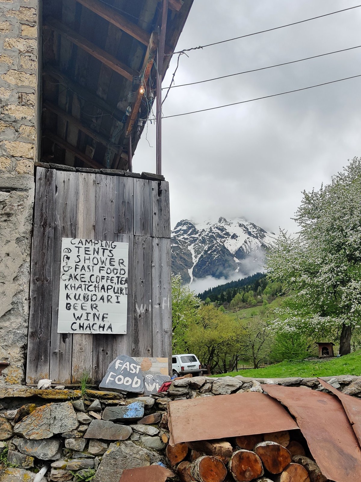 V podvečer dorážím do Mestie, což je hlavní turistický hub zdejších hor. V hotelu samozřejmě neumí anglicky, zajdu tedy do centra do samoobsluhy a na úřad se zeptat na autoservis, ale slečny úřednice nic neví. Vybírám tedy podle Googlu. U servisu sedí asi desetiletý kluk, vytáčím svojí půjčovnu a prosím je, ať se s ním domluví. Za 120 Kč a 10 minut později mám přezuto a můžu na večeři, na kterou jsem si vyhledal zahrádku, mají i tradiční menu, takže si to užívám.