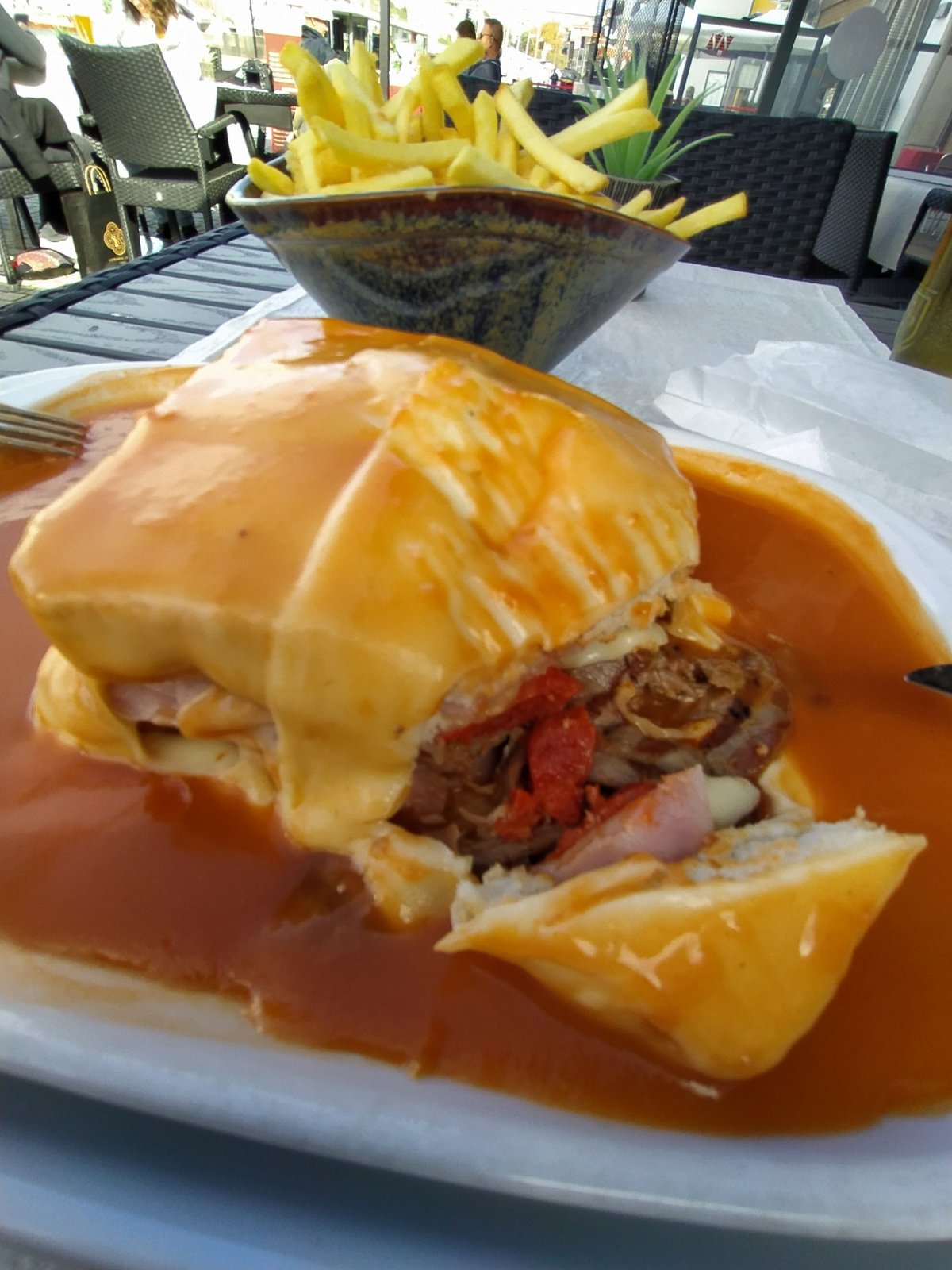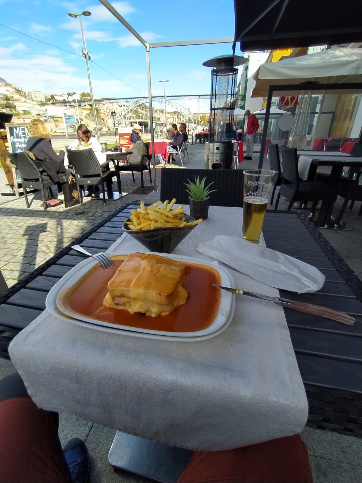 Čtvrteční ráno začalo počasí nabývat letní pohody a Porto bylo připraveno na mojí gurmánsko dokumentární celodenní exkurzi. Hned po snídani jsem se vydal na cestu. Po cestě jsem si prohlédl slavné nádraží Sao Bento, jehož vnitřní výzdoba každého zaujme. Nádraží je také zajímavé tím, že je umístěno v kopci a všechny jeho koleje směřují do tunelů. Cestou jsem pokračoval přes most Ponte Luís horním patrem, kde se naskýtaly překrásné výhledy na celé město. Hlavní tepna, řeka Douro, kterou již od dávných dob proudilo Portské víno do místních sklepů je hluboko pod vámi a na kopci před vámi se tyčí kaple kláštera Serra do Pilar. Na tomto místě, kde vlastně stojíte na nejvyšším bodu, je výhled na město opravdu nejlepší. Pod klášterem a dále po toku Doura jsou světoznámé sklepy Portského vína, čtvrt Vila Nova de Gaia. Tam múžete ochutnávat nepřeberné množství značek a ročníků tohoto vzácného moku a navíc se můžete zúčastnit poučné cesty sklepem, kde se dozvíte vše o výrobě a historii Portského vína. Je třeba ovšem věnovat trochu více pozornosti míře konzumace, jelikož Portské je hodně těžké víno s 20% alkoholu. Nábřeží Vila Nova de Gaia lemují malé hospůdky, které také nabízejí ochutnávku Portského a dále se zde můžete i najíst. Doporučuji místní specialitu Francesinha, kterou si můžete dát ve formě menu s pivem i kafe za neuvěřitelných 10 Euro. Francesinha je vlastně zapečený toast s plátky masa, šunky a klobásků, překrytý sýrem a podávaný na talíři s fantastickou omáčkou a hranolkami. Bylo toho opravdu hodně a vzpomínám, že jsem ten den už ani nevečeřel.