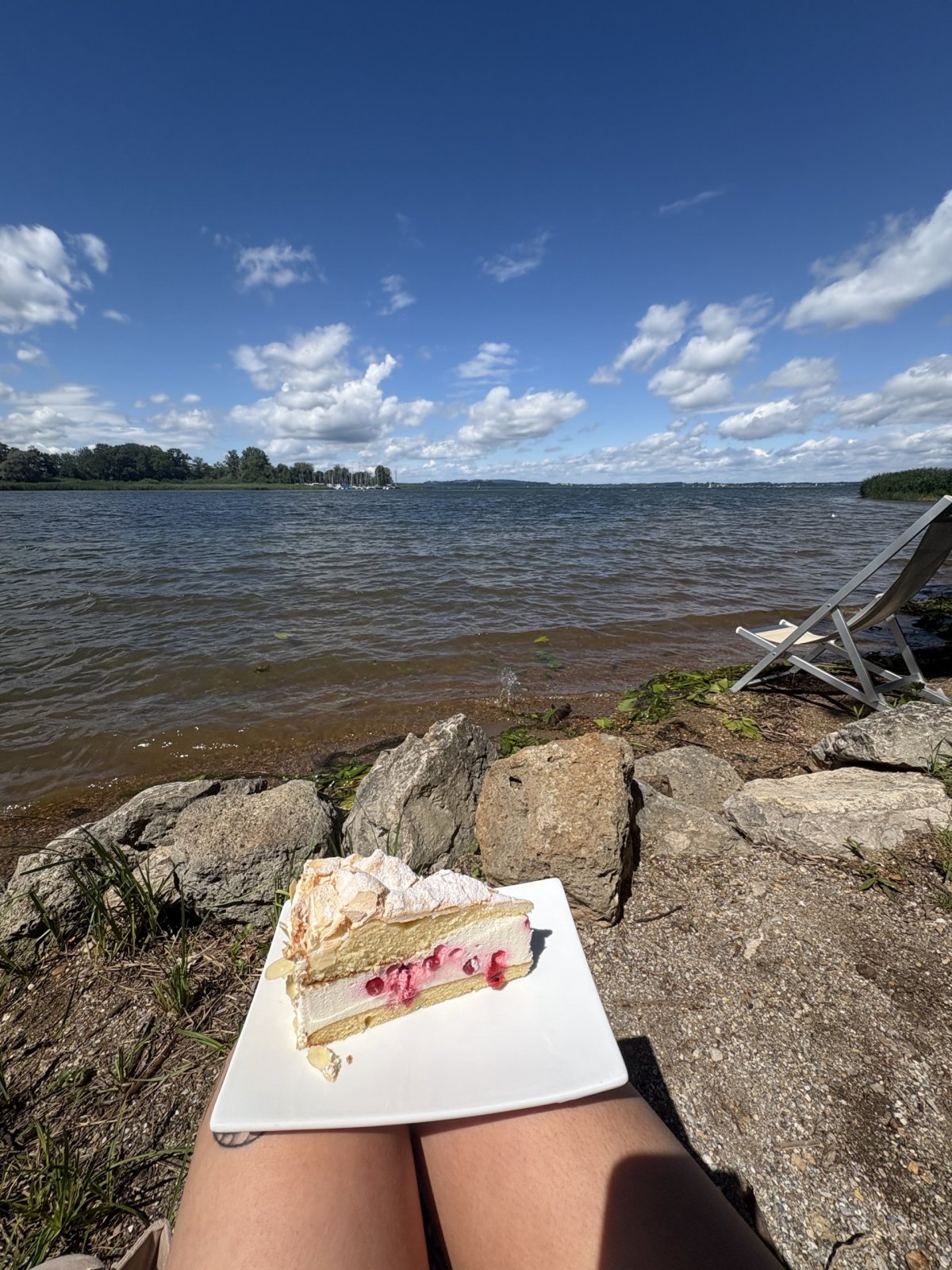Po krátkém návratu do života si konečně dáváme pozdní snídani a vyrážíme směrem na jih. Po cestě se krátce zastavujeme u Chiemsee, kde si v kavárně u jezera vychutnáváme dortík a limonádu. Po chaotickém ránu zasloužený reset.