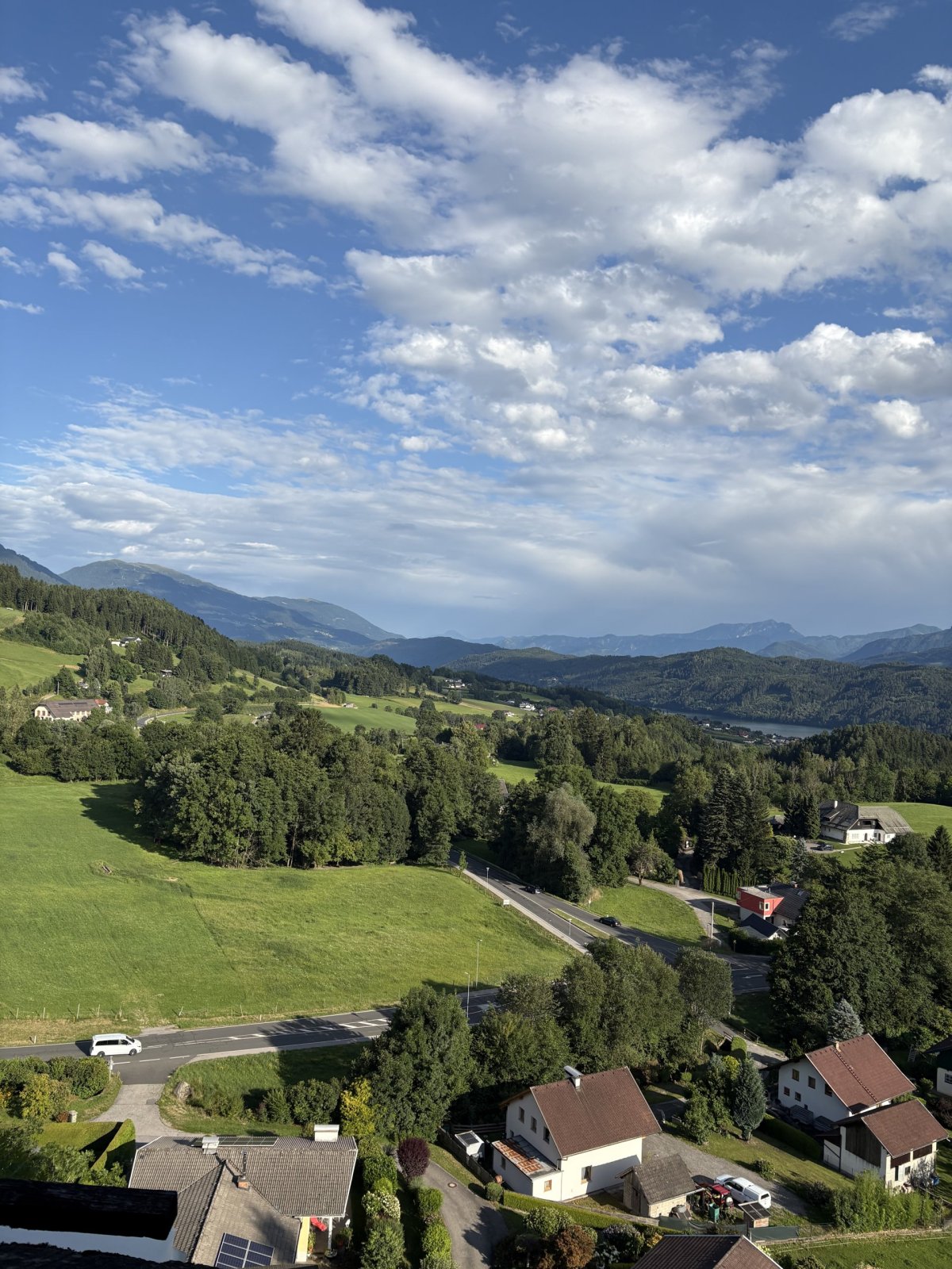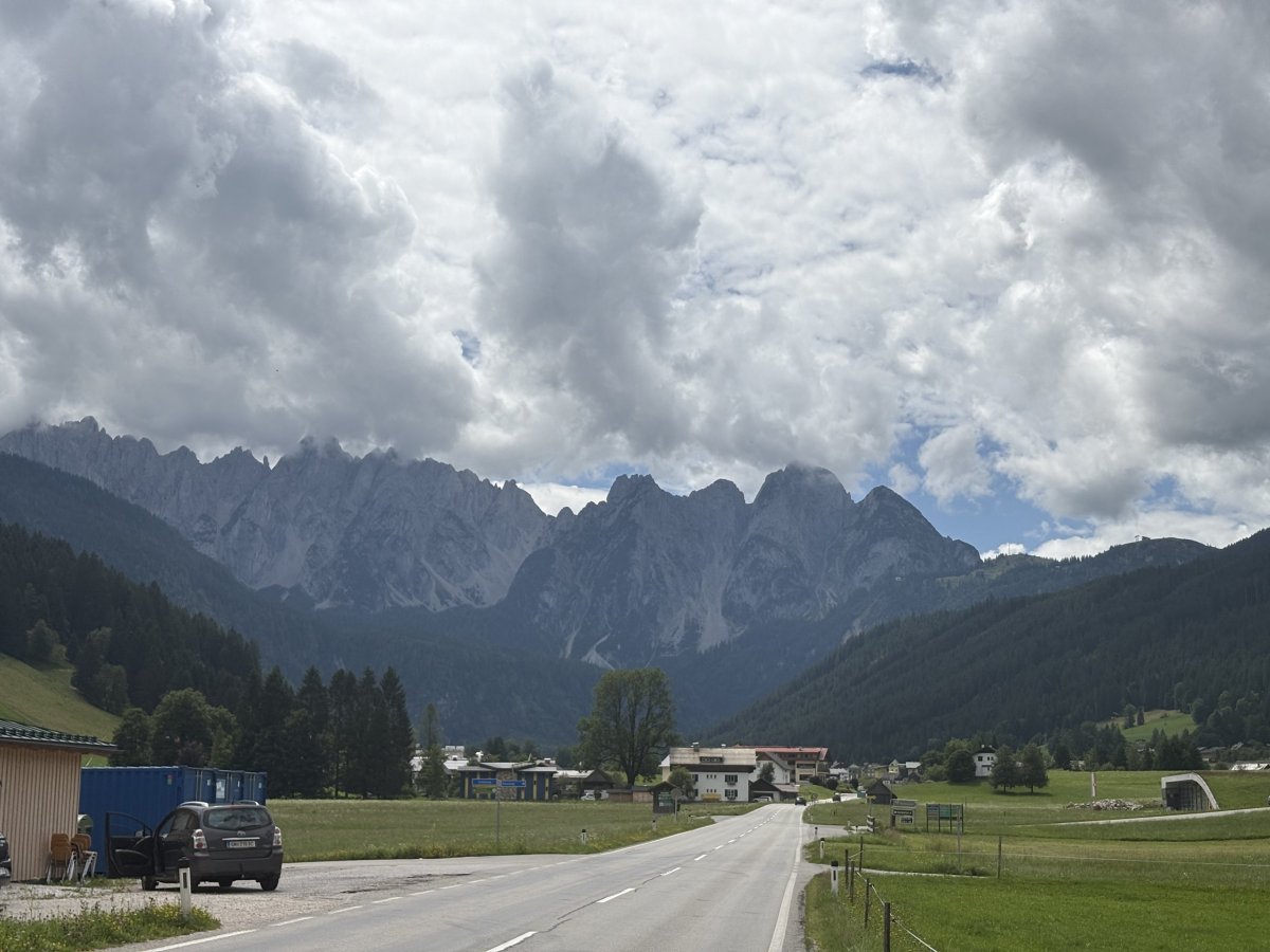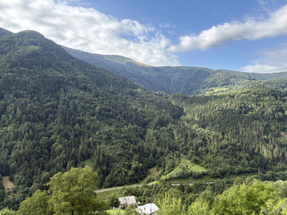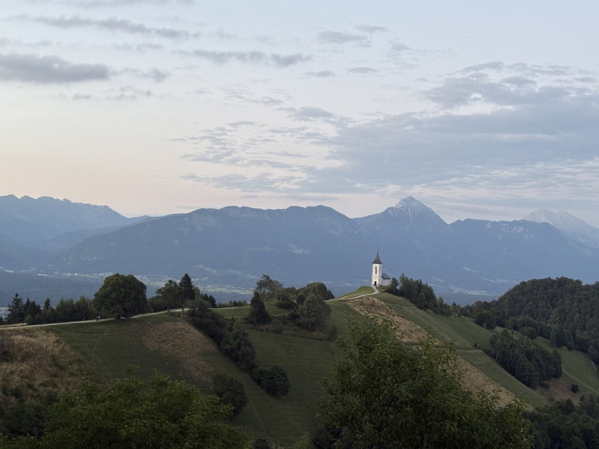 Do Podbrda jsme včera večer dorazili už za tmy, unavení, vyklikaní ze zatáček a bez představy, kde vlastně jsme. Ráno ale přichází odměna – z okna pokoje se otevírá výhled na Julské Alpy (pravděpodobně údolí Bača s okolními štíty). Ticho, svěží vzduch a hory jako kulisa. Ideální start, ale není čas se zdržovat – čeká nás nabitý den.