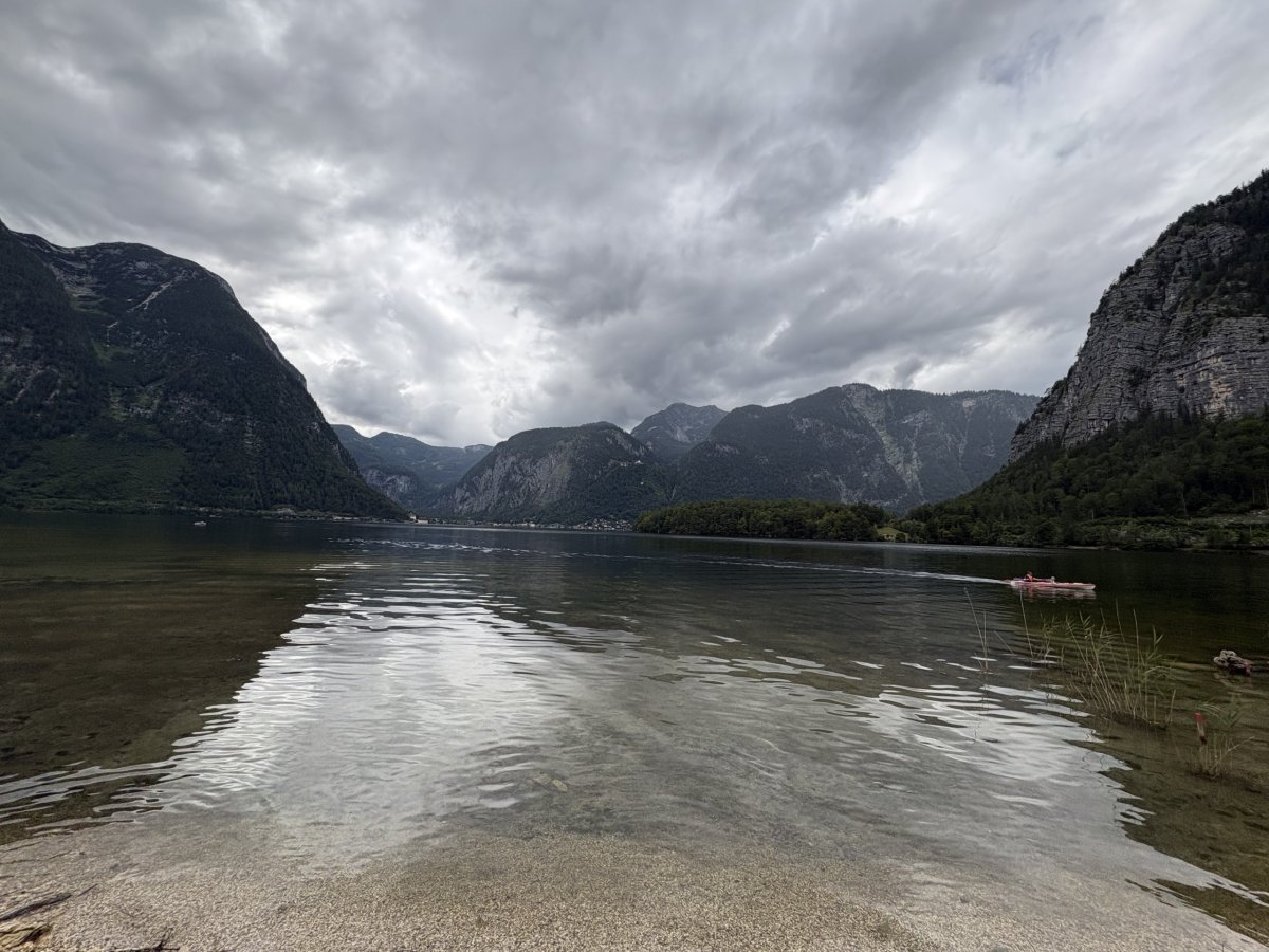 Dál míříme do Hallstattu. Ale… přecpané parkoviště, davy lidí, šílený provoz. Idylka na fotkách, realita o něco míň romantická. Rozhodujeme se nezdržovat a parkujeme o pár kilometrů dál v Obertraunu, kde je klid a dýchatelno. Sedíme u jezera, dáváme si hotdog a jen tak koukáme. Voda, ticho, normální tempo.