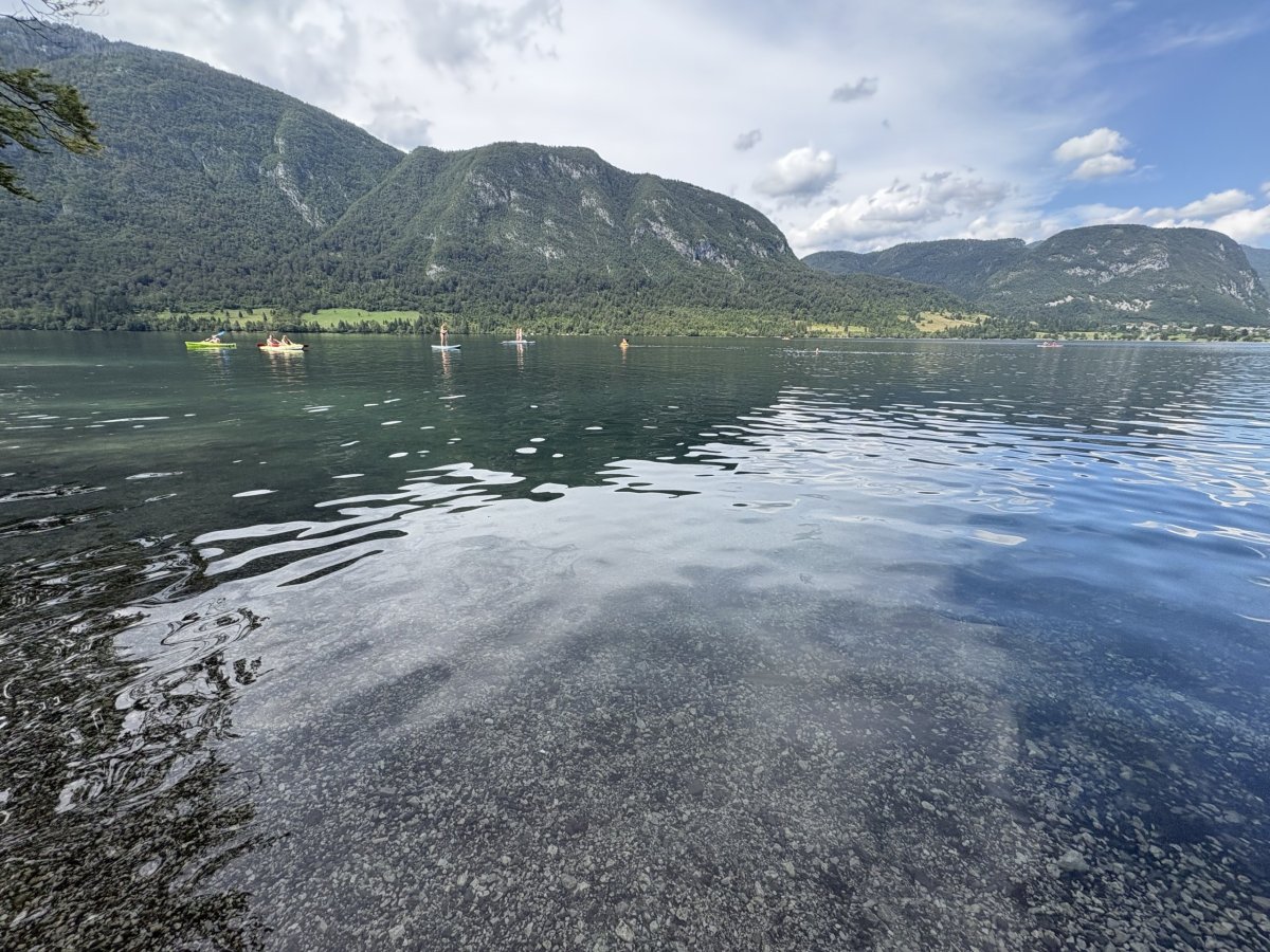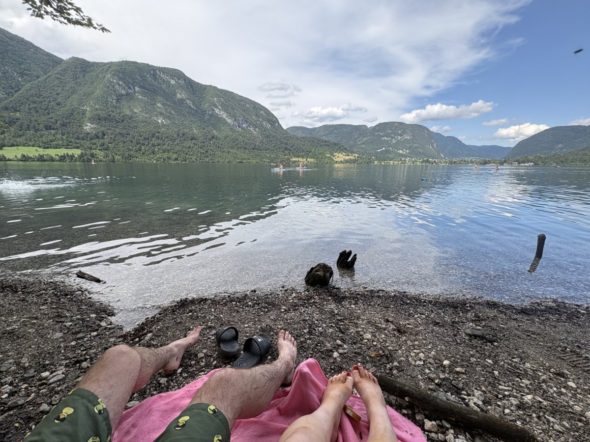 Přesouváme se proto dál – k jezeru Bohinj. Tady konečně přichází odpočinek, který si nikdo nevyčítá. Sedíme u vody, koupeme se, nohy v jezeře, hlava v oblacích. Všechno zpomalí. Žádný spěch, jen voda, hory a klid.