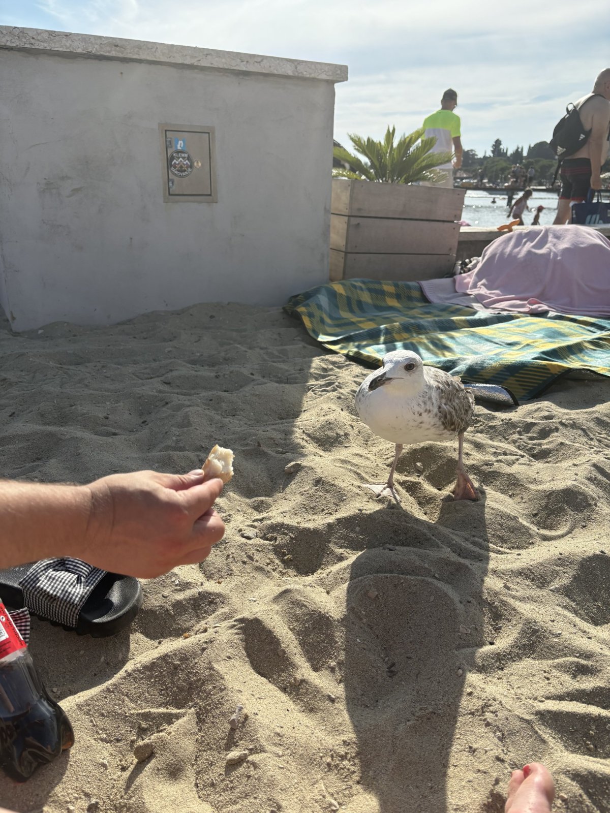 Během toho si ale nacházíme nečekaného společníka – racka. Nejprve se jen opatrně přibližuje, ale nakonec nám doslova žere z ruky. Bez přehánění – ochočíme si ho. Sedí metr od nás, sleduje každý náš pohyb a čeká, co zbyde z oběda. A my krmíme, smějeme se a možná si tu chvíli pamatujeme víc než tu pláž.