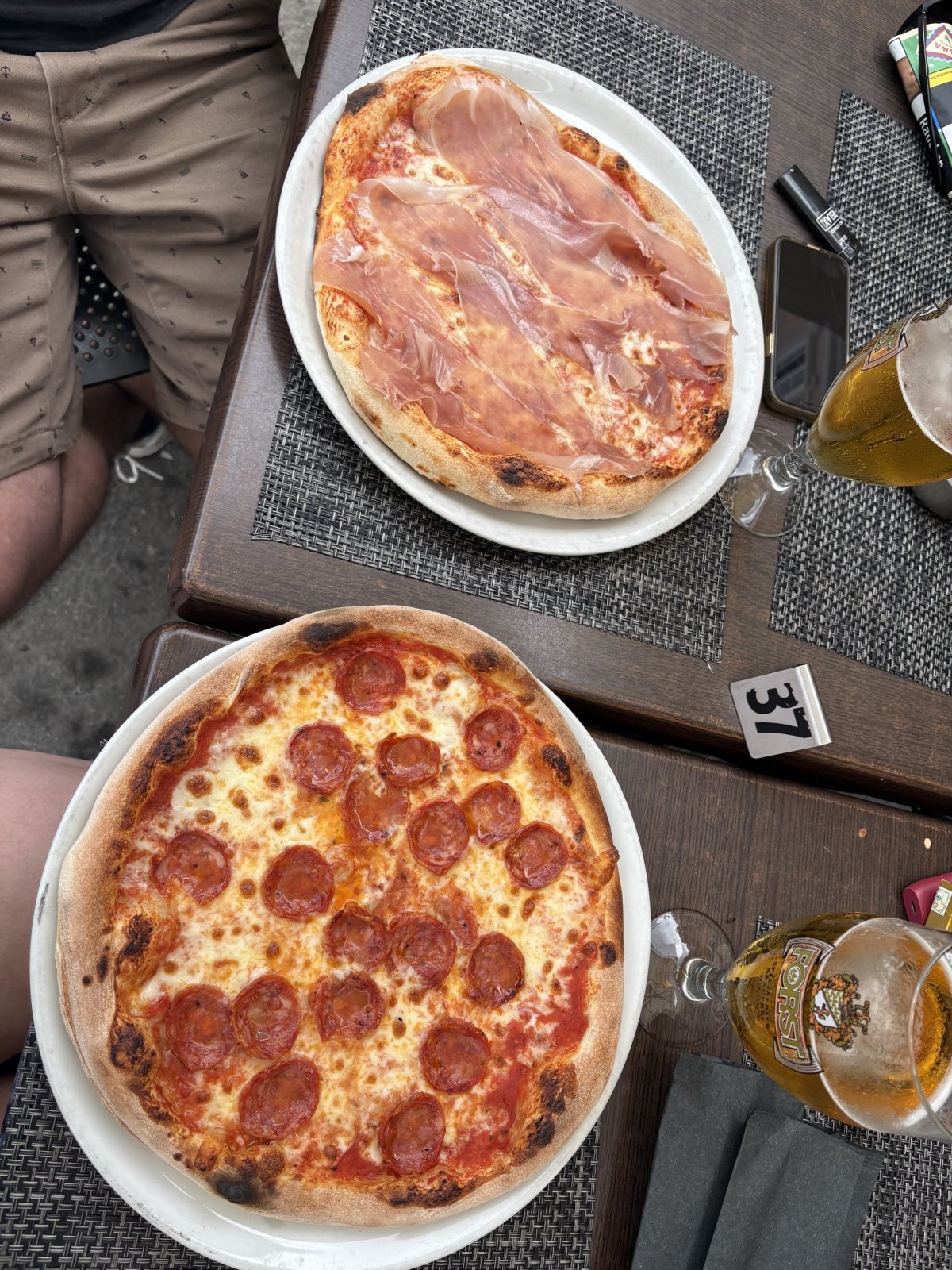 Dáváme si pizzu a chvíli jen tak sedíme. Moře v dálce, déšť už ustupuje. Po dni plném kontrastů – od deště po památník smrti – působí tenhle jednoduchý oběd jako návrat k normálnosti.