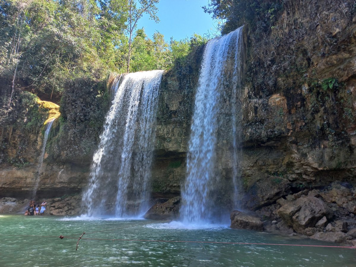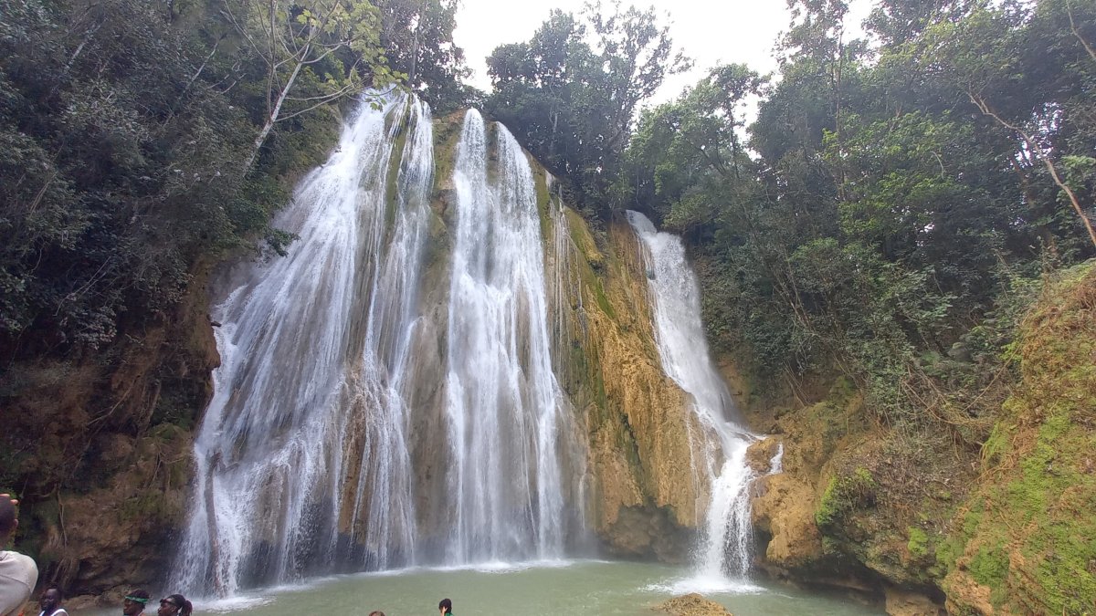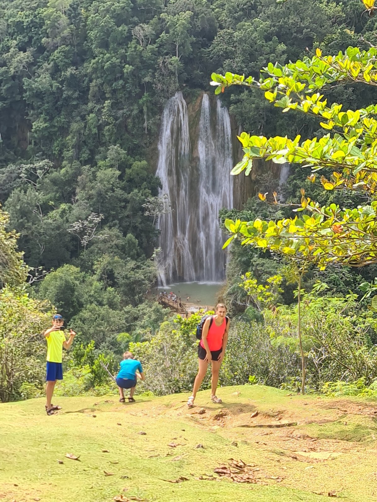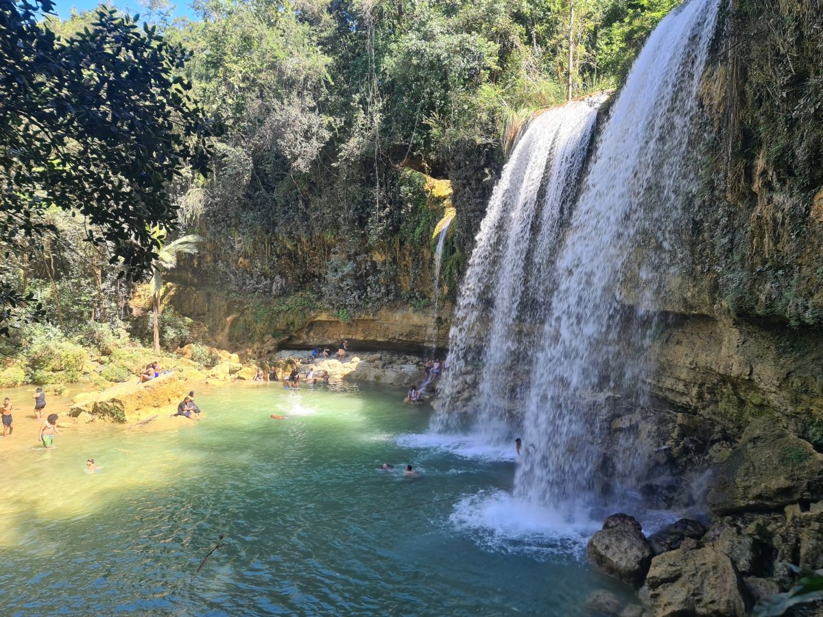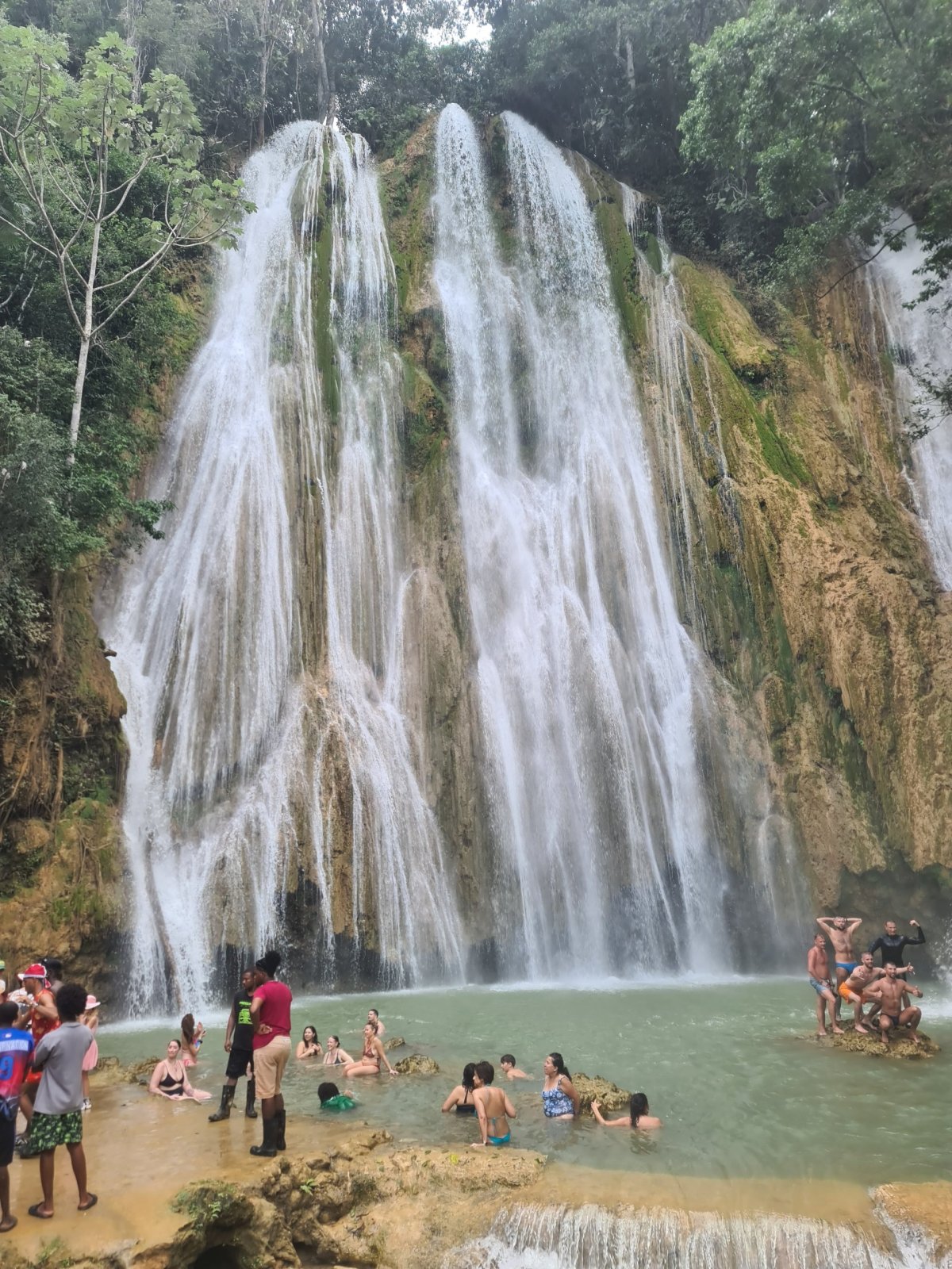 Parkoviště je nad hlavním vodopádem a zatím tu takhle po obědě nikdo moc není. Scházíme pár schodů a pak se nám rozvine vodopád v celé své kráse. Ač není nějak zvlášť vysoký (15 m), tak je opravdu krásný. Dá se tu koupat, voda je teplá, takže tu pěknou chvilku kempíme, ale po obědě začíná přibývat lidí, takže pak už přece jen pozice vyklízíme. Pokračujeme dál do naší další destinace – Nagua. Máme jet po dálnici, jejíž úsek má stát 200 DOP. To se snažíme ušetřit, ale naprosto to nemá smysl. Mýtnice je skoro až na konci na severu, takže i když něco málo objedete někde na jihu, je vám to málo platný a stejně těch 200 zaplatíte.