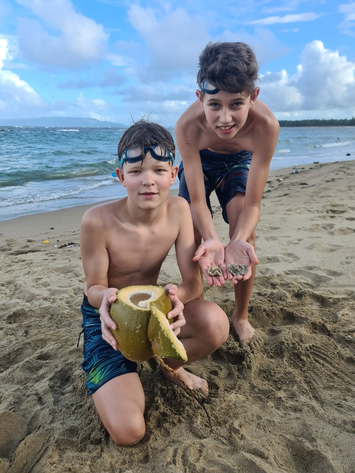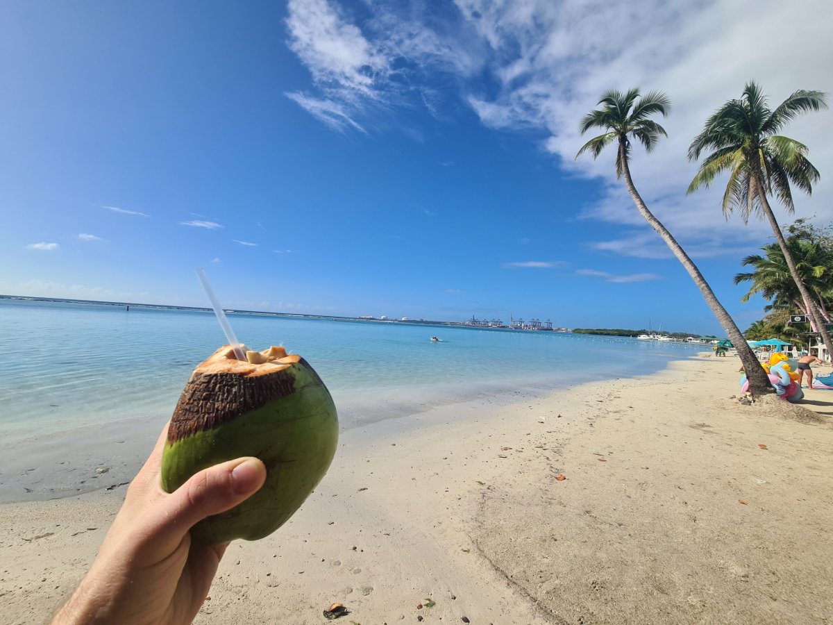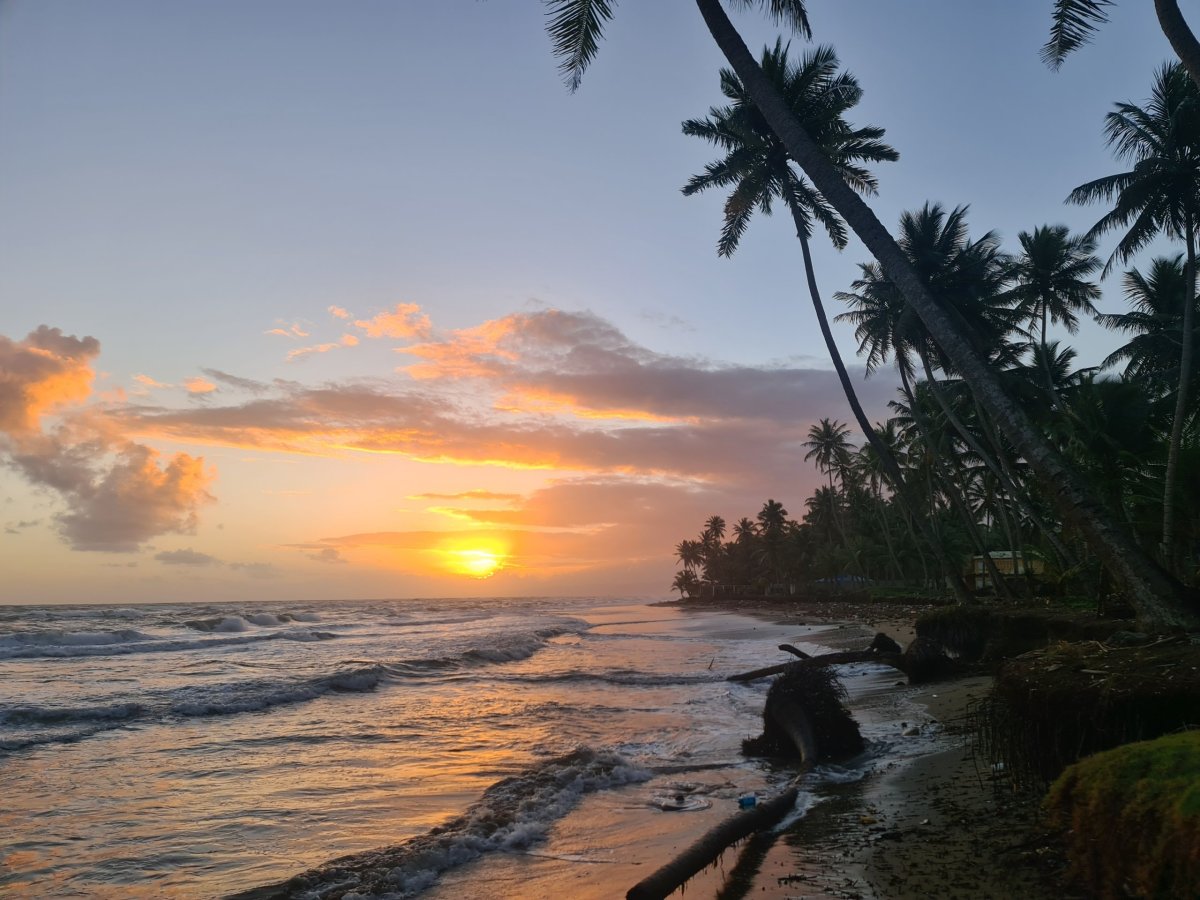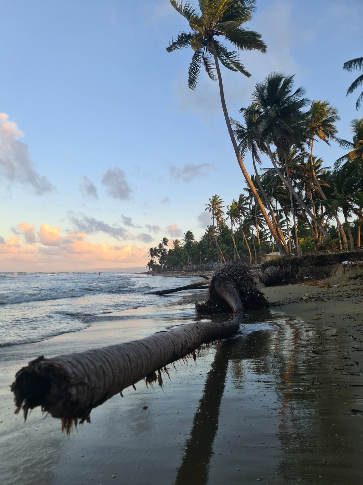 Jedem tedy zpátky do Nagua, kde máme svoje ubytování. Cestou, kousek od Nagua, se zastavujeme na pěkné pláži Pozo de Bojolo a užíváme si posledního denního sluníčka. Je tu spousta nízkých kokosových palem, takže trháme kokosy, mým speciálním švýcarským macgyverovským nástrojem je defloruju a vychutnáváme si lahodnou kokosovou vodu.