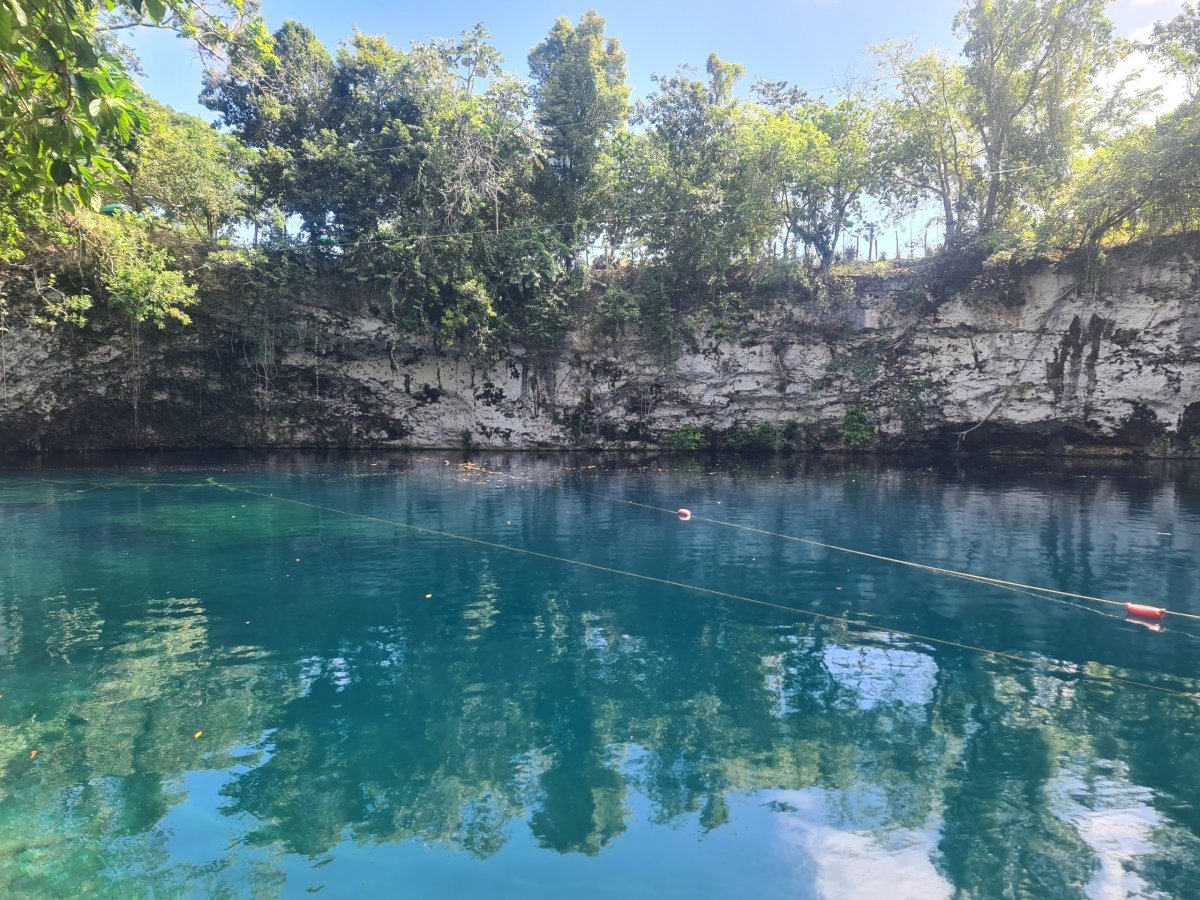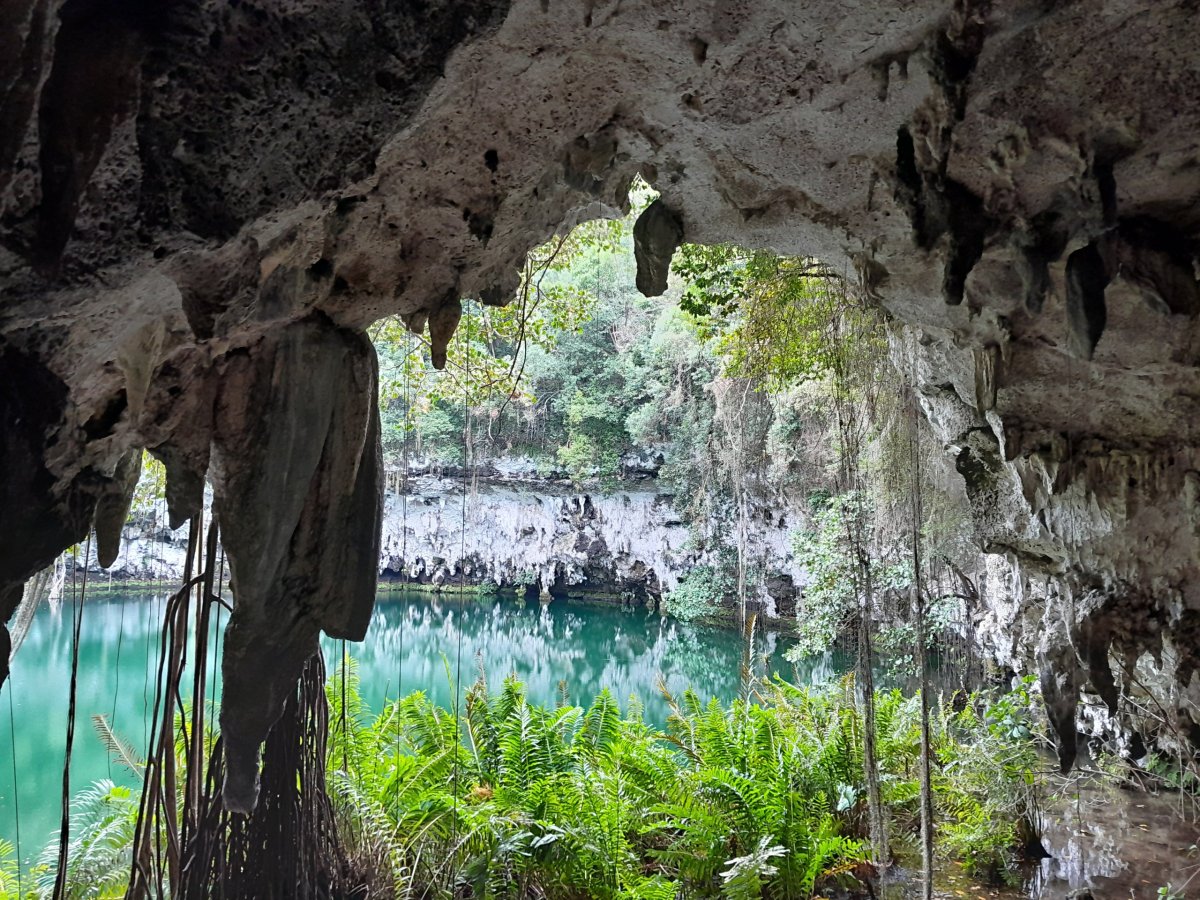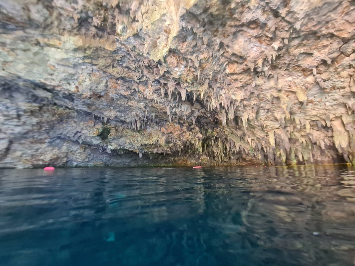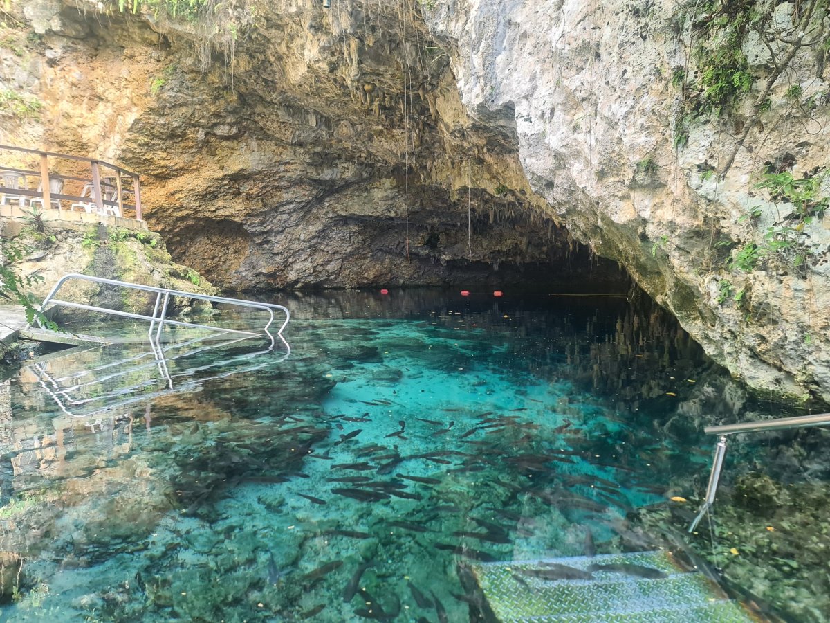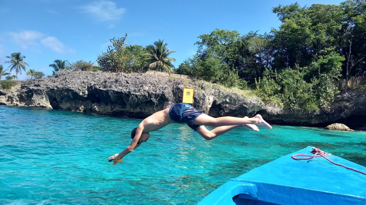 Bohužel nastává zádrhel. Mladší syn dostal teplotu a na nějaký delší výlet to s ním nevypadá. I takové situace dovolená přináší. Takže co teď? Naštěstí ubytování nabízí absolutní komfort a příležitost k odpočinku vedle bazénku, tak manželka zůstává s ním a my se starším synem vyrážíme autem na cca 30 km vzdálenou Lagunu Dudu. Jedná se v podstatě o jeskyně, jejichž strop se propadl, takže v současnosti jsou to spíše sladkovodní jezírka, ve který se projevuje i lehký prosak z moře, takže voda je lehce slaná. Dá se tu koupat, což nás láká nejvíce. Přijíždíme už kolem 9 ráno a jsme tu naprosto sami. Cena je 400 DOP na jednoho a využíváme koupání ve dvou jezírkách. To vzdálenější je lemováno pěkným jeskynním převisem s krápníky. Voda naprosto průzračná, když se potopíte vidíte desítky ryb. Natočili jsme si tu pár až kýčovitých videí a pak se přesouváme ke druhé, větší vodní ploše. Tu bych spíše přirovnal k naším zatopeným lomům, i tady je ale voda naprosto čistá a průzračná. Nad jezerem vede dokonce napnuté lano, dá se z vrchu jet na lanovce a pak z dobrých 15 metrů skočit do jezera. Já k tomu odvahu nenašel a nakonec jsem neukecal ani synátora. Nicméně jeden pěkný jump jsme před odchodem viděli. Součástí komplexu je i jedna menší přístupná jeskyně, kam se dá vlézt. Dobrý je ale aspoň světlo na mobilu, ať člověk ví kam šlape.