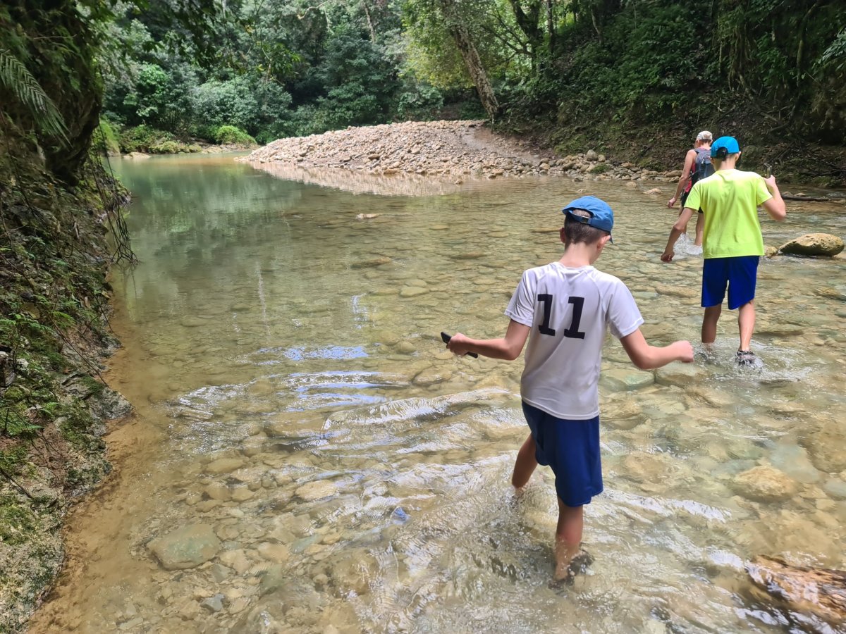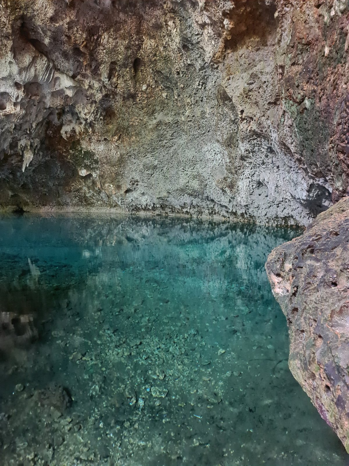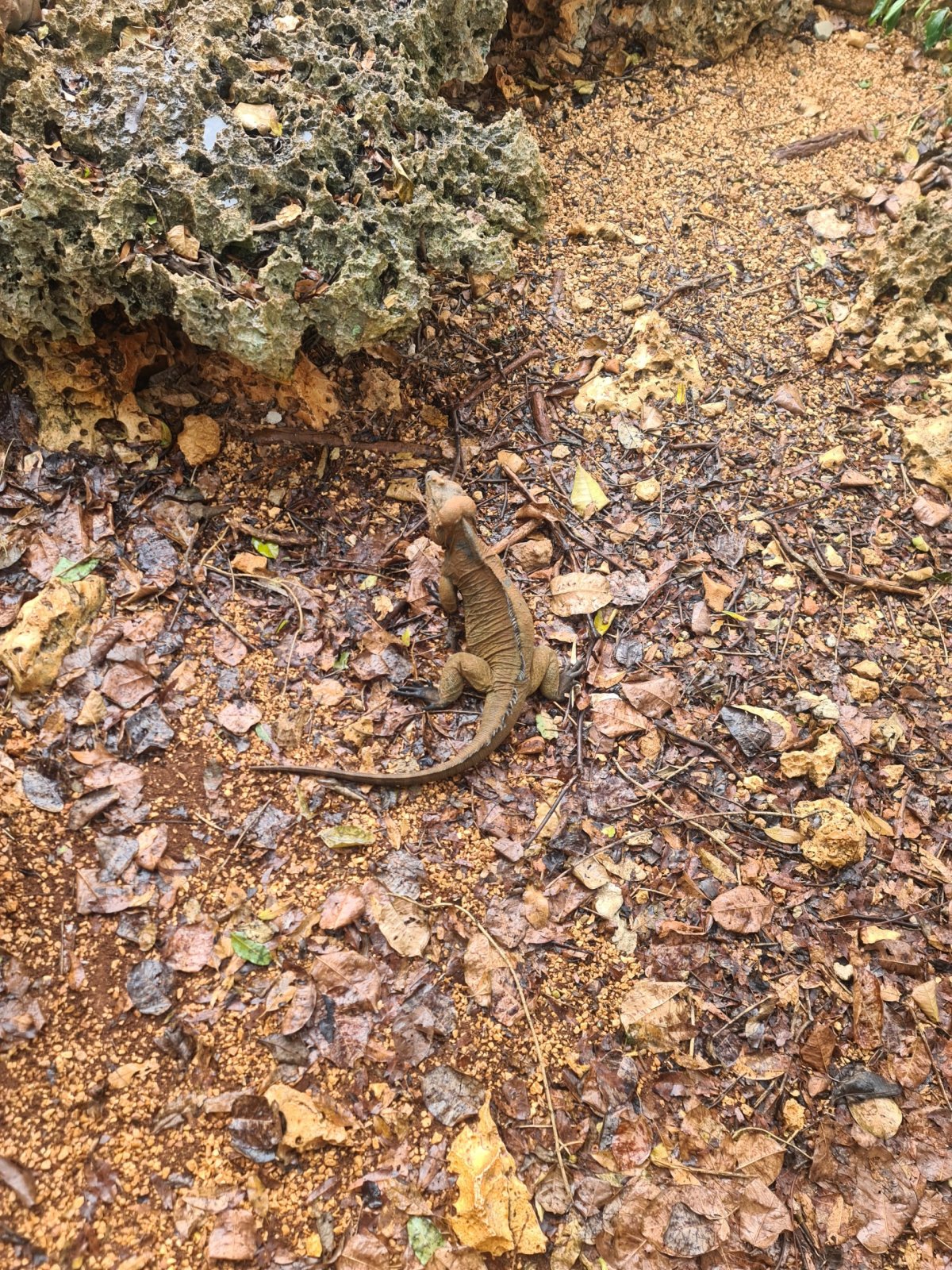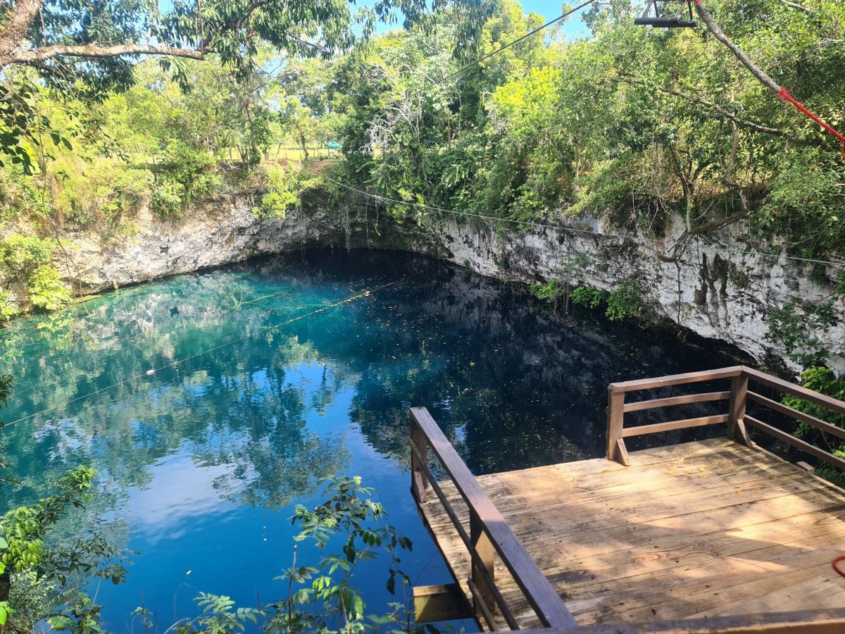 Bohužel nastává zádrhel. Mladší syn dostal teplotu a na nějaký delší výlet to s ním nevypadá. I takové situace dovolená přináší. Takže co teď? Naštěstí ubytování nabízí absolutní komfort a příležitost k odpočinku vedle bazénku, tak manželka zůstává s ním a my se starším synem vyrážíme autem na cca 30 km vzdálenou Lagunu Dudu. Jedná se v podstatě o jeskyně, jejichž strop se propadl, takže v současnosti jsou to spíše sladkovodní jezírka, ve který se projevuje i lehký prosak z moře, takže voda je lehce slaná. Dá se tu koupat, což nás láká nejvíce. Přijíždíme už kolem 9 ráno a jsme tu naprosto sami. Cena je 400 DOP na jednoho a využíváme koupání ve dvou jezírkách. To vzdálenější je lemováno pěkným jeskynním převisem s krápníky. Voda naprosto průzračná, když se potopíte vidíte desítky ryb. Natočili jsme si tu pár až kýčovitých videí a pak se přesouváme ke druhé, větší vodní ploše. Tu bych spíše přirovnal k naším zatopeným lomům, i tady je ale voda naprosto čistá a průzračná. Nad jezerem vede dokonce napnuté lano, dá se z vrchu jet na lanovce a pak z dobrých 15 metrů skočit do jezera. Já k tomu odvahu nenašel a nakonec jsem neukecal ani synátora. Nicméně jeden pěkný jump jsme před odchodem viděli. Součástí komplexu je i jedna menší přístupná jeskyně, kam se dá vlézt. Dobrý je ale aspoň světlo na mobilu, ať člověk ví kam šlape.