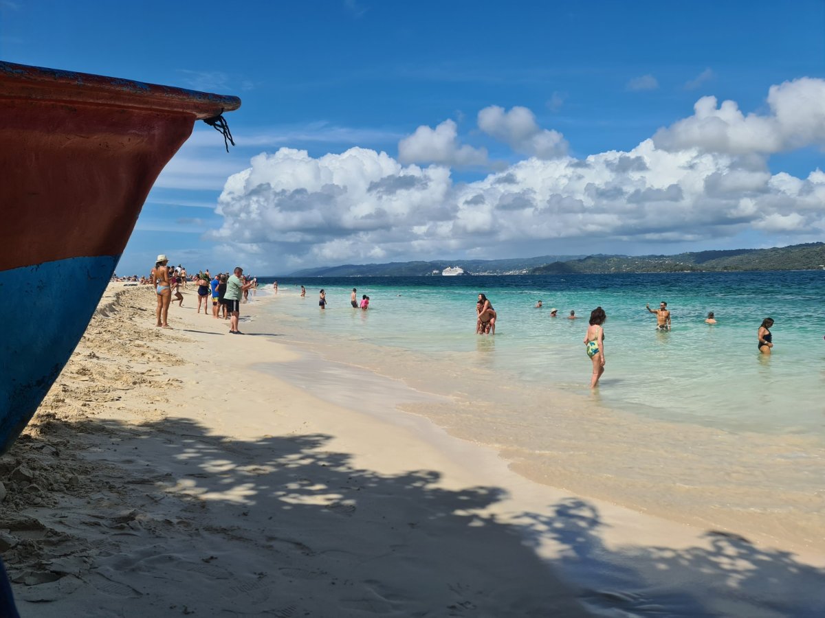 Trvá to tak půl hodiny, než se dostaneme ven na volnější moře a pak už začíná honba za velrybami. Je to takové zvláštní pozorování – pokaždé, když se někde mihne nějaká velryba, člun nabere rychlost a valí tam a snaží se okolo velryb plout. Já teda být velrybou, tak se ponořím do hlubin a na nějaký lodě hodím z vysoka víte co, ale přece jen máme chvilkama štěstí a daří se nám nějaké velryby vidět. Občas se objeví i obligátní vyfukovaný vzduch s vodou a sem tam vidíme i ocasní ploutev, jak se noří do vody. Že by to ale byly nějaké zvláštní žně a velryby nám žraly z ruky, tak to zase ne. Manželku to trochu zklamalo, mě ani moc ne. Až na tu mořskou nemoc, kterou jsem za ty 2 hodiny už pěkně cítil. Přece jen se moře dost vlní a loď je jen malá hříčka na jeho vodách. Naštěstí už nabíráme zpáteční směr. Jaké je naše překvapení, když se zastavujeme i u ostrova Cayo Levantado a prý tu má být i oběd a budeme tu až do 15 hodin. Jsme trošku zmatení, nic takového jsme si neobjednali a nezaplatili, ale oběd čeká i na nás. Asi se to moc neřeší, myslím si, že většina těch, co byli s námi v lodi, platila mnohonásobně více než 65 USD a berou to tak, že stejně na tom něco vydělají a náklady se vykryjí těmi, kteří je hodně přeplatili. Takže máme docela štěstí. Proto opět platí – nenechte se odradit, smlouvejte a odmítejte. Nakonec se odjezd z ostrova Cayo Levantado, kde se točila i známá reklama na Bacardi, posouvá až na 16 hodinu. Nelitujeme toho, pláž je úžasná, stejně tak, jako koupání, a tak si tu dáváme Pina coladu a nějaké další místní šlágry. Prostě pohoda.