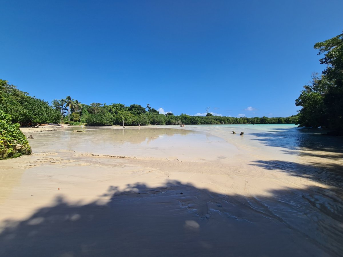 Vracíme se zpátky na východ od Nagua a jedeme směrem na Samana. Ale jedeme severní cestou poloostrova, což je i zpoplatněná dálnice. No dálnice. U nás tak možná silnice II. třídy, každopádně tady je zpoplatněná za 400 DOP. To není nějaká závratná suma, takže to člověk ani nijak neřeší. Zastavujeme se ještě na krásných plážích u El Portilla, určitě stojí za návštěvu. Do moře tu ústí nějaká menší říčka, takže tu vytváří deltu a slaná voda se tu míchá se sladkou. Navíc je tady naprostý minimum lidí, takže si člověk užije i chvilku klidu.