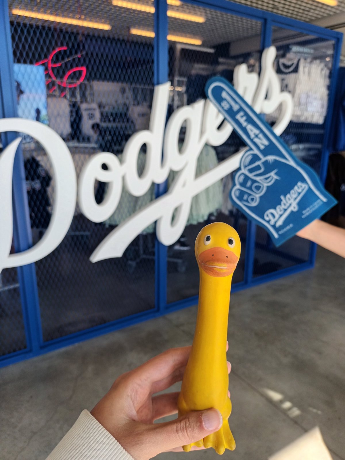 Po vyzvednutí auta na parkovišti jsme pokračovali ještě k nedalekému stadionu Dodger Stadium, který je základnou místního baseballového týmu Los Angeles Dodgers ⚾ Pokud se v daný den nehraje zápas, je možné autem dojet až přímo před stadion a navštívit fanshop – u hlavního vjezdu (Gate A) stačí nahlásit, že chcete do „team store“ nebo „fanshop“ a obdržíte instrukce, kudy kam.