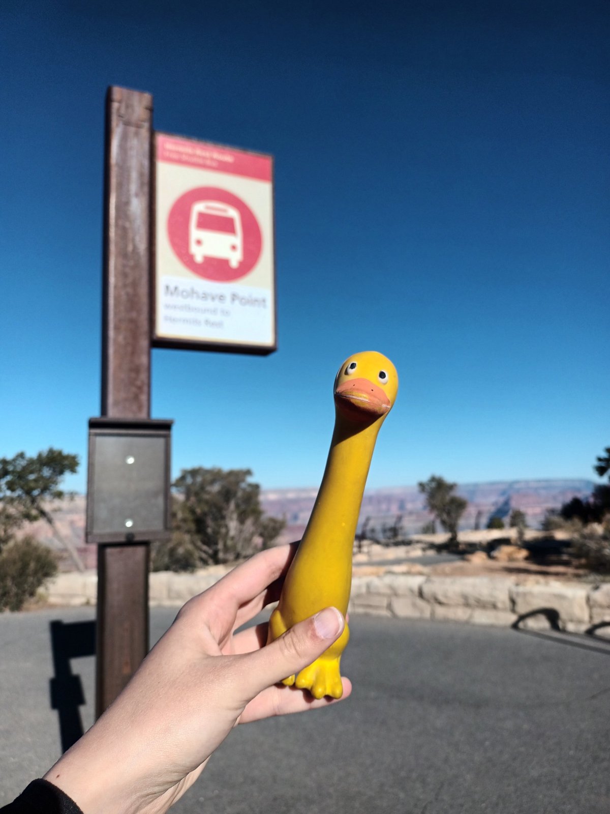 Po východu slunce na Yavapai Point jsme vyrazili pěšky po nenáročné stezce Rim Trail podél kaňonu západním směrem až na Mojave Point, kde jsme si počkali na první ranní autobus červené linky. Tím jsme se nechali odvézt až na Hermits Rest a zpět do Grand Canyon Village. Tuto západní část parku jsme zařadili na časné ráno kvůli obavám z velkých front na autobus, které se začínají tvořit už v průběhu dopoledne. Už při návratu jsme poznali, že obavy to byly oprávněné.. fronty turistů a nadšených pochodníků se táhly jako hadi mezi autobusovými zastávkami 🚍🚏 Nezbylo než se zařadit a čekat.. cca po 40 min jsme se konečně vešli do autobusu oranžové linky a zamířili na South Kaibab Trailhead – začátek naší vybrané trasy skrze velký kaňon.